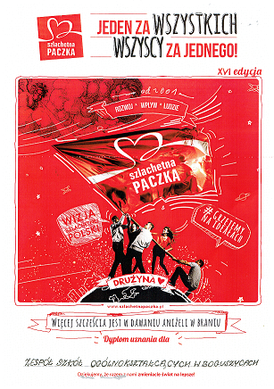 Już po raz kolejny nasza szkoła włączyła się w akcję Szlachetna Paczka. W tym roku zbieraliśmy żywność, środki chemiczne, odzież oraz pieniążki na zakup łóżka dziecięcego. Dzięki ogromnemu zaangażowaniu rodziców i uczniów, podobnie jak w latach ubiegłych w 100 % udało nam się zrealizować marzenia i zaspokoić potrzeby wybranej rodziny.