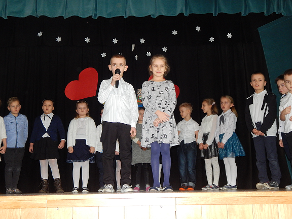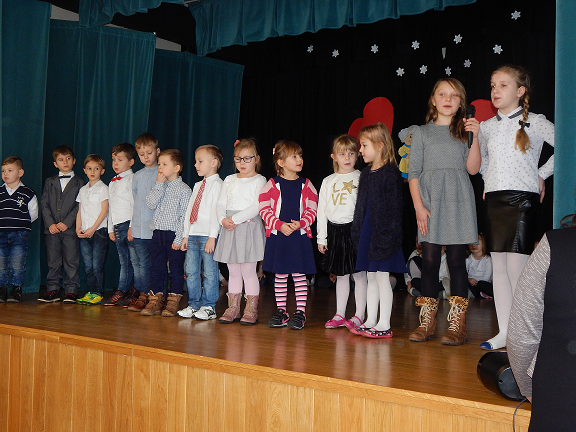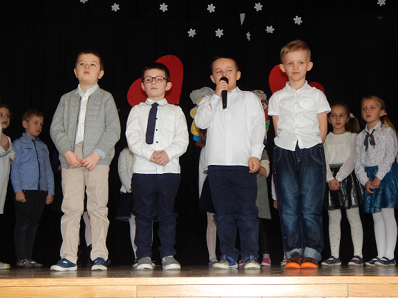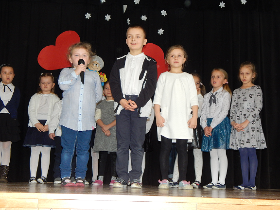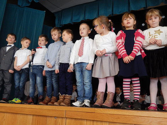 Występ rozpoczęły dzieci z grupy 0 A, które zaprezentowały wiersze i piosenki oraz zatańczyły "Poleczkę". Następnie wystąpiły dzieci z grupy O B recytując wiersze i śpiewając piosenki.