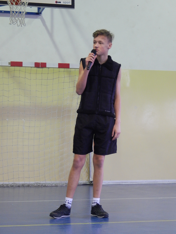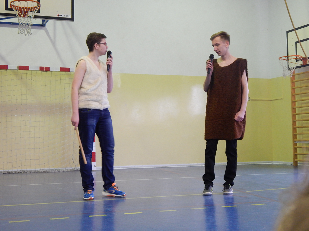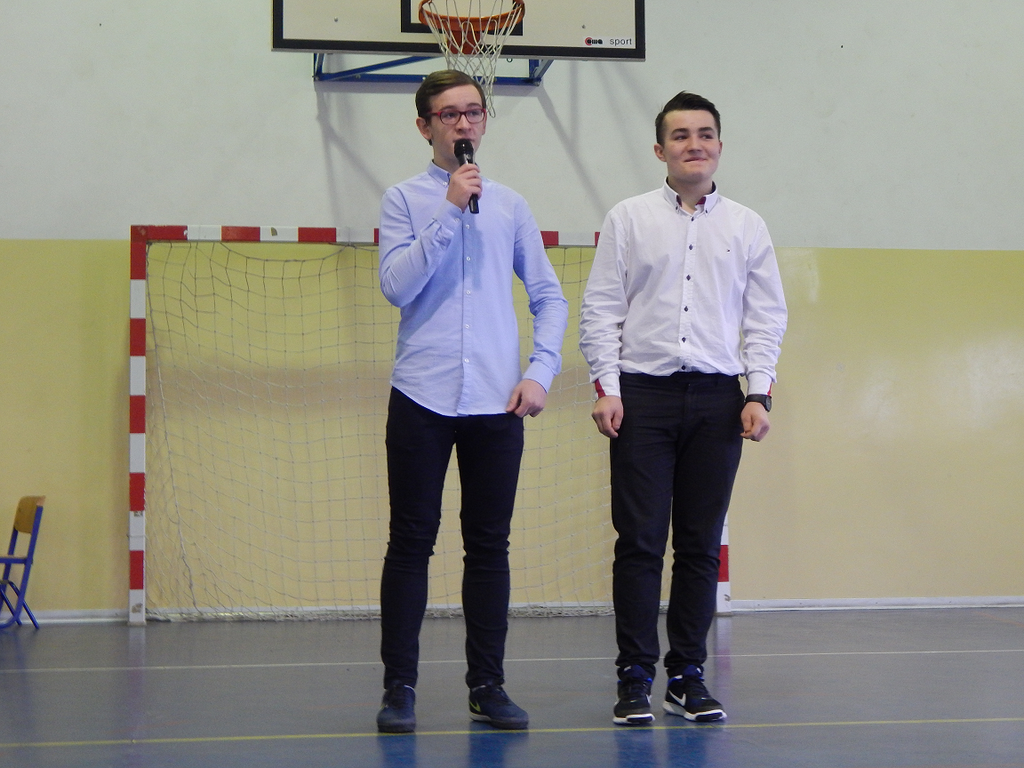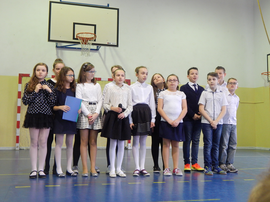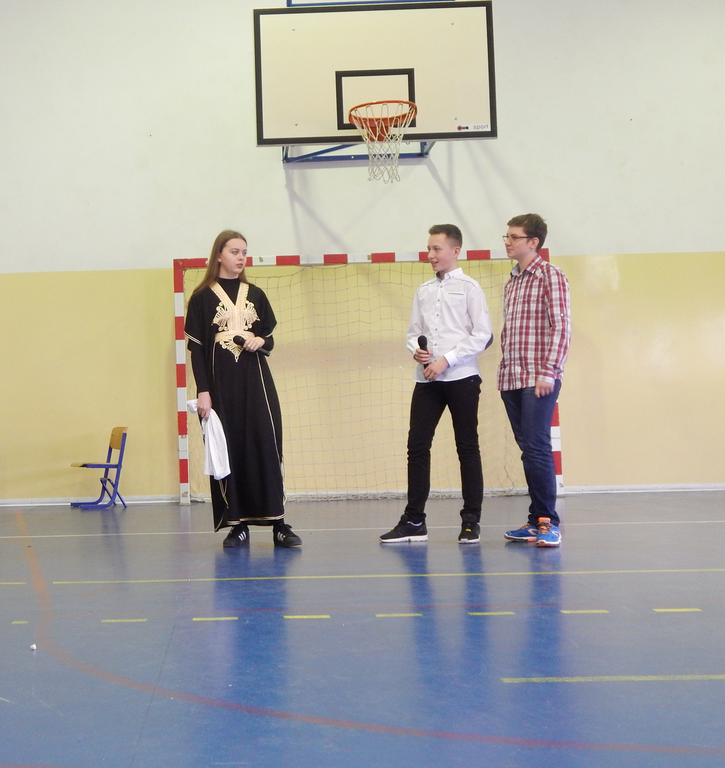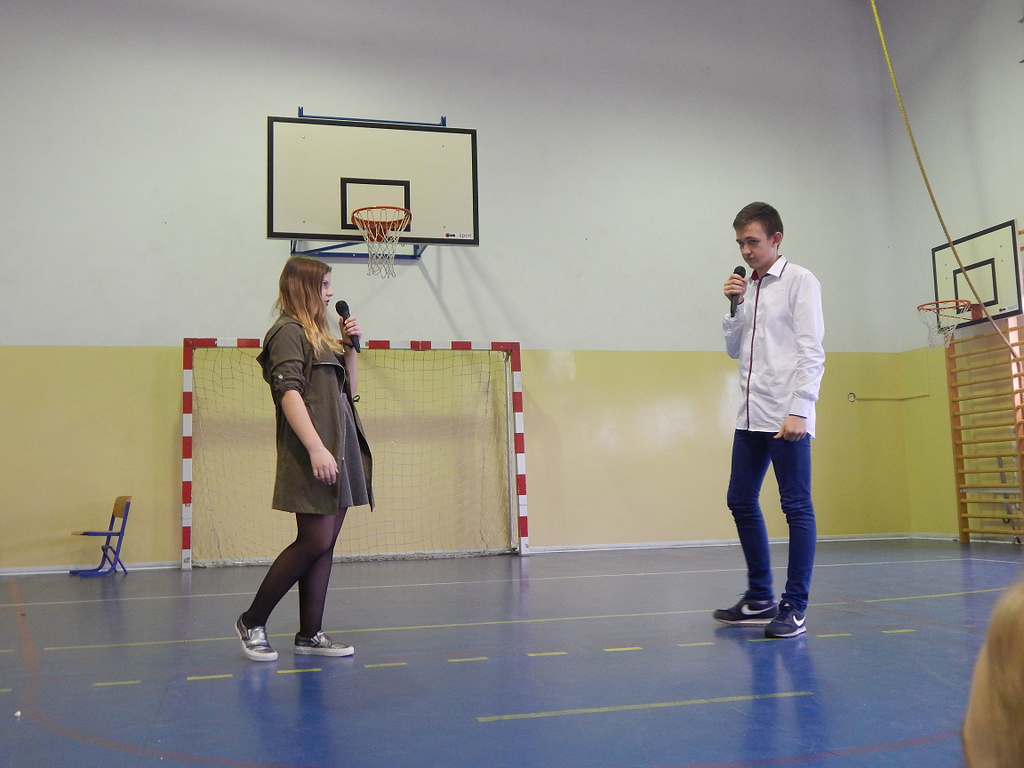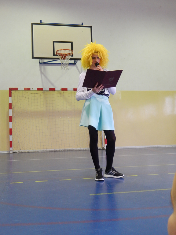 Następnie publiczność obejrzała humorystyczne przedstawienie w wykonaniu chłopców klasy II i III gimnazjum, przygotowanych pod czujnym okiem p. Zbigniewa Stępniaka. Występ wzbogacili także uczniowie klasy czwartej, którzy recytowali wiersze oraz zaprezentowali się w układzie tanecznym.