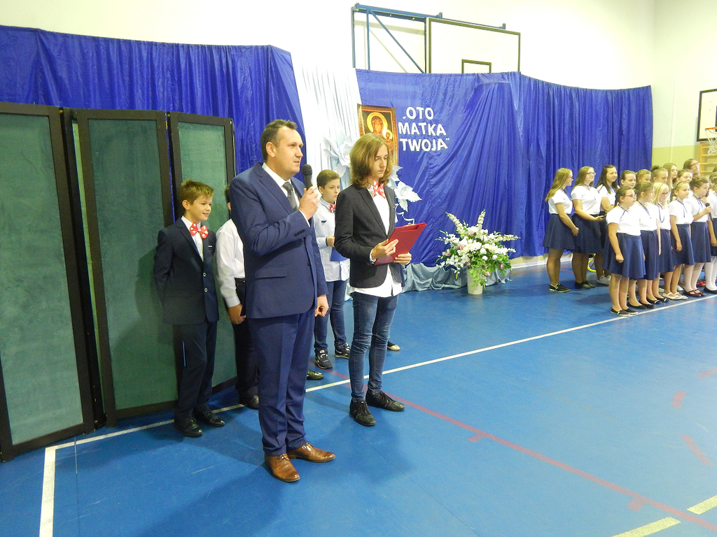 Następnie mowę powitalną wygłosił p. dyrektor Mariusz Muszyński, przewodnicząca Rady Rodziców - p. Anna Śliwka oraz przedstawiciel uczniów - Alan Bieliński.