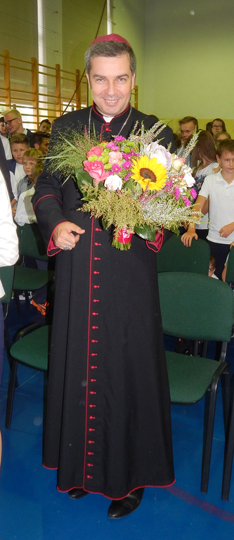 Dnia 20 września odwiedził naszą szkołę biskup pomocniczy Diecezji Łowickiej ks. Wojciech Osial. Całą społeczność szkolna zebrała się na sali gimnastycznej przywitała gościa pieśnią "Bądź pozdrowiony Gościu nasz".