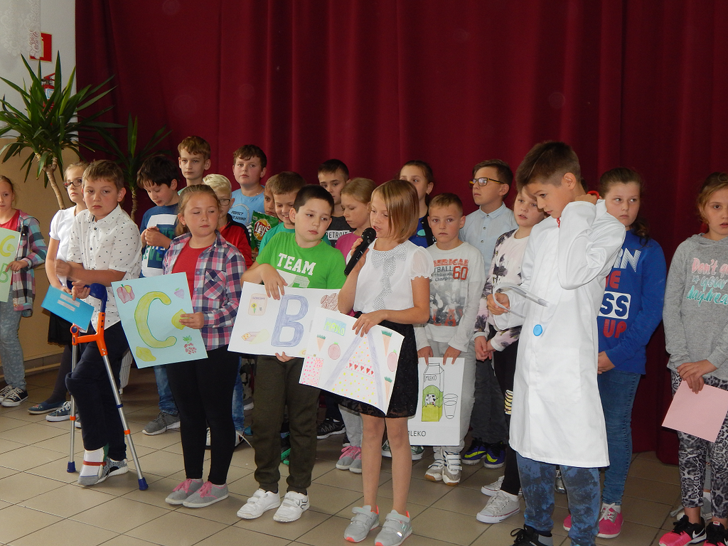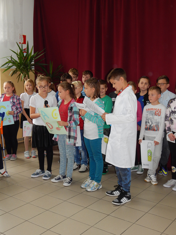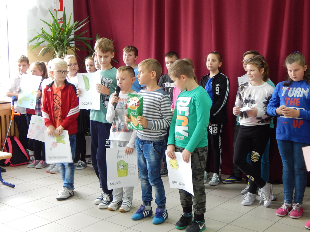 W pierwszej kolejności uczniowie klas IVa i IVb zaprezentowali przedstawienie "Chcesz być zdrowy jak ryba - jedź owoce i warzywa! ", zachęcające do zdrowego trybu życia, a w szczególności do tego, aby prawidłowo się odżywiać, czyli jeść dużo owoców i warzyw, które są źródłem cennych witamin.