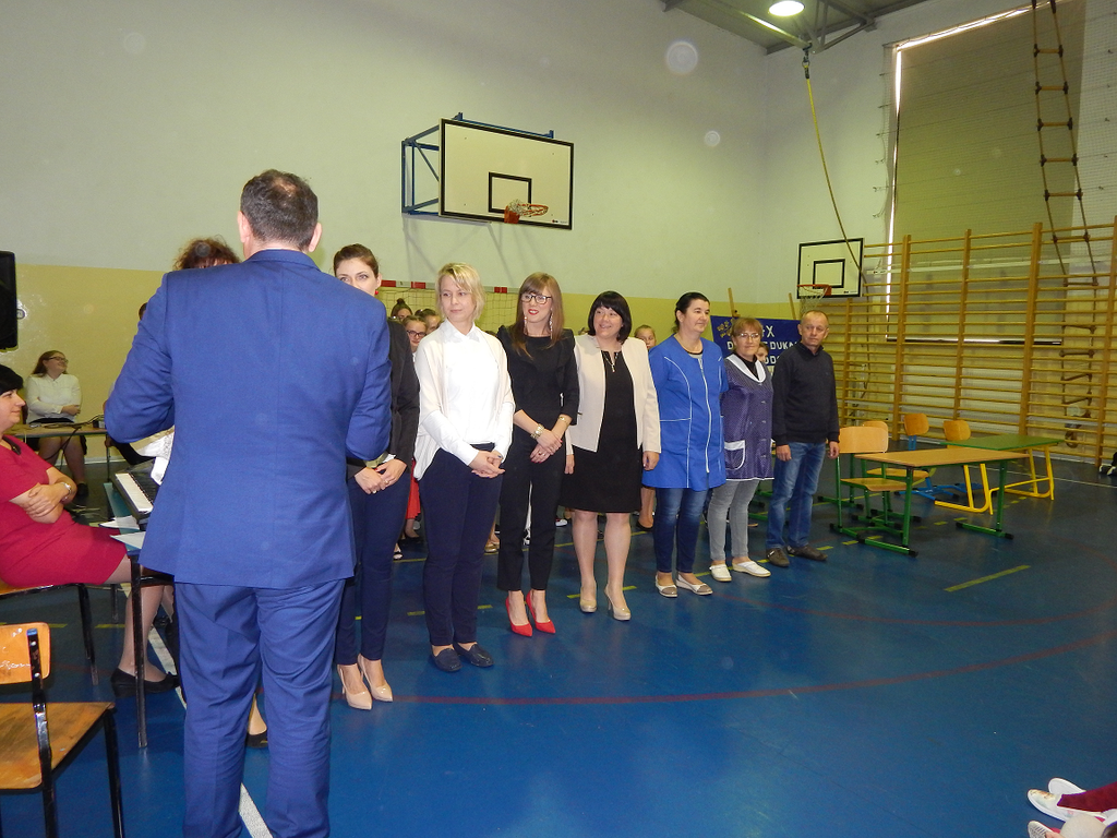 Uroczystość rozpoczął dyrektor p. Mariusz Muszyński, który złożył życzenia wszystkim pracownikom szkoły, podziękował za trud włożony każdego dnia w kształcenie i wychowanie młodych pokoleń oraz wręczył Nagrody Dyrektora. Uhonorowani zostali: p. Elżbieta Manowiecka, p. Monika Gierach, p. Agnieszka Galach, p. Kamila Stańdo, p. Dorota Supeł, p. Dorota Bajan, p. Izabela Goździk, p. Jadwiga Czernek, p. Zofia Rosa oraz p. Bogdan Trębacz.