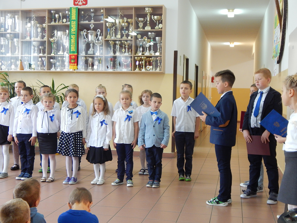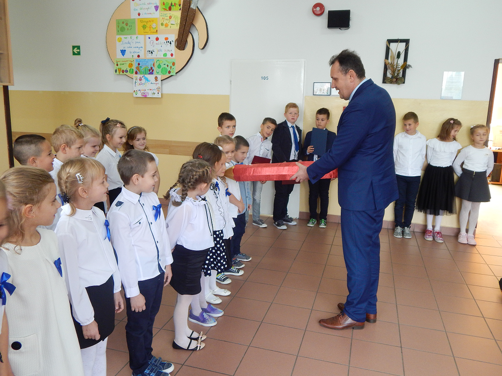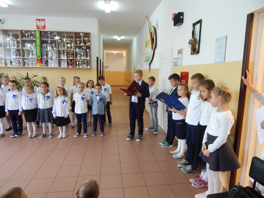 Uroczystość ślubowania odbyła się na korytarzu szkolnym, który na ten dzień przybrał odświętny wygląd. Tego dnia uczniowie przybyli do szkoły w strojach galowych. Nie zabrakło też gości, byli rodzice uczniowie klas 0-III wraz z wychowawcami. Na początek Dyrektor Szkoły Pan Mariusz Muszyński skierował do uczniów ciepłe słowa, witając ich wśród braci uczniowskiej. Następnie uczniowie zaprezentowali swój program artystyczny. Mimo dużej tremy wszystko wypadło znakomicie. Kulminacyjnym punktem było uroczyste ślubowanie na sztandar szkoły.