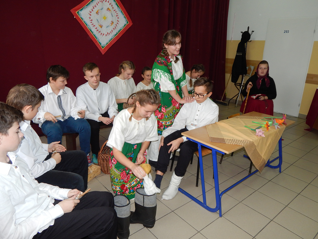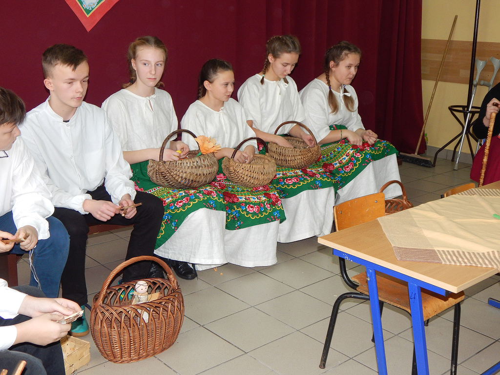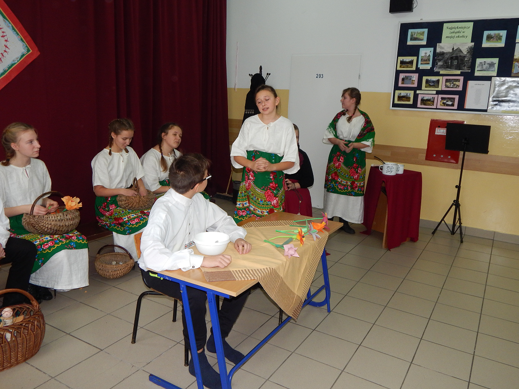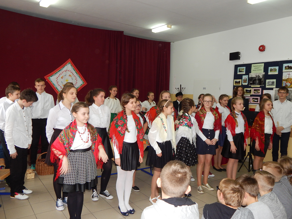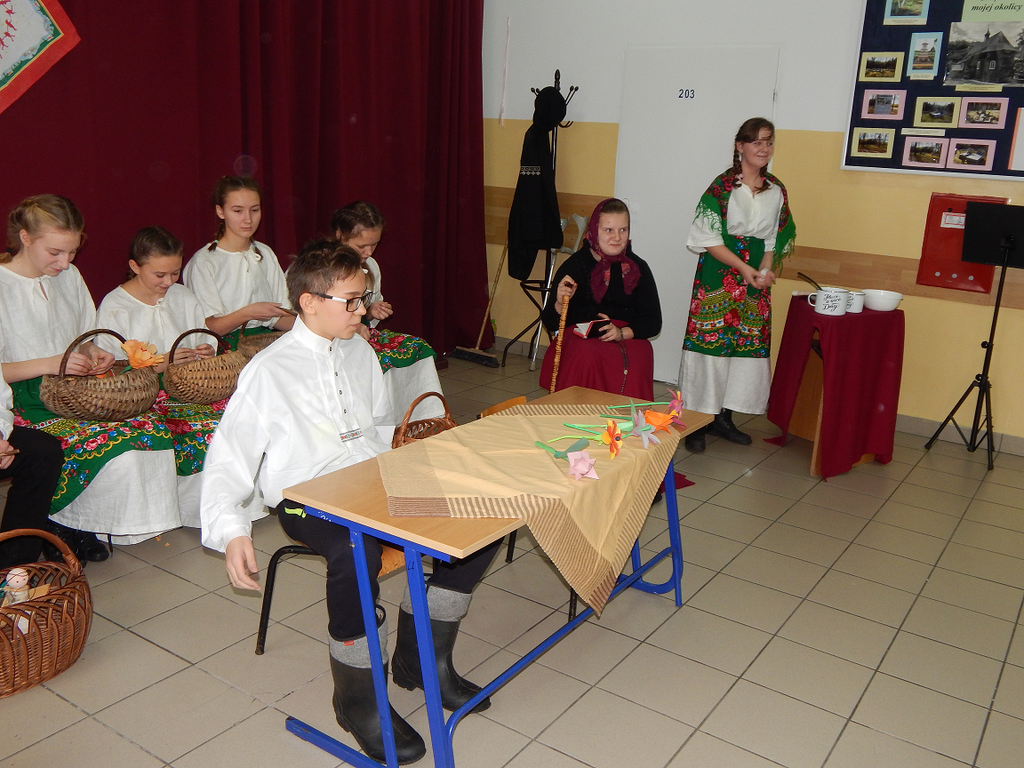 Szkolny zespół ludowy (grupa teatralna), w skład którego wchodzą uczniowie klasy VII wprowadził obecnych w nastrój adwentowy. Mogliśmy zobaczyć, jak ludzie w dawnych czasach przygotowywali się do świąt Bożego Narodzenia. Aktorzy prezentowali swoje role językiem gwarowym. Przedstawienie rozpoczęła grupa wokalna pastorałką "Na choinie syski" i zakończyła kolędą "Archanioł Boży Gabriel".