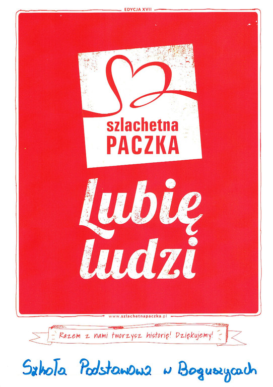 Szkoła w Boguszycach kolejny raz intensywnie włączyła się w akcję Szlachetna Paczka. Efekt przerósł nasze najśmielsze oczekiwanie. Uczniowie dostarczyli do szkoły ogromną ilość artykułów spożywczych i środków czystości, a także gry i przybory szkolne. Na terenie szkoły do puszek zebrano 879 zł 65 gr. Pieniążki zostały przeznaczone na zakup: kurtek, butów, koca, kołdry, poduszki, pościeli, odzieży, rolek oraz mikrofali.