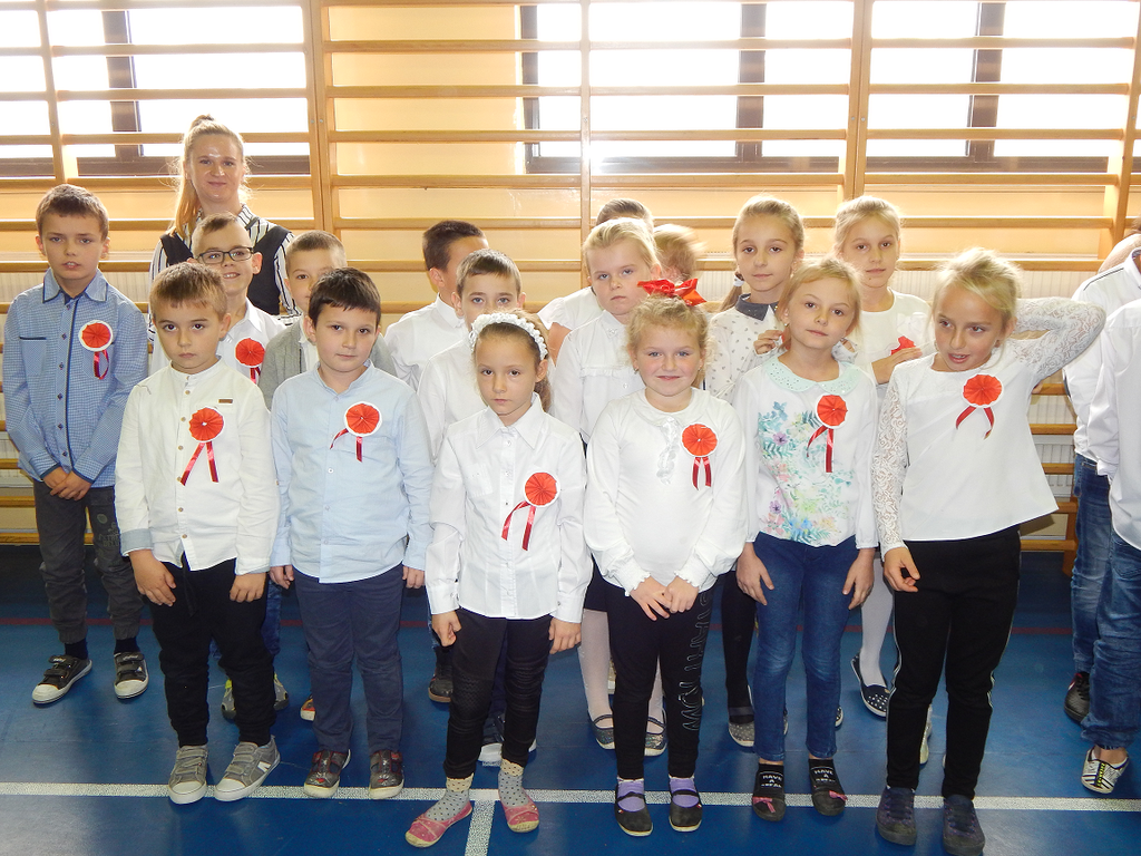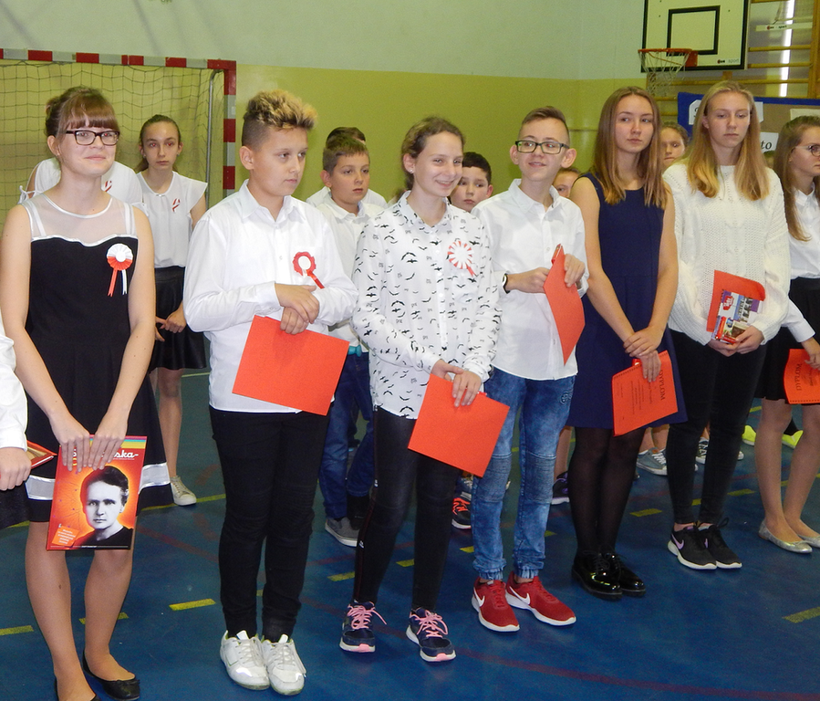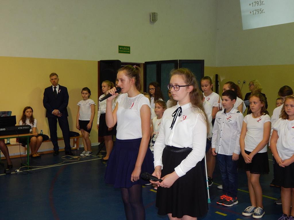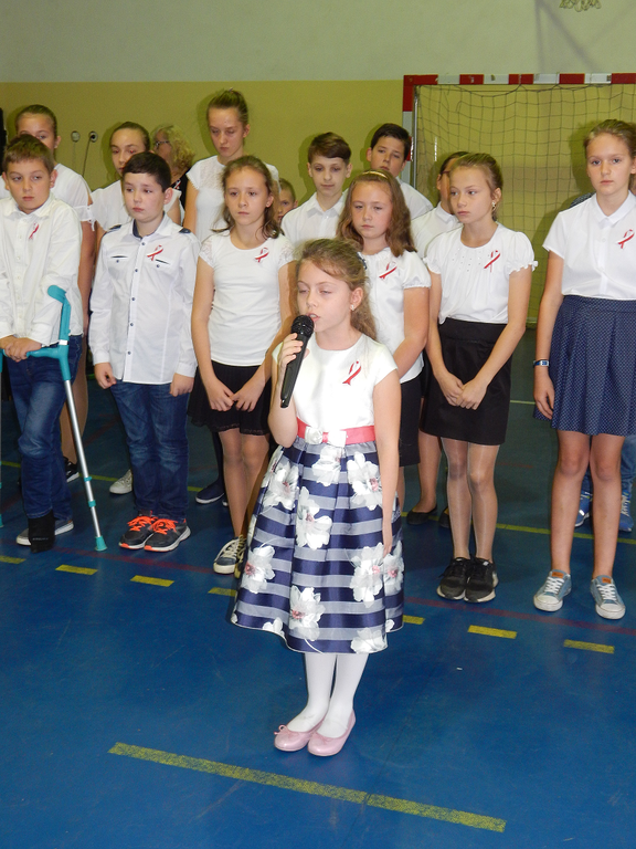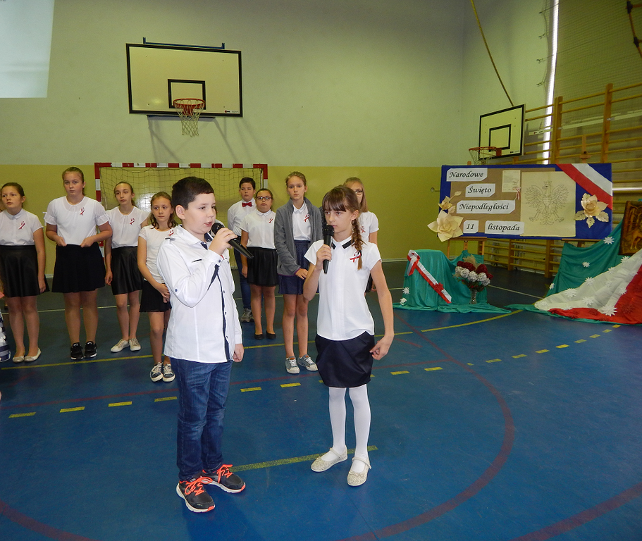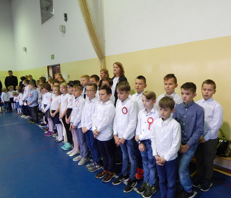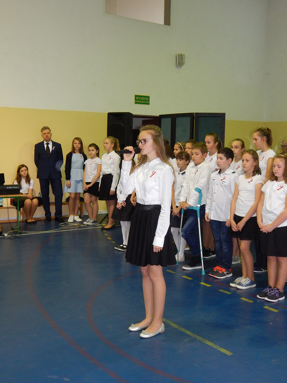 Następnie w tle rozbrzmiały słowa piosenki "Żeby Polska była Polską" i tak rozpoczął się występ artystyczny szkolnego koła teatralnego i chóru. "Żeby Polska była Polską przez 123 lata niewoli walczyły całe pokolenia Polaków. To im od 11 listopada 1918 roku zawdzięczamy wolność, poczucie dumy narodowej, możliwość pielęgnowania polskich tradycji oraz honorowania bohaterów. Dziś ojczyzna oczekuje od nas tego, co najważniejsze - pamięci o jej wielkich synach i miłości do ziemi ojczystej" - recytowała jedna z uczennic. Przedstawienie zakończyło się słowami: "My mamy dziś szczęście dorastać w wolnym kraju. Pamiętamy jednak o tym, że przodkom winniśmy pamięć, a ojczyźnie - miłość".
