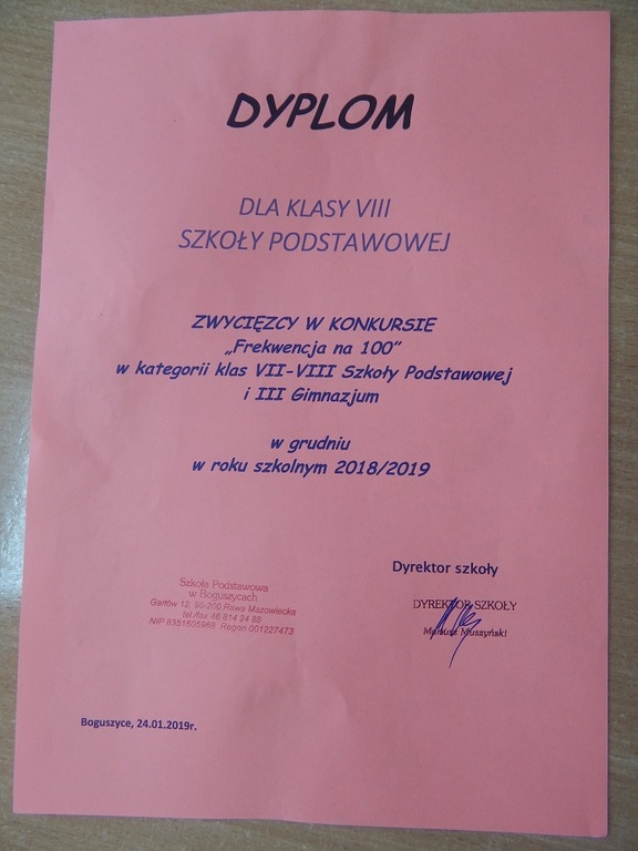 Każdego miesiąca monitorujemy frekwencję naszych uczniów, którzy uczestniczą w konkursie "Frekwencja na 100%". Dzięki temu uczniowie systematycznie uczęszczają do szkoły i starają się opuszczać jak najmniej godzin lekcyjnych. Nagrodzone klasy za miesiąc grudzień to: