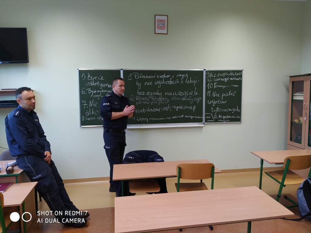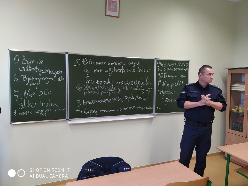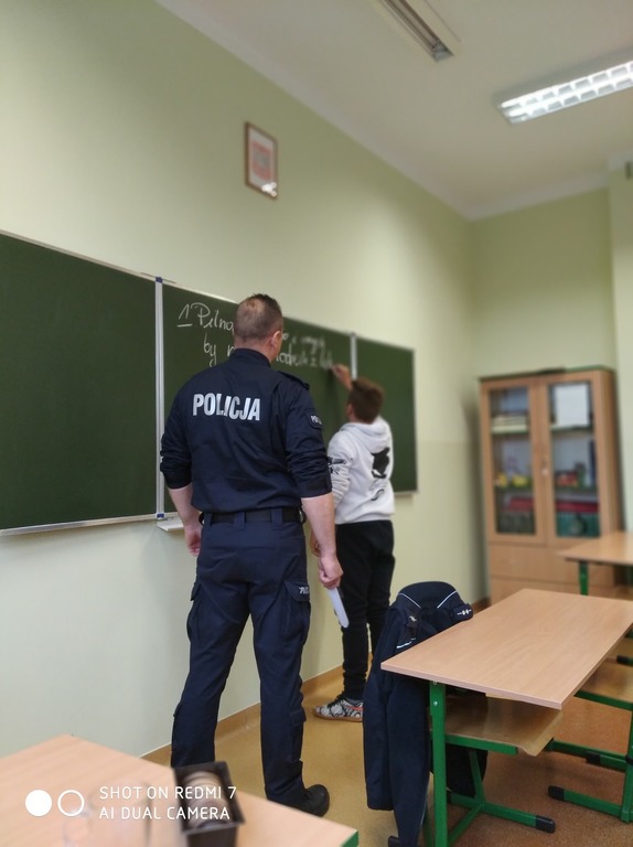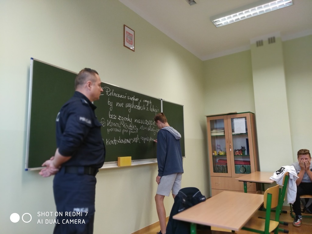 Policjanci systematycznie spotykają się młodzieżą szkolną aby zawczasu uświadomić ich o odpowiedzialności karnej za ewentualne czyny. Mundurowi pytali uczniów czy znają jakieś zachowania niedozwolone. Po kilku minutach zastanowienia z ust siódmoklasistów padały propozycje, które zapisywali na tablicy. Celem takich spotkań nie jest straszenie młodzieży, ale uświadamianie im konsekwencji za dane zachowania. Funkcjonariusze poruszali tematy demoralizacji, kradzieży, przywłaszczania rzeczy w szkole oraz zażywania różnego rodzaju niedozwolonych