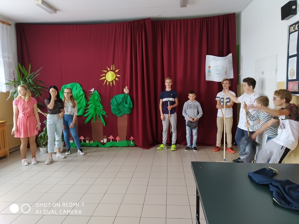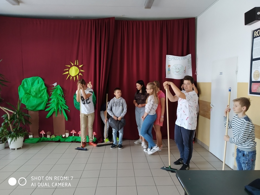 Inscenizacja pt.: "Sprzątanie świata", przygotowana dla naszych najmłodszych podopiecznych- czyli kształtowanie postaw proekologicznych w naszej szkole. Klasa VII B oraz pani Katarzyna Wróblewska.