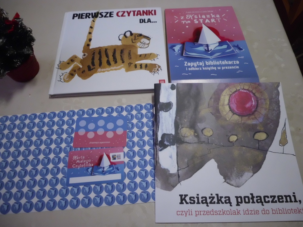 Każde dziecko w wieku od 3 do 6 lat , które przyjdzie z rodzicem do biblioteki otrzyma w prezencie Wyprawkę Czytelniczą : Pierwsze czytanki... , Książką połączeni i Kartę Małego Czytelnika.