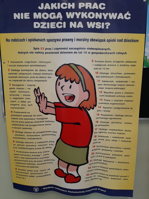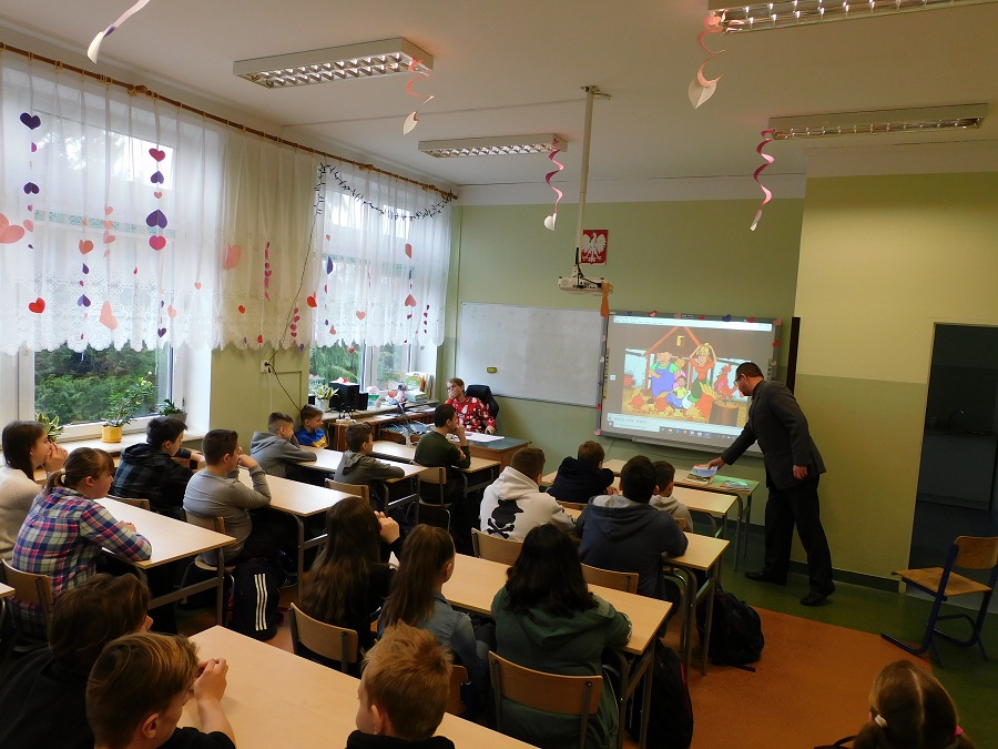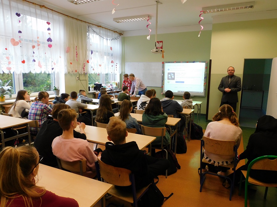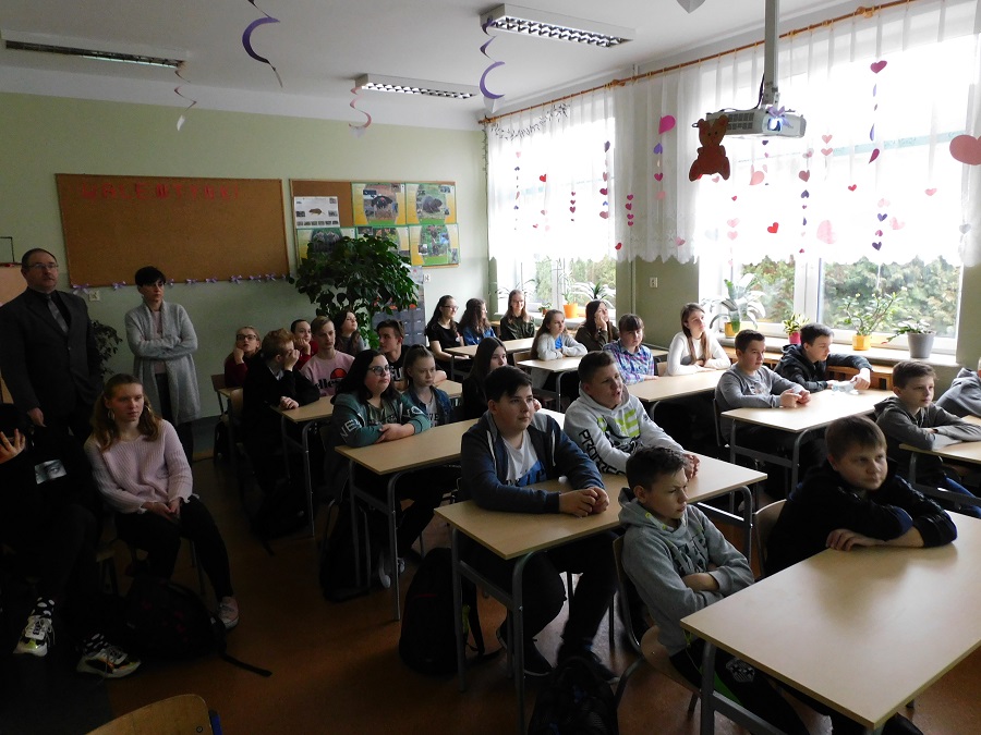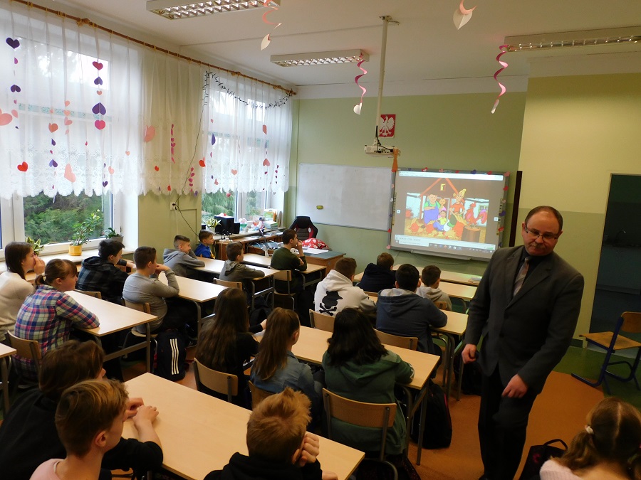 W środę 12 lutego 2020 r. uczniowie klas siódmych uczestniczyli w spotkaniu dotyczącym bezpieczeństwa na wsi. Przedstawione na nim były różne sytuacje związane głównie z pracami w gospodarstwach rolnych, w których uczniowie mogliby być narażeni na niebezpieczeństwo. Omówione zostały zasady bezpiecznego zachowania się w wielu takich sytuacjach oraz regulacje prawne dotyczące pracy młodzieży w gospodarstwach rolnych. Uczniowie oglądali również filmy edukacyjne związane z tą tematyką. Zajęcia poprowadził starszy inspektor pracy z Państwowej Inspekcji Pracy - Pan Mirosław Belta.