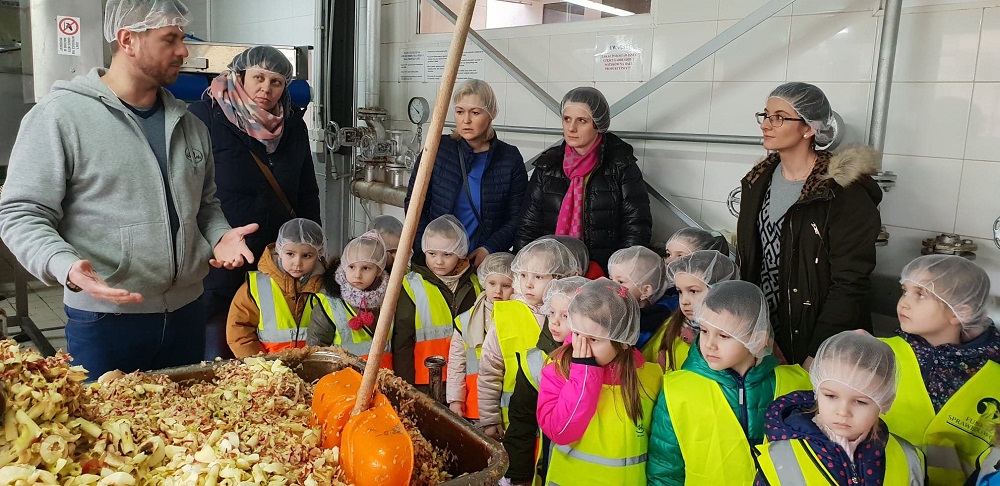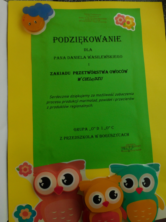 W dniu 20.02.2020r. przedszkolaki z grup O,,c” i O,,d” pod opieką wychowawców wybrały się na wycieczkę do Zakładu Przetwórstwa Owoców w Cielądzu. Dzieci zobaczyły proces produkcji marmolad, musów i przecierów z jabłek. Ostatnim punktem wycieczki była sala zabaw Figloraj, gdzie zabawie i radości nie było końca .