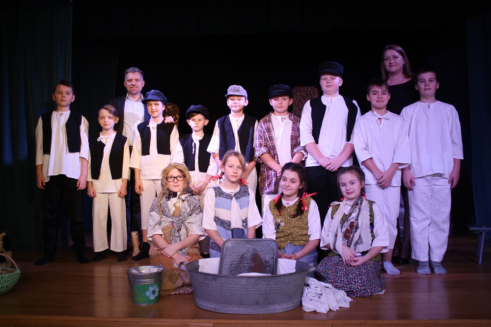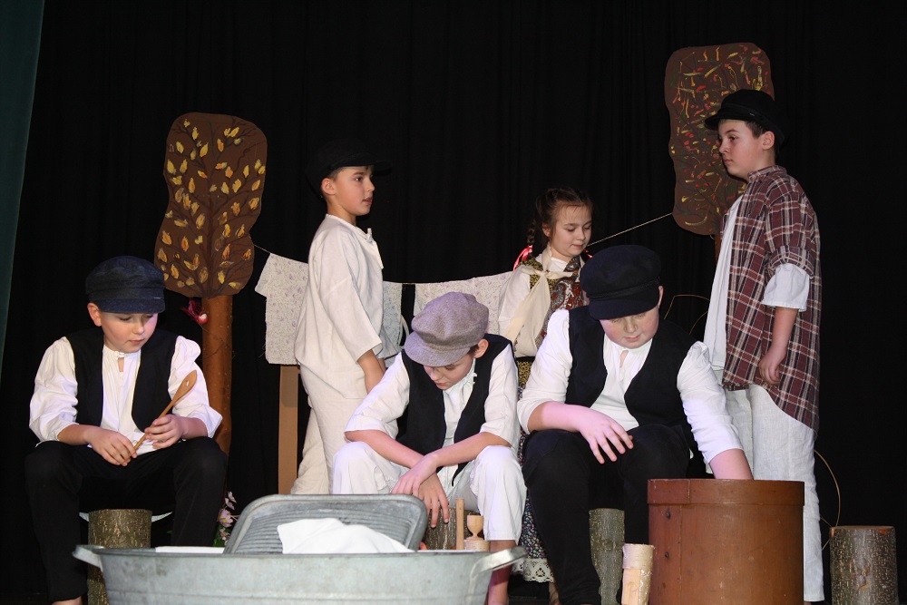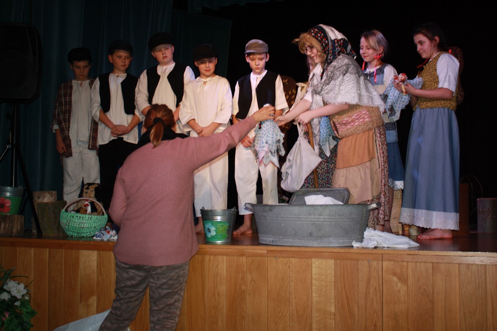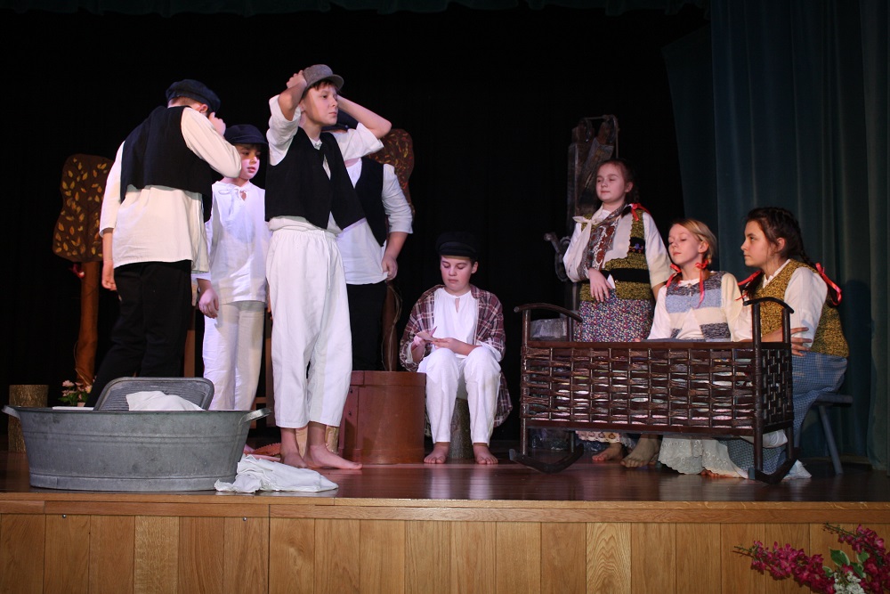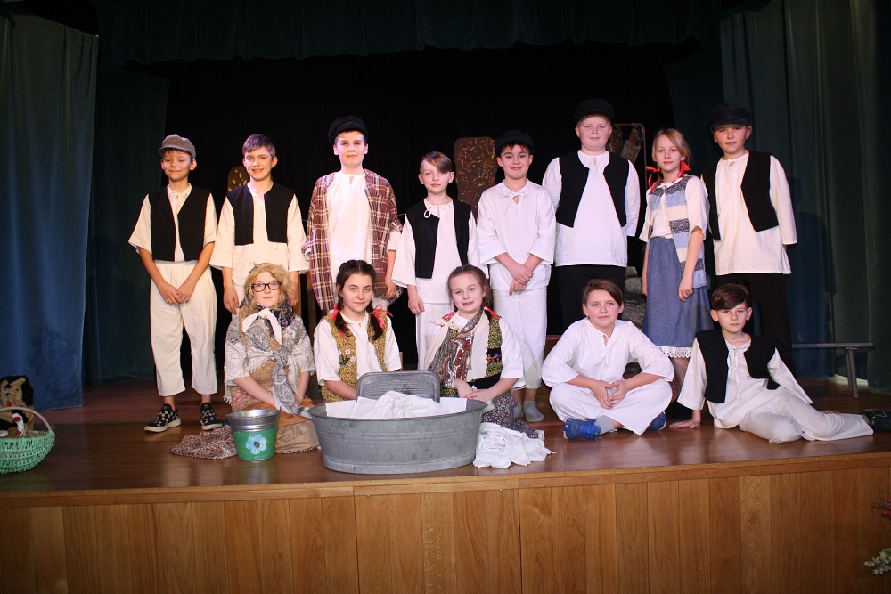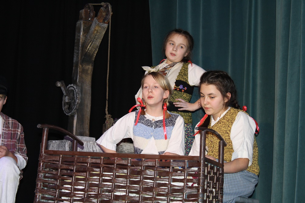 Dzisiaj w Centrum Aktywności Kulturalnej o godzinie 11.15 i 12.15 uczniowie naszej szkoły, rodzice, nauczyciele oraz zaproszeni goście: m.in. Wójt Gminy Rawa Mazowiecka, p. Michał Michalik, Ks. Proboszcz, Zbigniew Kaliński, autorka scenariusza, p. Maria Jolanta Hein, dyrektor Gminnego Ośrodka Kultury w Matyldowie, p. Łukasz Glimasiński, p. Małgorzata Dudek, dyrektor Gminnego Zespołu do spraw Oświaty, Kultury i Sportu, p. Anna Jakubiak, Sekretarz Gminy, podopieczni fundacji „Obudźmy nadzieję”, państwo Barbara i Janusz Furmańscy, Seniorzy z Klubu Seniora w Rossosze, p. Anna Popłońska, przedstawicielka lokalnych mediów oraz mieszkańcy Boguszyc i okolic dwukrotnie obejrzeli przedstawienie, które opowiada o życiu w dawnej wielodzietnej rodzinie wiejskiej. Starsze rodzeństwo wychowywało młodsze, a także pod nieobecność rodziców wykonywało szereg obowiązków w obejściu.