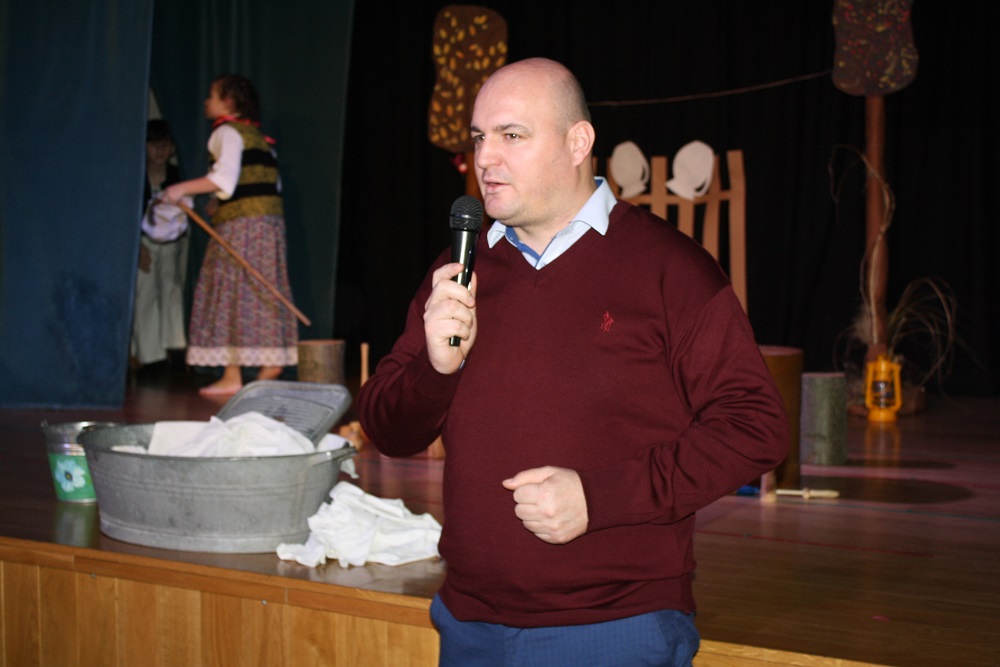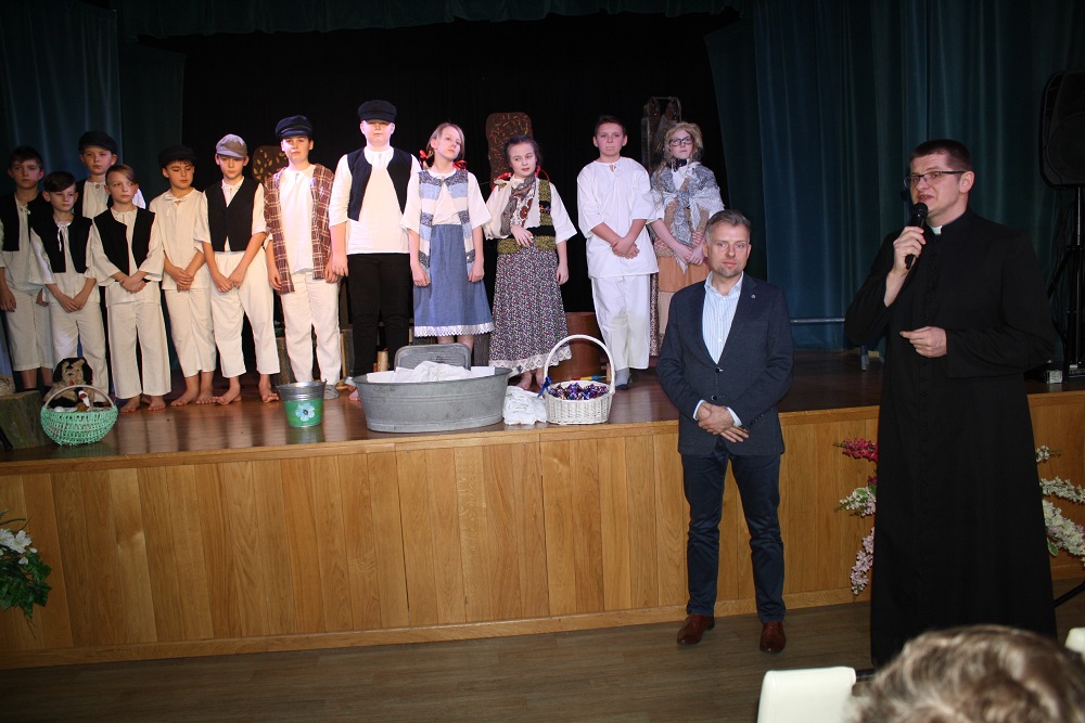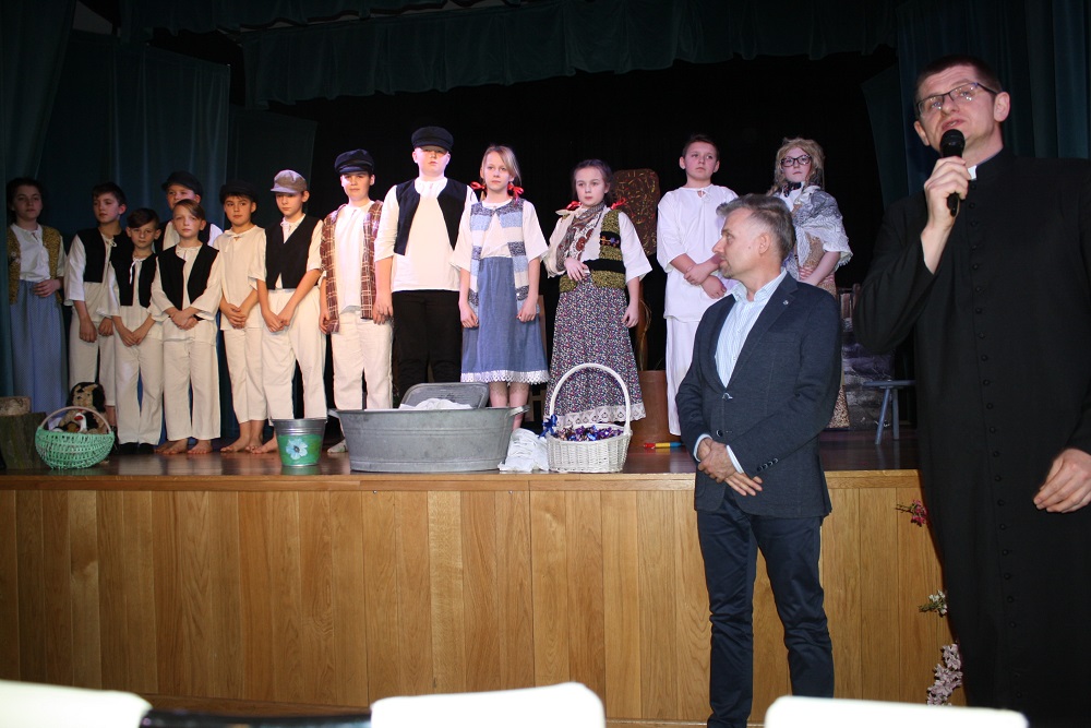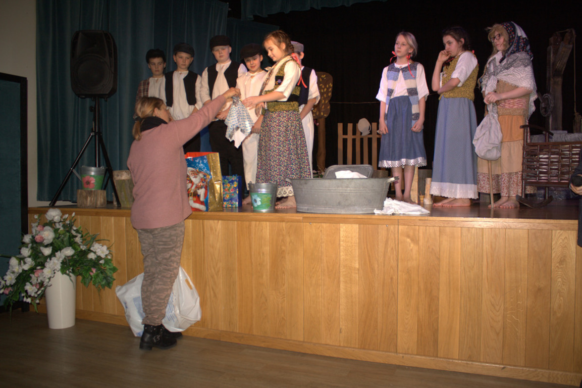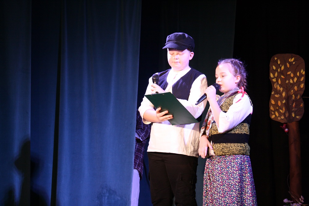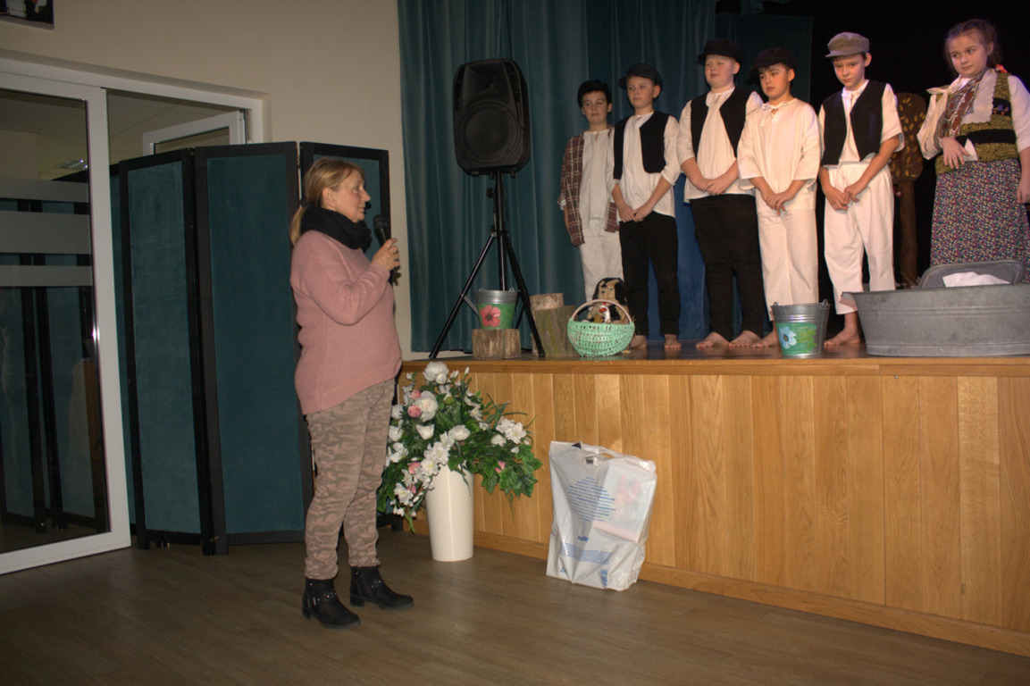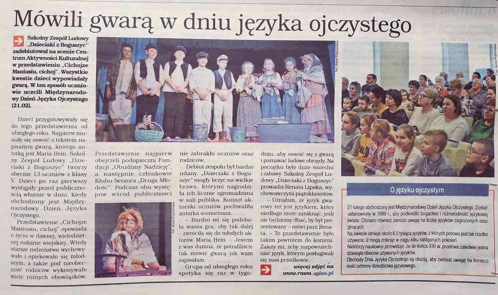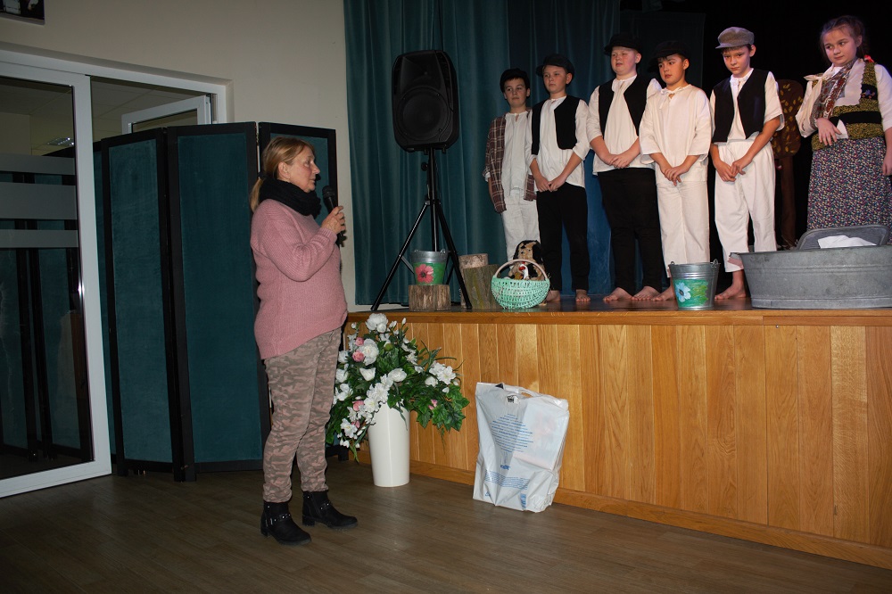 Dlatego też uczniowie klasy piątej, należący do zespołu ludowego, przygotowali przedstawienie gwarą, pt. „Cichojze, Maniusiu cichoj…” autorstwa Pani Marii Jolanty Hein, aby rozpowszechniać język, którym posługiwali się nasi przodkowie.