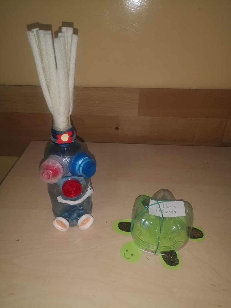 Uczniowie klasy V w ramach zajęć technicznych wykazali się ogromną kreatywnością i wykonali "ekologiczne stworki". Przepiękne i pomysłowe prace zaprezentowane zostały młodszym kolegom i koleżankom z klas I-III, którzy z radością podziwiali wystawę prac podczas nauki stacjonarnej. W ten oto sposób starsi uczniowie zwrócili uwagę dzieci na problem ekologii. Zapraszamy do obejrzenia galerii prac:)