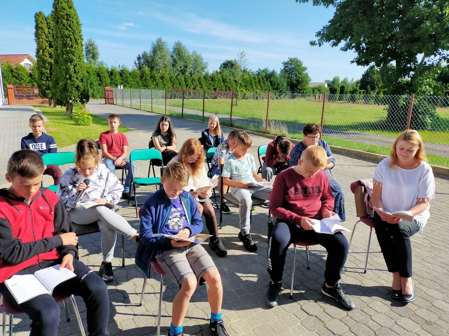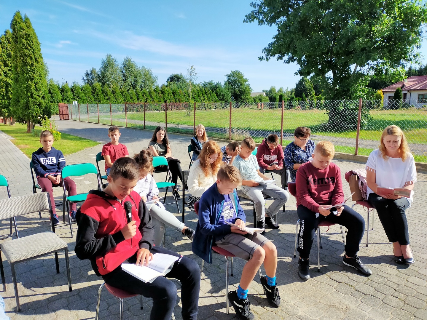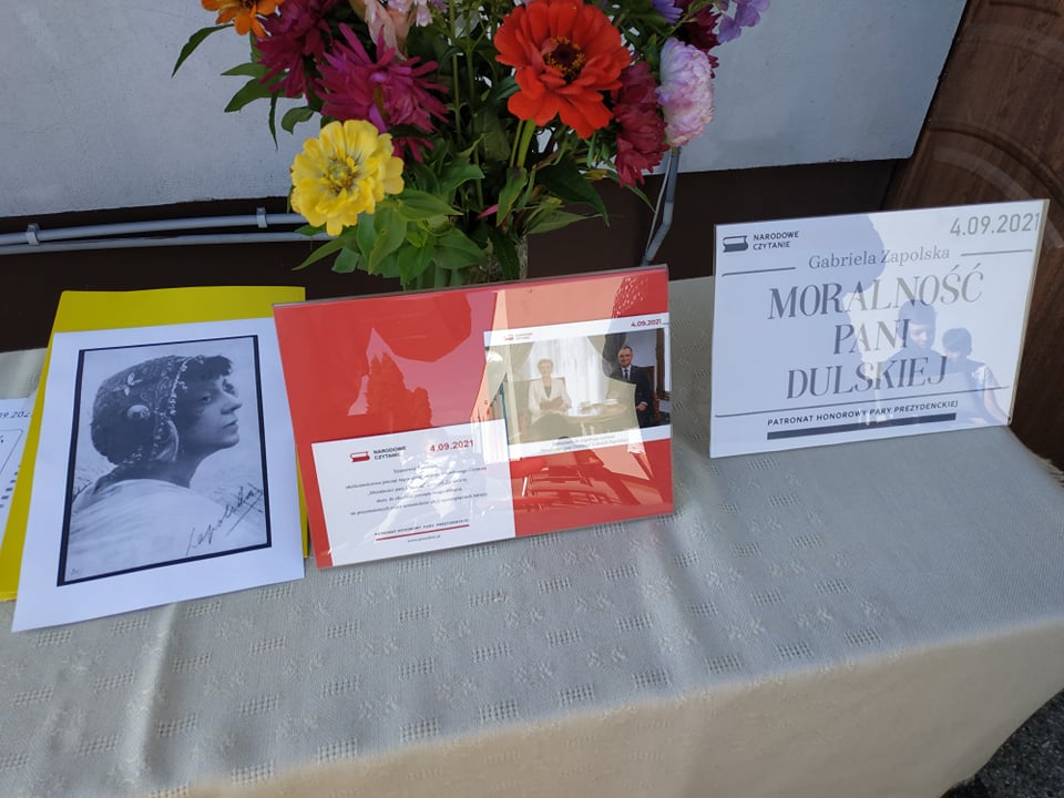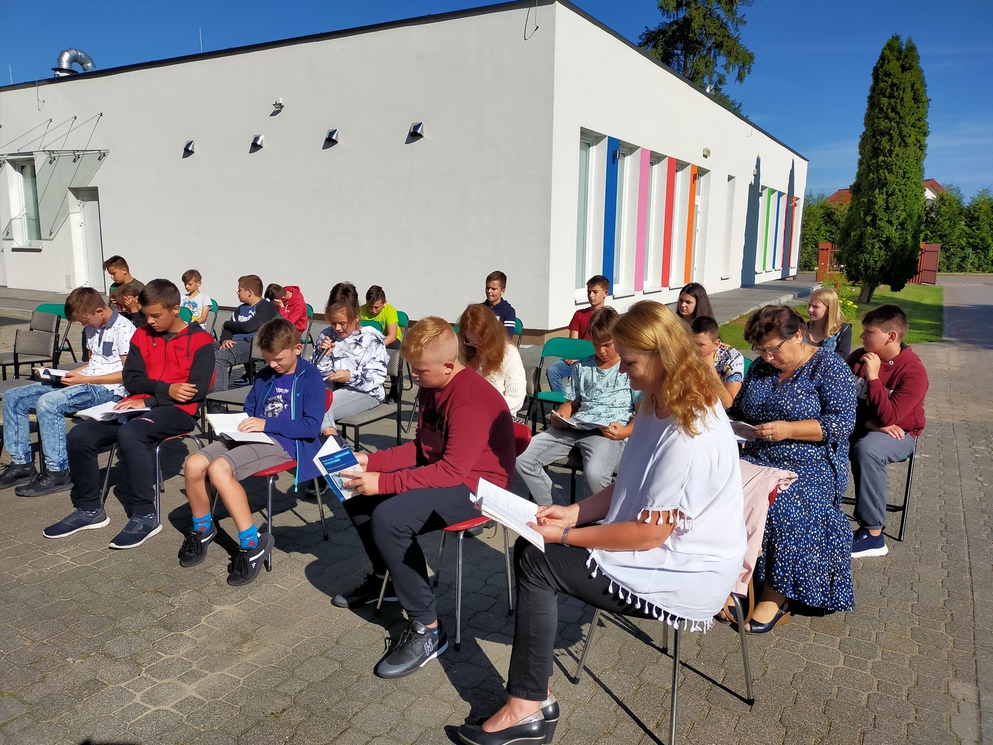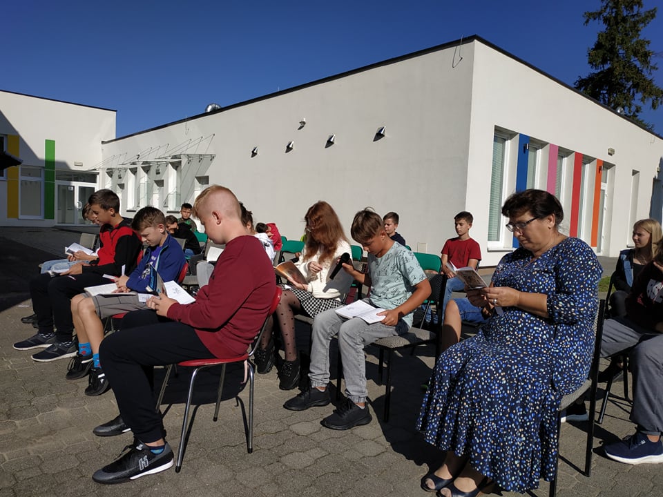 Dzisiaj, 3 września 2021r. uczniowie klasy VII, VIII a i VIII b naszej szkoły wraz z nauczycielkami języka polskiego: p. Elżbietą Manowiecką i p. Renatą Lipską oraz dyrektorem p. Mariuszem Bazylakiem wzięli udział w Narodowym Czytaniu 2021. W tym roku wspólnie czytaliśmy "Moralność pani Dulskiej" Gabrieli Zapolskiej. W akcji pod patronatem honorowym pary prezydenckiej wzięliśmy udział po raz szósty. Akcję zorganizowała pani Janina Ornafa - bibliotekarka z Biblioteki Publicznej Gminy Rawa Mazowiecka Filia Biblioteczna w Boguszycach. W Narodowym Czytaniu uczestniczyły 52 osoby. Uczestnicy po przeczytaniu lektury mogli skorzystać z pamiątkowej pieczątki i ostemplować swoje zeszyty lub egzemplarze książki. Za aktywny udział w akcji młodzież została nagrodzona słodkim poczęstunkiem.