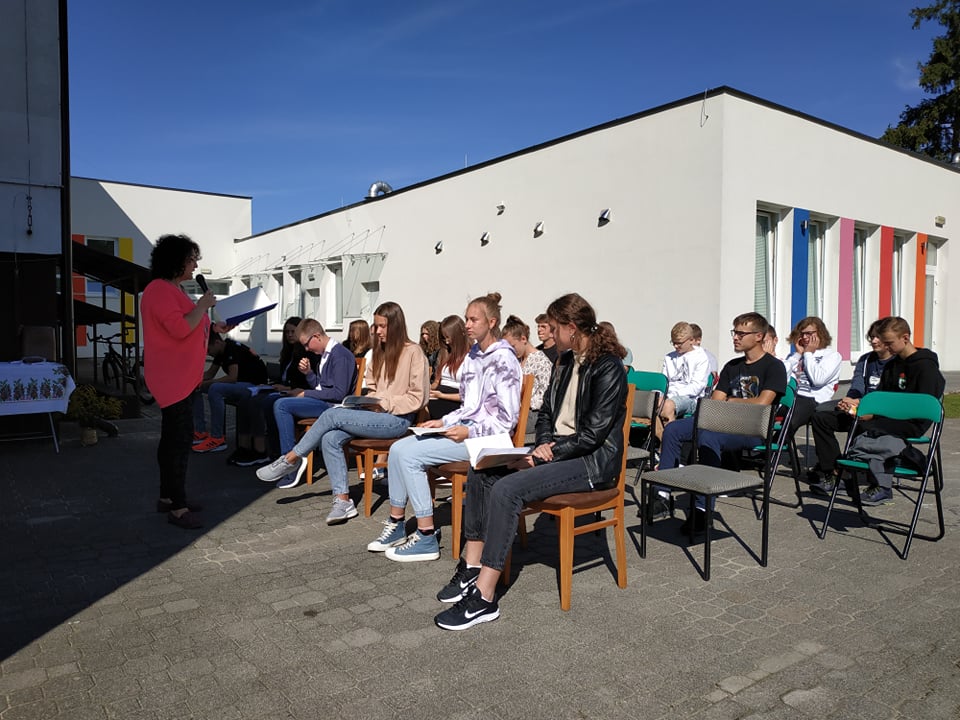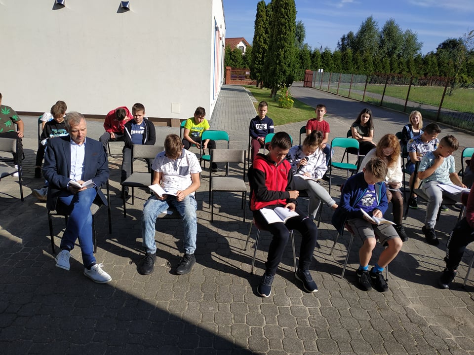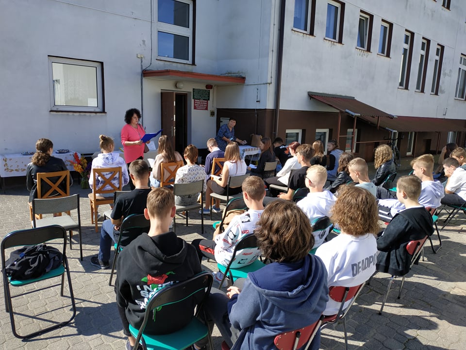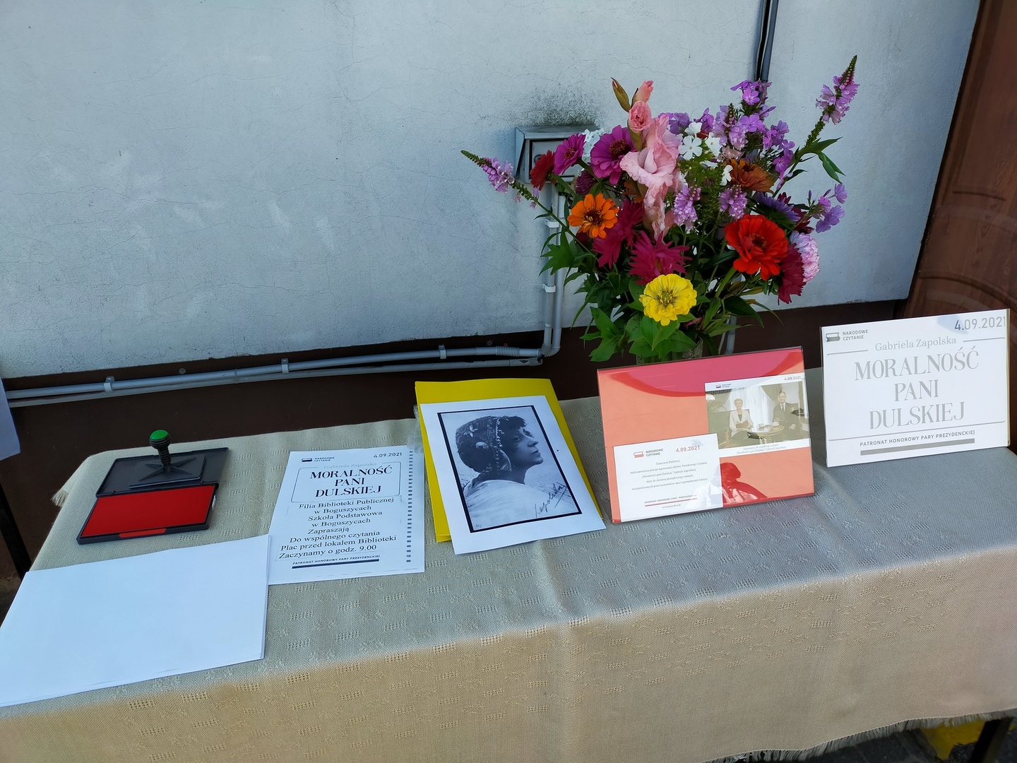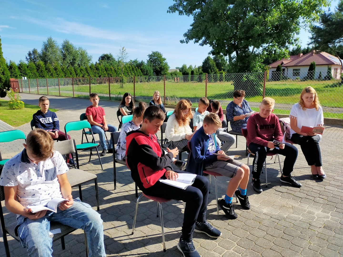 Dzisiaj, 3 września 2021r. uczniowie klasy VII, VIII a i VIII b naszej szkoły wraz z nauczycielkami języka polskiego: p. Elżbietą Manowiecką i p. Renatą Lipską oraz dyrektorem p. Mariuszem Bazylakiem wzięli udział w Narodowym Czytaniu 2021. W tym roku wspólnie czytaliśmy "Moralność pani Dulskiej" Gabrieli Zapolskiej. W akcji pod patronatem honorowym pary prezydenckiej wzięliśmy udział po raz szósty. Akcję zorganizowała pani Janina Ornafa - bibliotekarka z Biblioteki Publicznej Gminy Rawa Mazowiecka Filia Biblioteczna w Boguszycach. W Narodowym Czytaniu uczestniczyły 52 osoby. Uczestnicy po przeczytaniu lektury mogli skorzystać z pamiątkowej pieczątki i ostemplować swoje zeszyty lub egzemplarze książki. Za aktywny udział w akcji młodzież została nagrodzona słodkim poczęstunkiem.