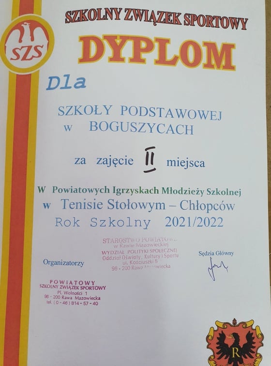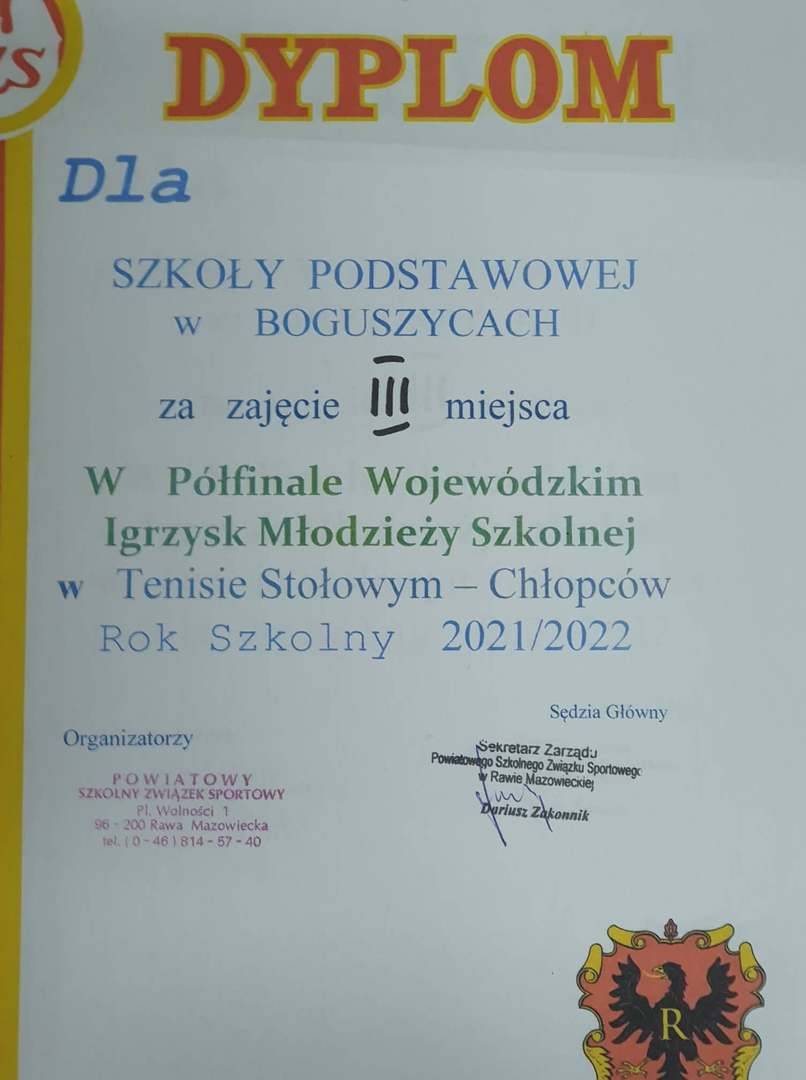 Uczniowie naszej szkoły: Bartłomiej Lewandowski, Maksymilian Dudek i Kacper Wójcik zdobyli II miejsce w Powiatowych Igrzyskach Młodzieży Szkolnej w Tenisie Stołowym - Chłopców, jednocześnie awansująć do półfinału wojewódzkiego, gdzie po zaciętej walce zdobyli III miejsce. Brawo chłopcy! Trener: Dorota Supeł