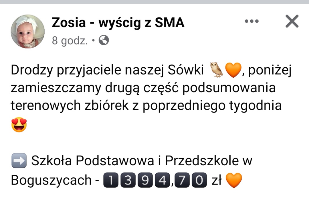 Wsparliśmy Zosię kwotą 1394,70 złotych zebraną do puszki przez uczniów naszej placówki.