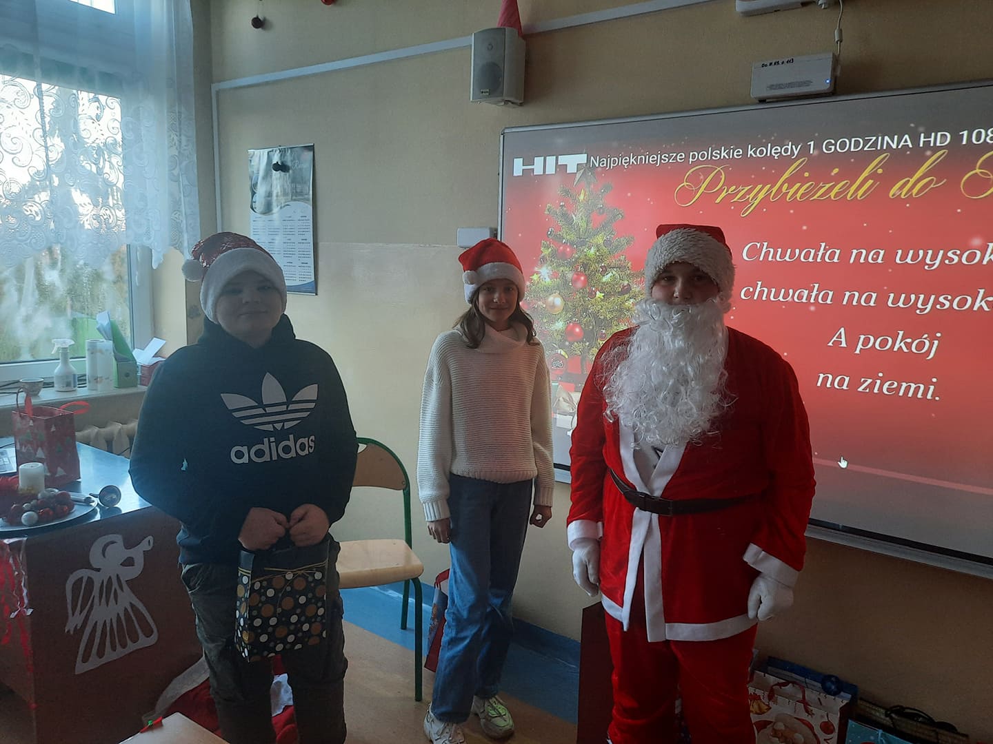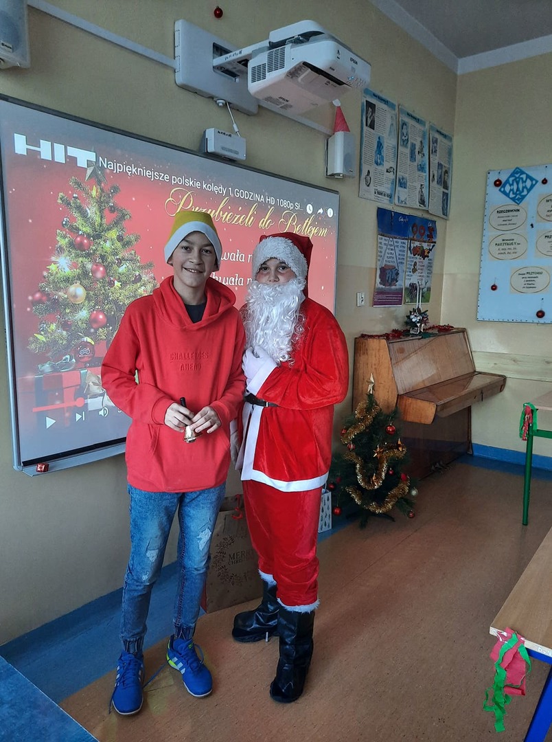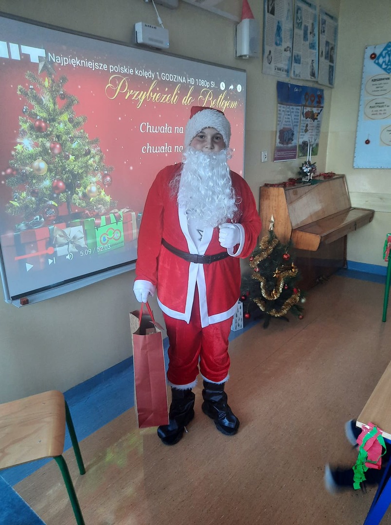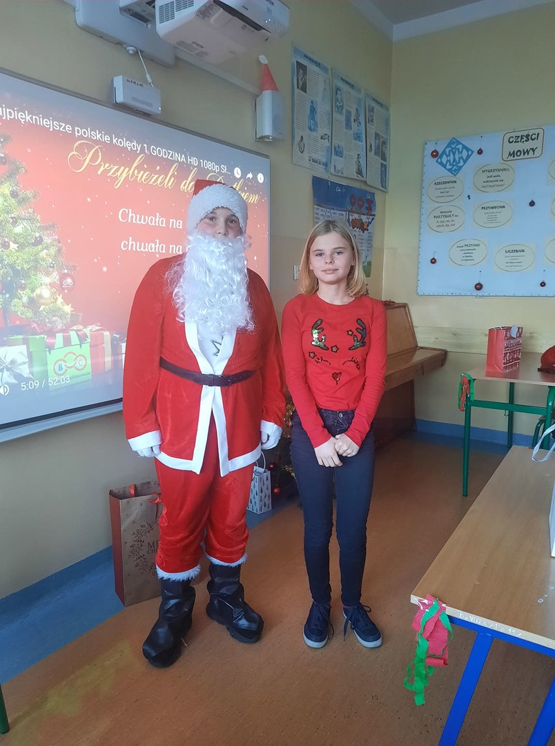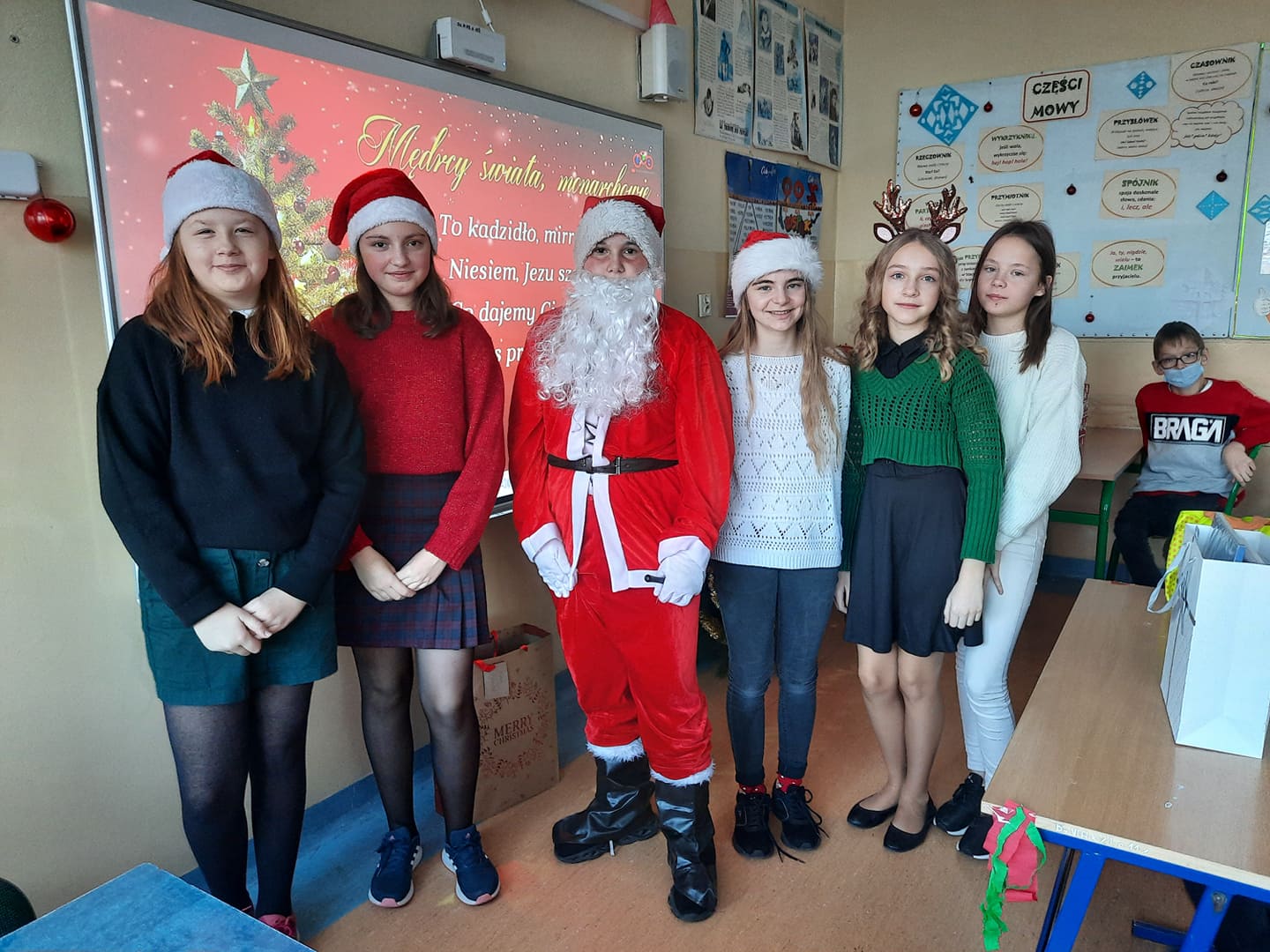 W dniu 03.12.2021 w klasie szóstej odbyły się Mikołajki. Na ten dzień szóstoklasiści pięknie ozdobili klasę lampkami, bombkami, choinką oraz ubrali się na czerwono. Dzień ten rozpoczął się od wizyty Mikołaja - Huberta, który wraz ze śnieżynką Amelką rozdawał dzieciom prezenty. Po otrzymaniu podarków przyszedł czas na wspólne oglądanie oraz pamiątkowe zdjęcie ze Świętym Mikołajem. Następnie dzieci odśpiewały kolędę „Przybieżeli do Betlejem Pasterze”. Na koniec były gry i zabawy. Ten dzień był pełen radości i na pewno zapamiętają go na długo.