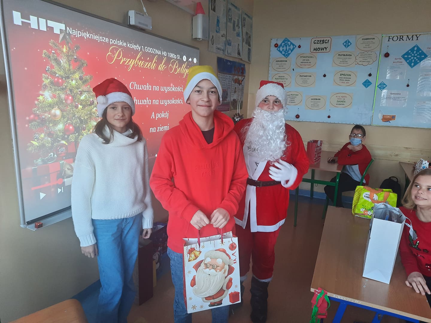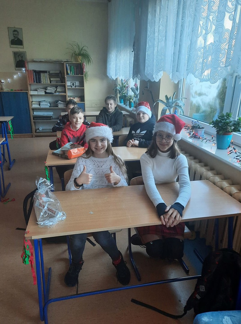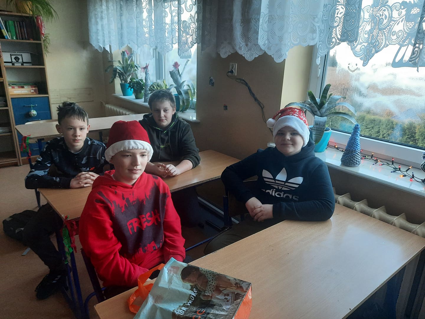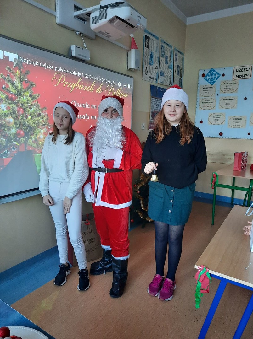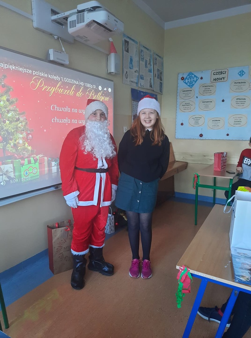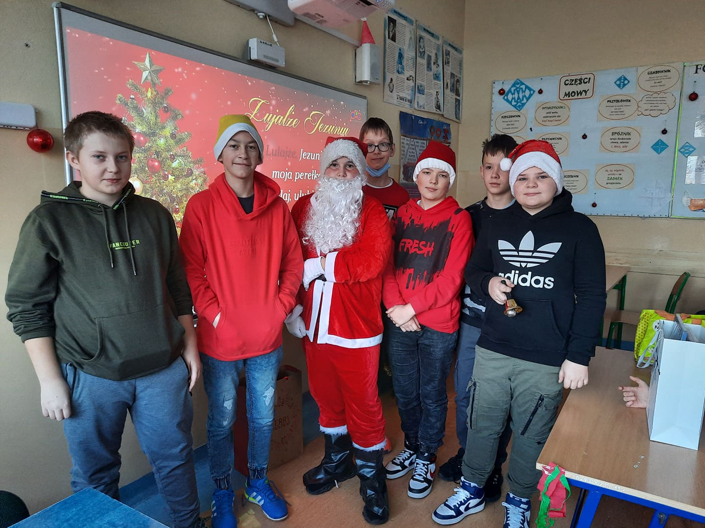 W dniu 03.12.2021 w klasie szóstej odbyły się Mikołajki. Na ten dzień szóstoklasiści pięknie ozdobili klasę lampkami, bombkami, choinką oraz ubrali się na czerwono. Dzień ten rozpoczął się od wizyty Mikołaja - Huberta, który wraz ze śnieżynką Amelką rozdawał dzieciom prezenty. Po otrzymaniu podarków przyszedł czas na wspólne oglądanie oraz pamiątkowe zdjęcie ze Świętym Mikołajem. Następnie dzieci odśpiewały kolędę „Przybieżeli do Betlejem Pasterze”. Na koniec były gry i zabawy. Ten dzień był pełen radości i na pewno zapamiętają go na długo.