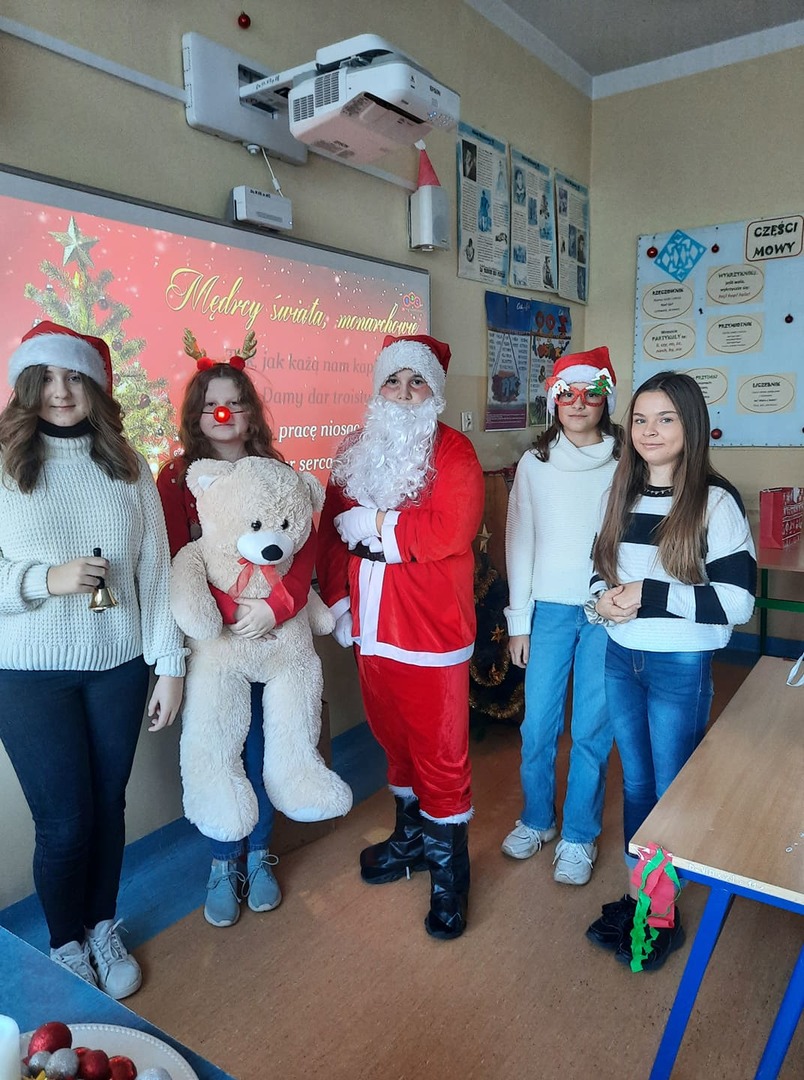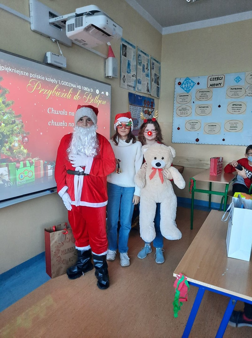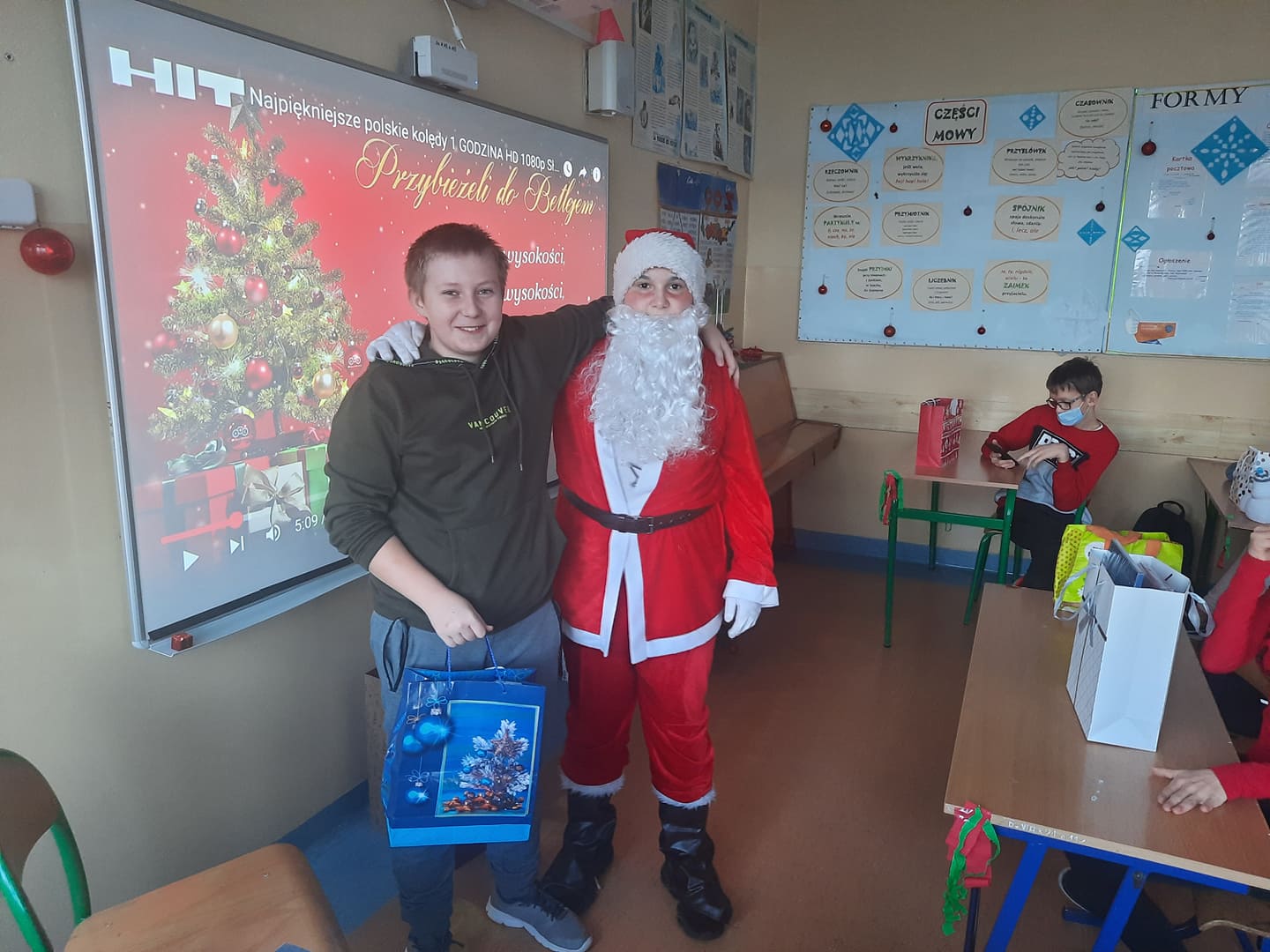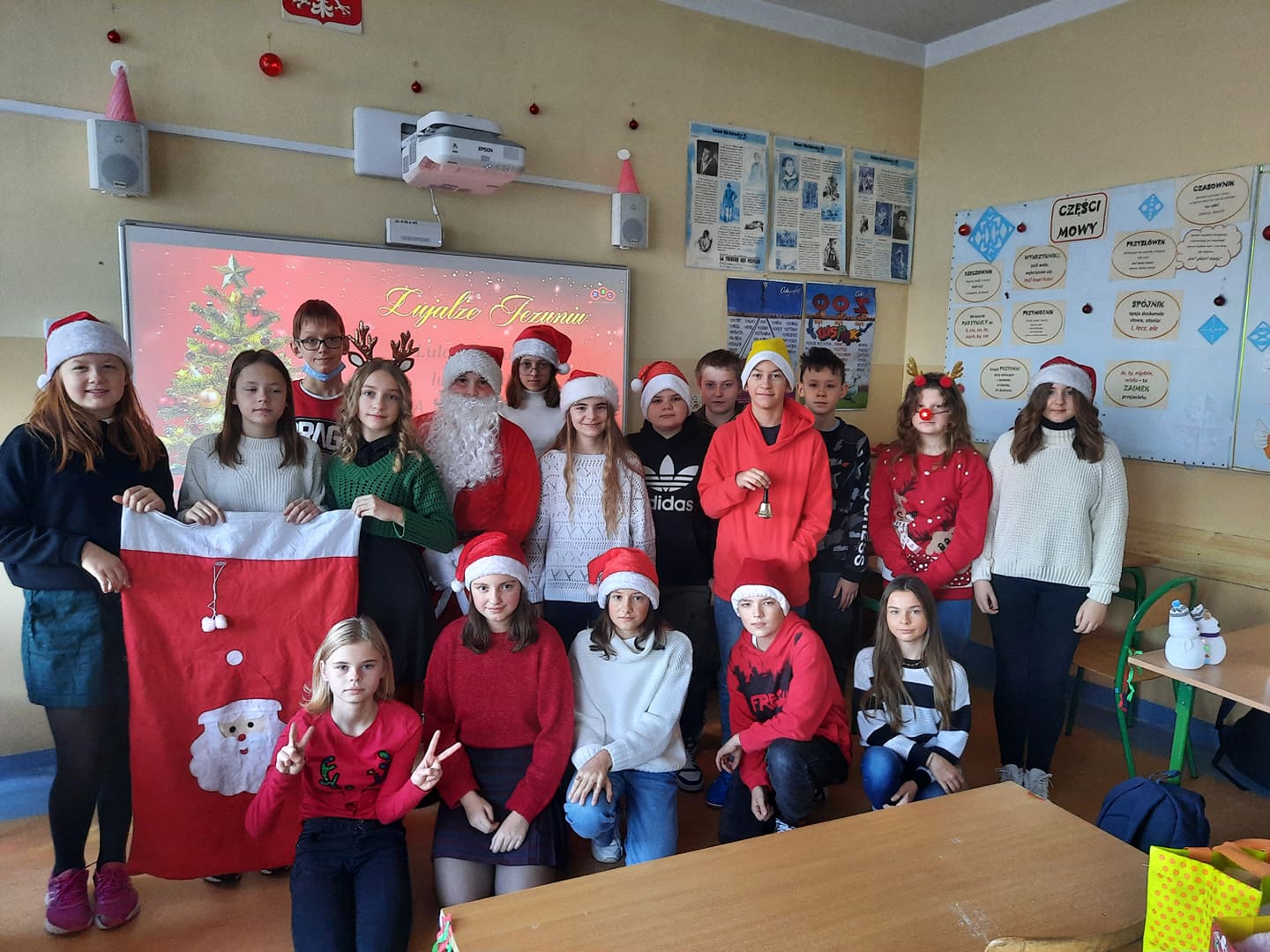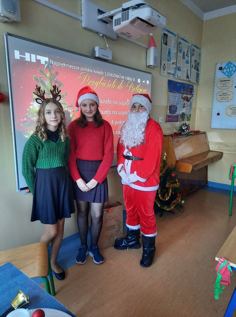 W dniu 03.12.2021 w klasie szóstej odbyły się Mikołajki. Na ten dzień szóstoklasiści pięknie ozdobili klasę lampkami, bombkami, choinką oraz ubrali się na czerwono. Dzień ten rozpoczął się od wizyty Mikołaja - Huberta, który wraz ze śnieżynką Amelką rozdawał dzieciom prezenty. Po otrzymaniu podarków przyszedł czas na wspólne oglądanie oraz pamiątkowe zdjęcie ze Świętym Mikołajem. Następnie dzieci odśpiewały kolędę „Przybieżeli do Betlejem Pasterze”. Na koniec były gry i zabawy. Ten dzień był pełen radości i na pewno zapamiętają go na długo.