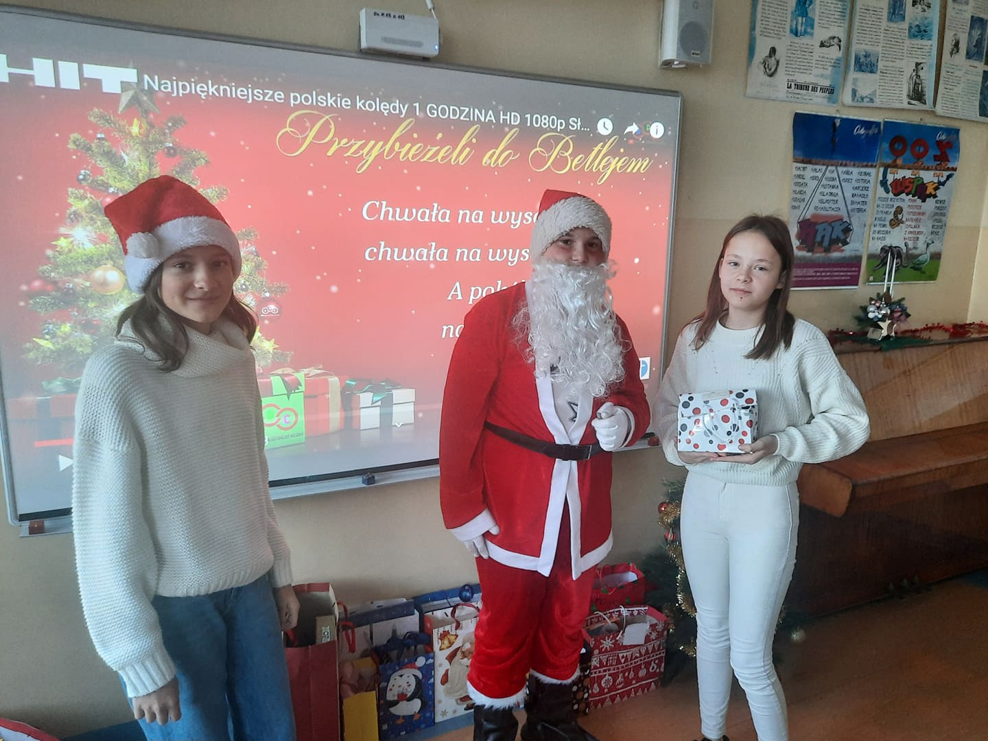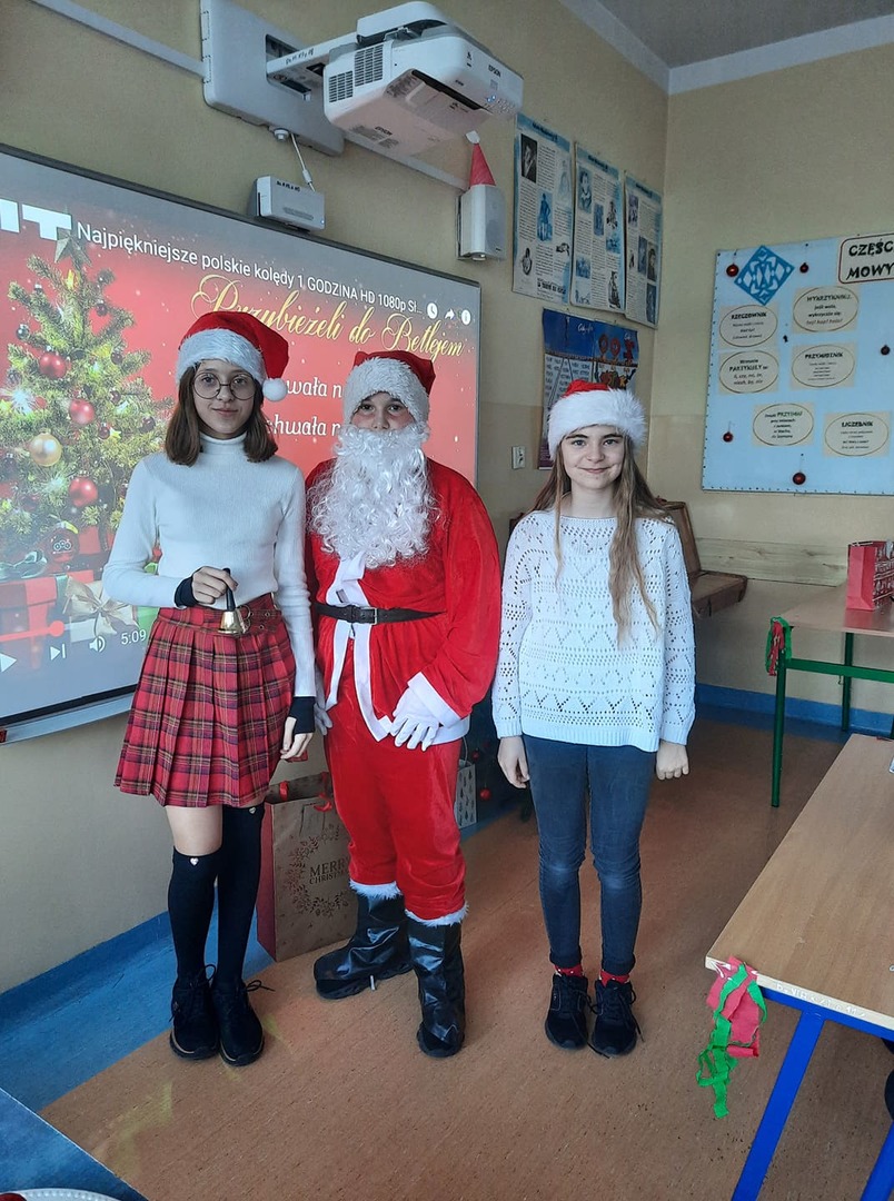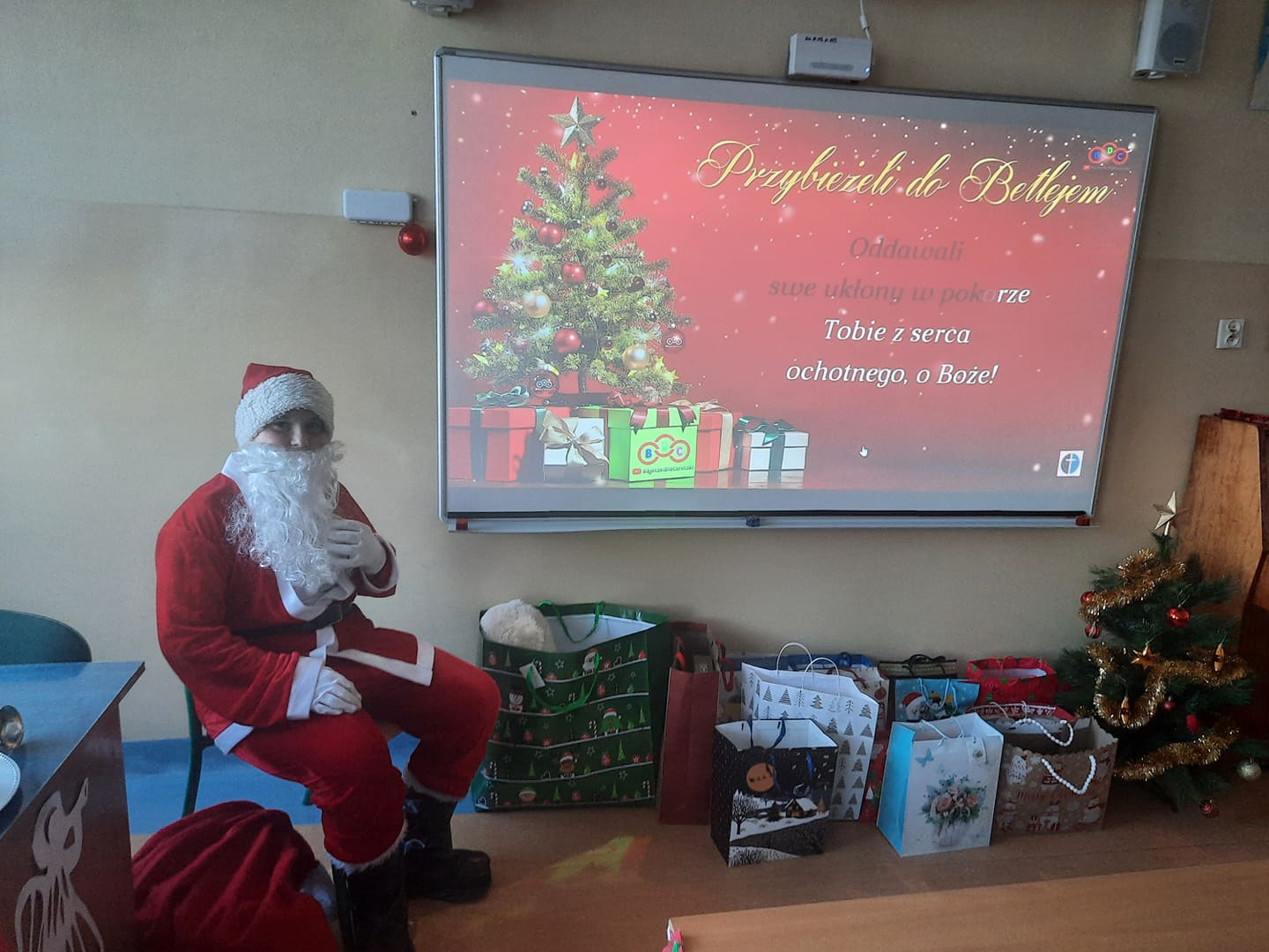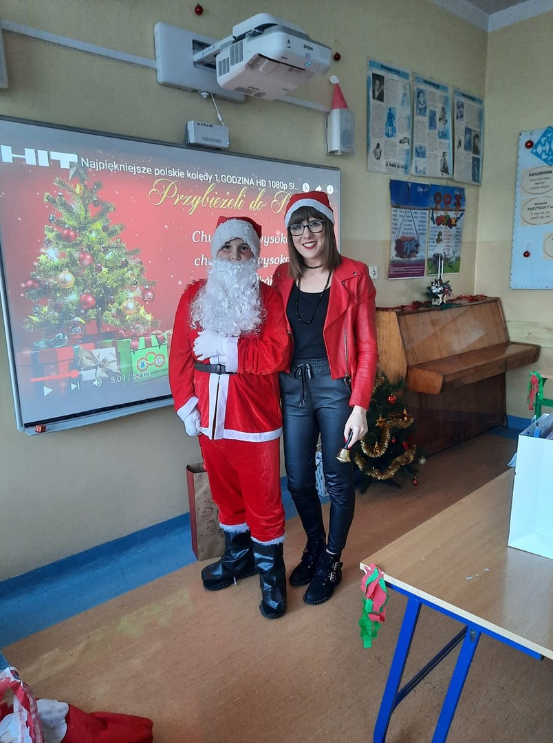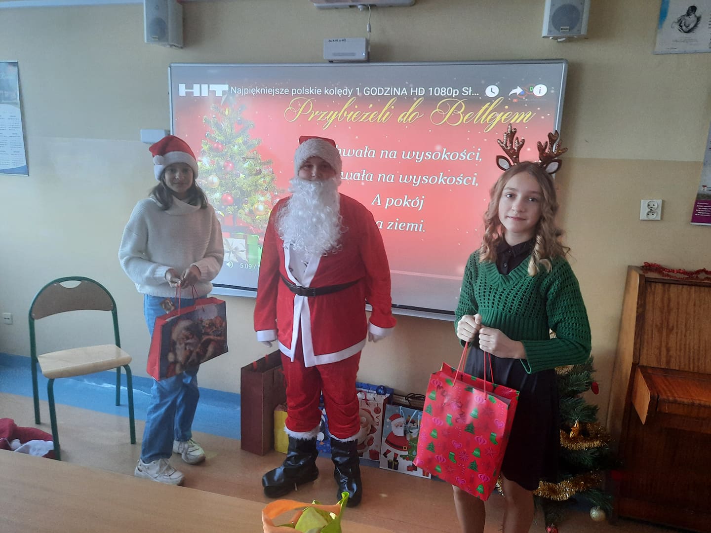 W dniu 03.12.2021 w klasie szóstej odbyły się Mikołajki. Na ten dzień szóstoklasiści pięknie ozdobili klasę lampkami, bombkami, choinką oraz ubrali się na czerwono. Dzień ten rozpoczął się od wizyty Mikołaja - Huberta, który wraz ze śnieżynką Amelką rozdawał dzieciom prezenty. Po otrzymaniu podarków przyszedł czas na wspólne oglądanie oraz pamiątkowe zdjęcie ze Świętym Mikołajem. Następnie dzieci odśpiewały kolędę „Przybieżeli do Betlejem Pasterze”. Na koniec były gry i zabawy. Ten dzień był pełen radości i na pewno zapamiętają go na długo.