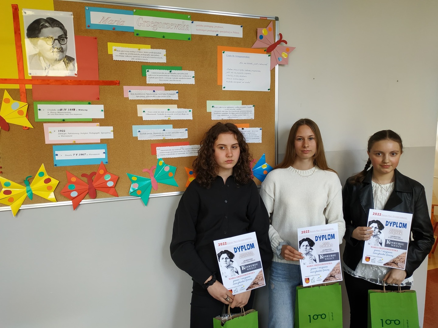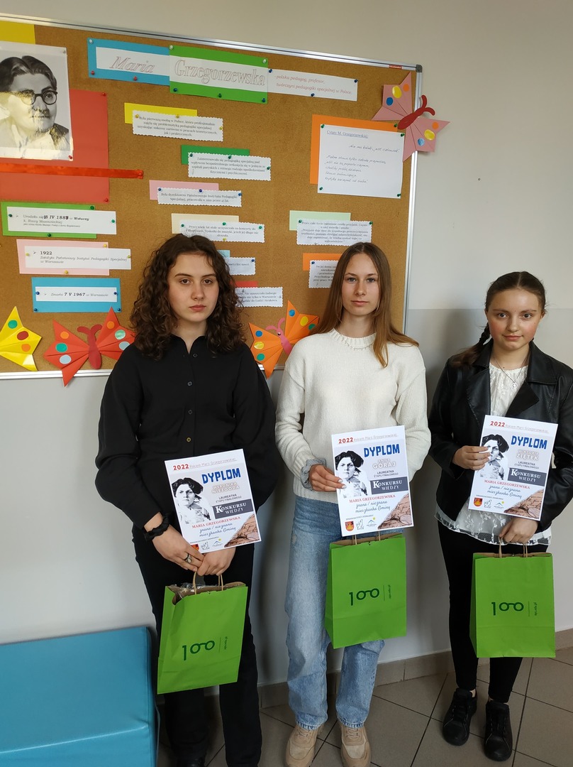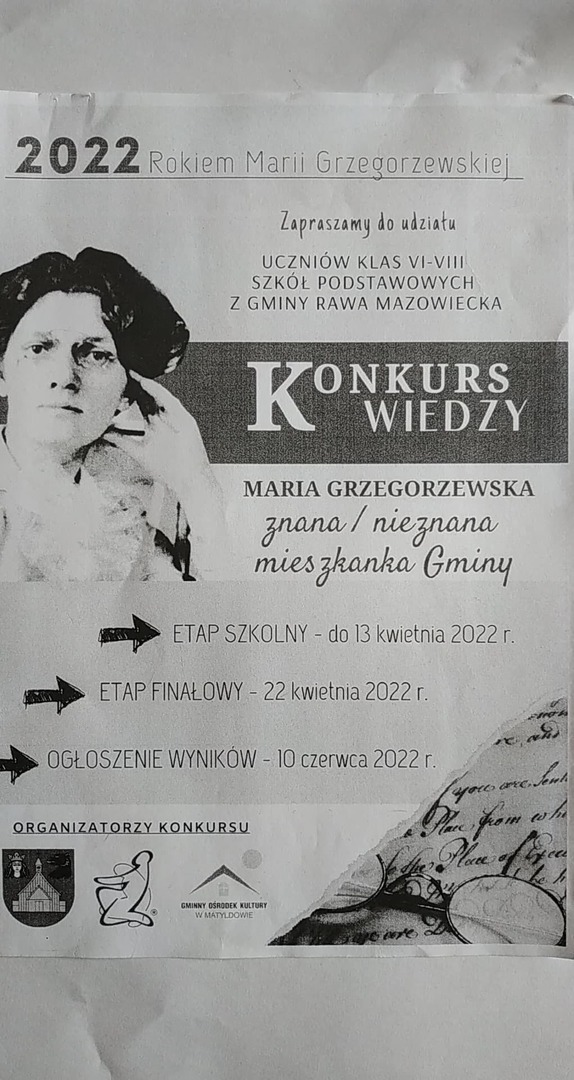 W dniu 22 kwietnia 2022r. trzy uczennice naszej szkoły wzięły udział w etapie finałowym konkursu wiedzy: "Maria Grzegorzewska znana/nieznana mieszkanka Gminy" pod patronatem Gminy Rawa Mazowiecka, Gminnego Ośrodka Kultury w Matyldowie i Akademii Pedagogiki Specjalnej im. Marii Grzegorzewskiej w Warszawie. Konkurs promuje obchody Roku Marii Grzegorzewskiej. Weronika Niezgoda z kl. 8a, Anna Góraj z kl. 8a i Wiktoria Ziętek z kl. 6 w etapie szkolnym zajęły pierwsze trzy miejsca i zakwalifikowały się do etapu finałowego. W obydwu etapach rozwiązywały zadania konkursowe, które dotyczyły dorobku naukowo - zawodowego prof. Marii Grzegorzewskiej, historii i obecnego funkcjonowania jednostki samorządowej Gminy Rawa Mazowiecka oraz Akademii Pedagogiki Specjalnej w Warszawie. Po zakończeniu konkursu uczestnicy obejrzeli ciekawą prezentację przedstawiającą sylwetkę Marii Grzegorzewskiej, wysłuchali ciekawostek z życia twórczyni pedagogiki specjalnej, a także mieli okazję spotkać się z wykładowcami i studentkami APS, z Wójtem Gminy Rawa Mazowiecka p. Michałem Michalikiem oraz z dyrektorem GOK w Matyldowie p. Łukaszem Glimasińskim. Następnie uczestnicy konkursu oddali hołd Marii Grzegorzewskiej - złożono kwiaty i zapalono znicze przed pomnikiem w Wołuczy. Ogłoszenie wyników konkursu nastąpi 10 czerwca 2022r. w Kurzeszynie. Opiekun młodzieży: p. R.Lipska oraz p. E.Manowiecka.