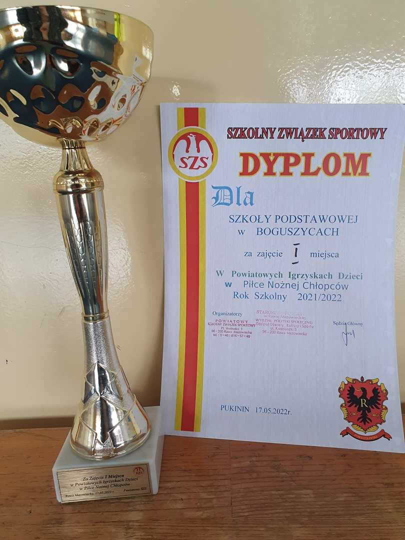 Nasza drużyna zajęła I miejsce w Powiatowych Igrzyskach Dzieci w piłce nożnej chłopców rozgrywanych w Pukininie. Skład drużyny: