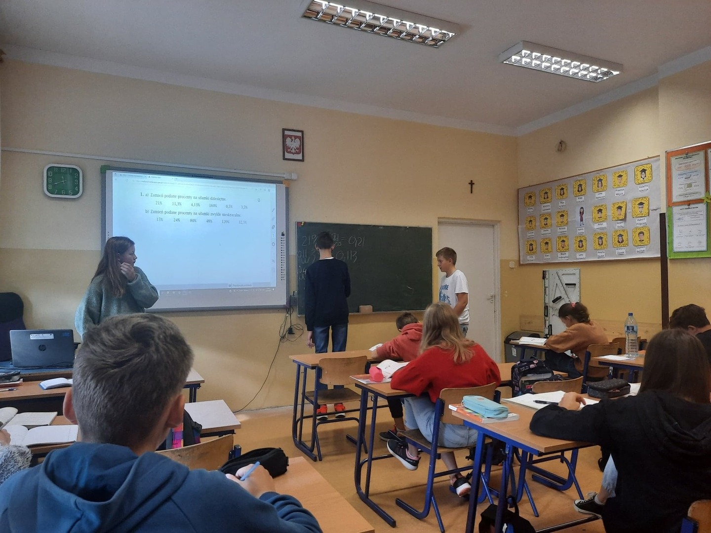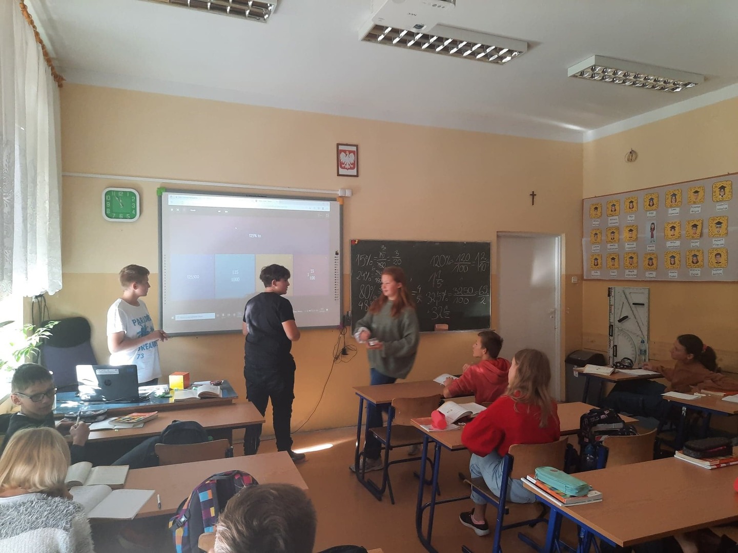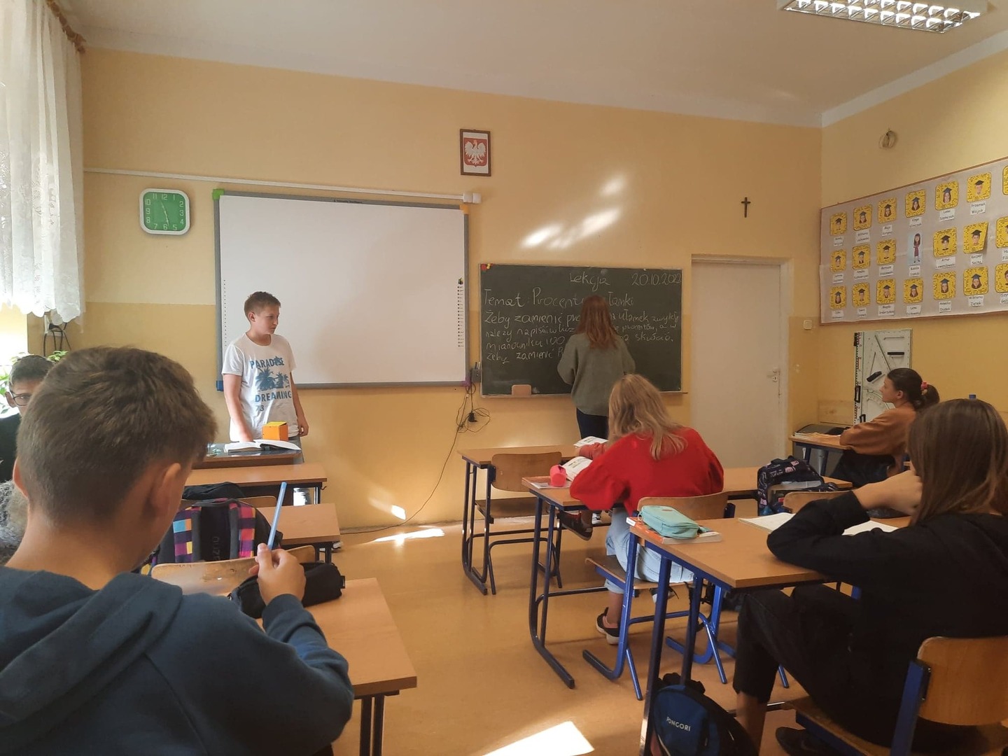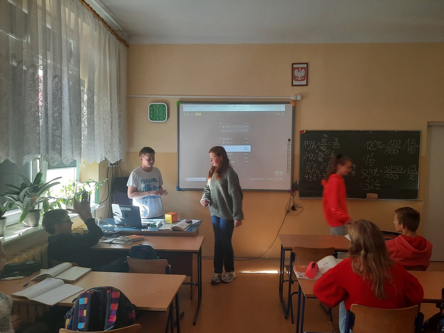 Dzisiaj w klasie 7 lekcję matematyki poprowadzili uczniowie. Przemek wcieli się w rolę profesora Wójcika, a Lena w panią profesor Muchomorek. "Młodzi nauczyciele" poprowadzili lekcję dotyczącą procentów. Lekcja była dobrze przemyślana i ciekawa. Nie zabrakło quizów i co najważniejsze uśmiechu na twarzach uczniów. Czekamy na kolejne zamiany ról w klasie VII.