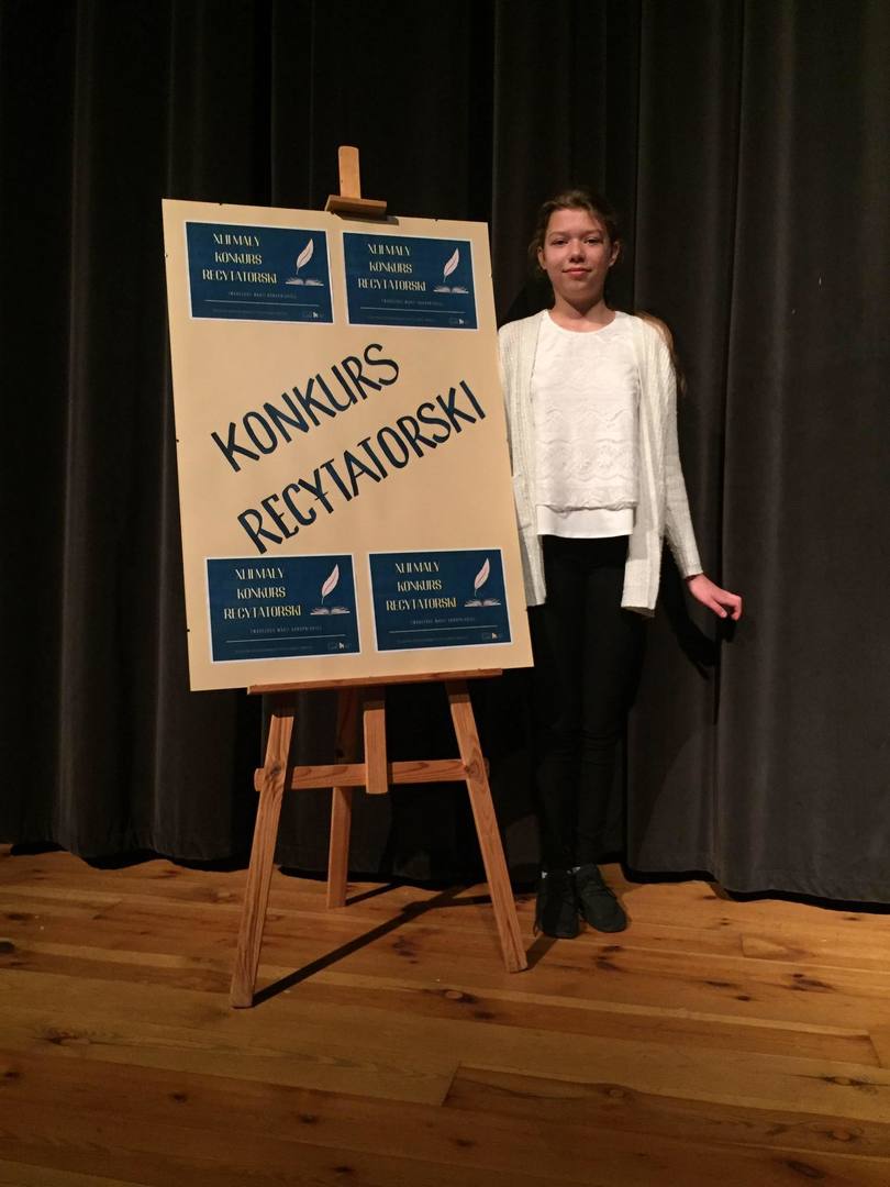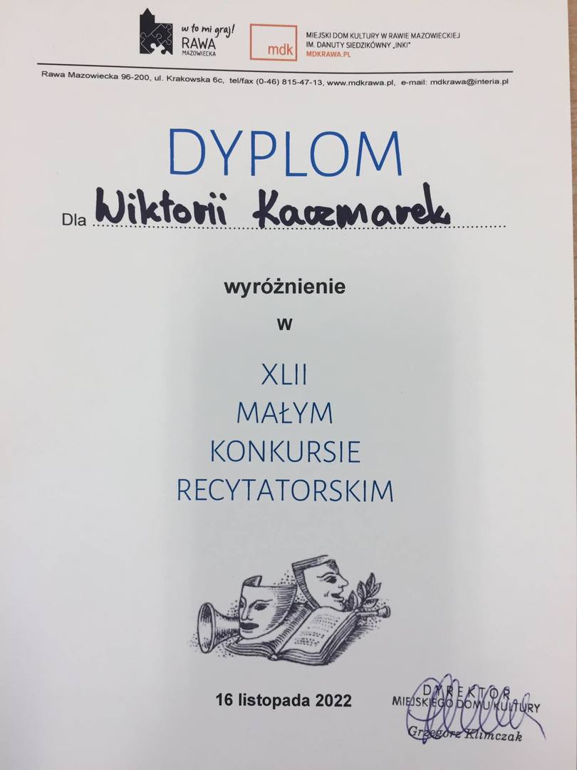 W dniu dzisiejszym dwie uczennice z klasy piątej wzięły udział w XLII Małym Konkursie Recytatorskim organizowanym przez Miejski Dom Kultury w Rawie Mazowieckiej. Uczestnicy prezentowali utwory Marii Konopnickiej. Nasze piątoklasistki: Joanna Kłoczko i Wiktoria Kaczmarek wykazały się ogromną wrażliwością i dojrzałą interpretacją wierszy: „Chodziły tu Niemce...” i „Przed sądem”. Prezentacja Wiktorii Kaczmarek zdobyła uznanie jury. Wiktoria otrzymała wyróżnienie w kategorii klas IV-VI. Uczennice do konkursu przygotowała p. Renata Lipska. Gratulujemy i życzymy kolejnych sukcesów