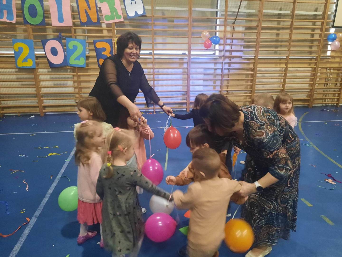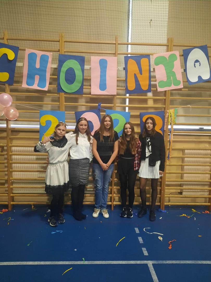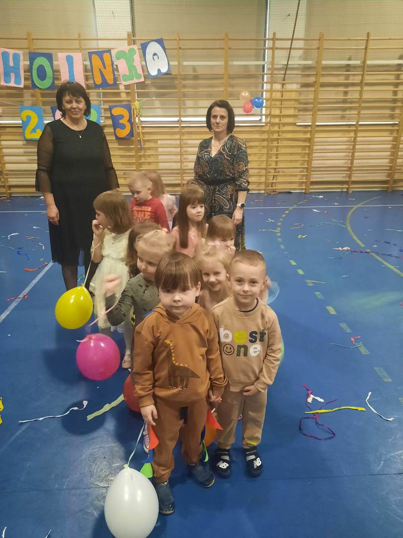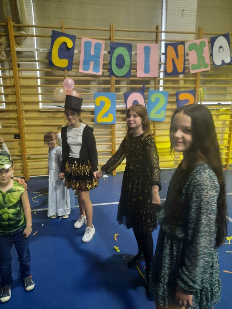 Tradycyjnie przed zimowymi feriami odbyła się w naszej szkole choinka noworoczna. W pięknie udekorowanej sali przy dźwiękach muzyki bawili się wychowankowie szkoły podstawowej oraz przedszkolaki. Jak przystało na prawdziwy bal, najmłodsi uczestnicy zabawy byli przebrani w karnawałowe stroje. Wspólnie z dziećmi bawili się rodzice i grono pedagogiczne. Dodatkową atrakcją były wspólne zabawy i konkursy przygotowane przez panie animatorki. Oprócz świetnej zabawy przy muzyce, uczniowie zjedli pyszny poczęstunek przygotowany przez rodziców. Zabawa choinkowa przebiegała w przyjaznej atmosferze i dostarczyła wielu wspaniałych wrażeń.
