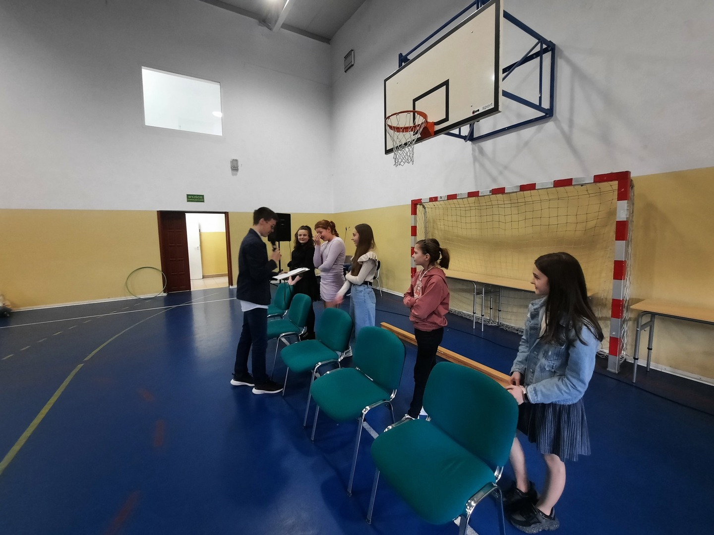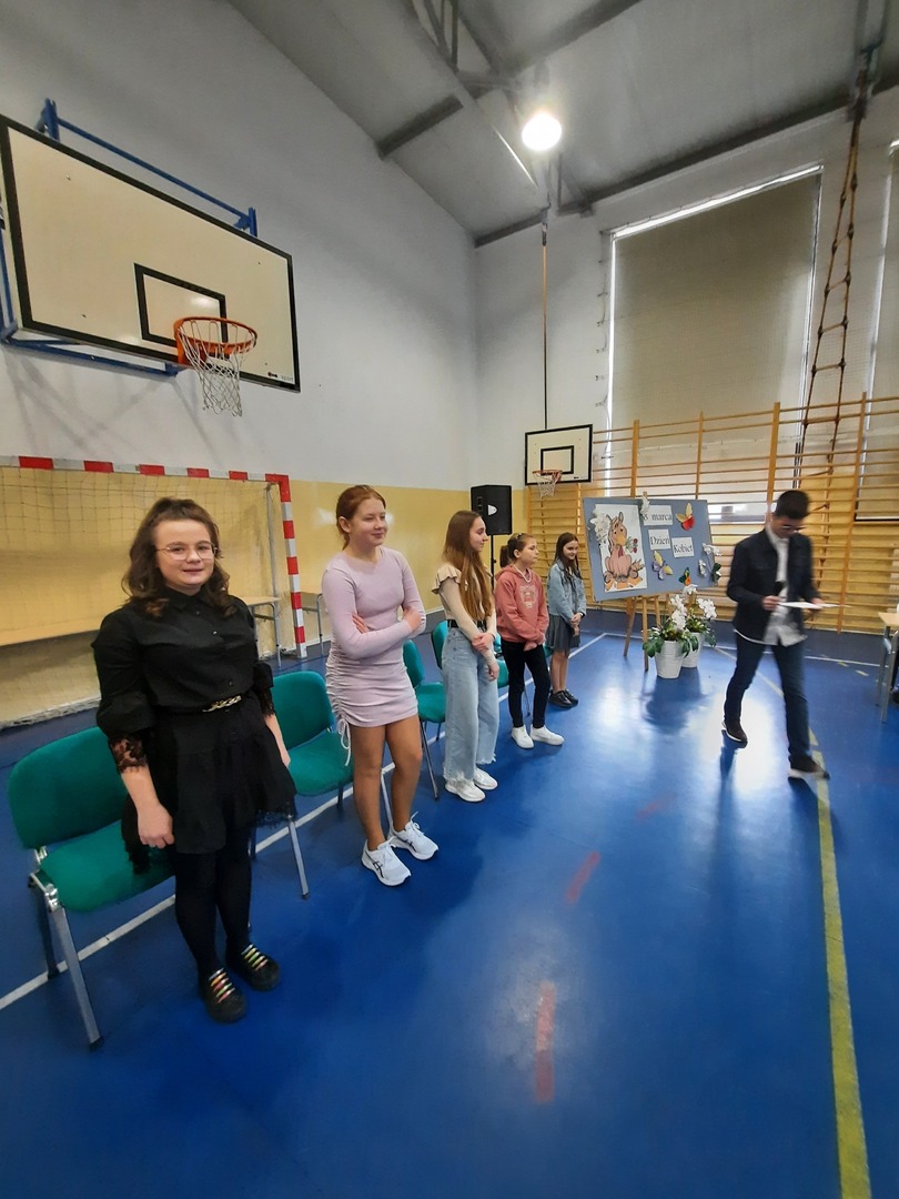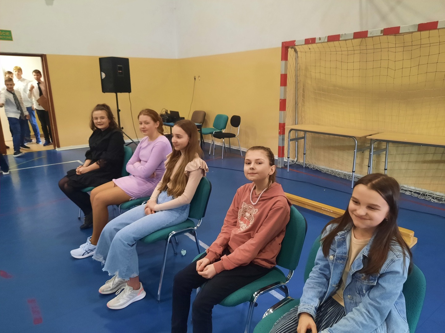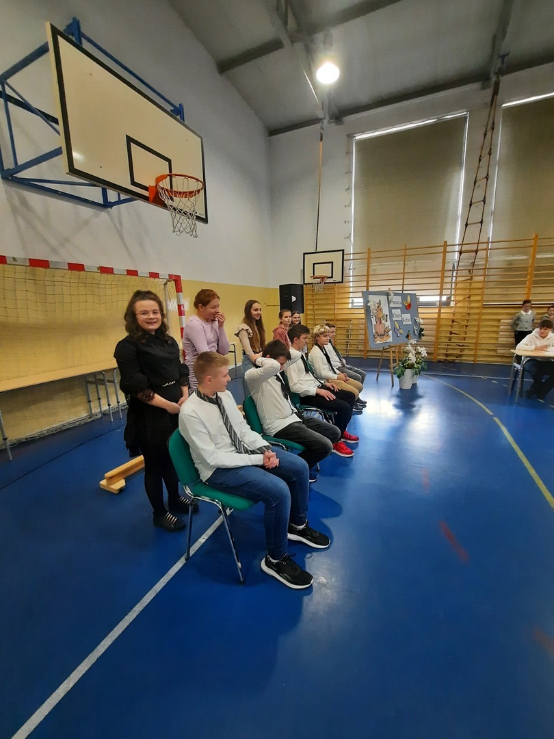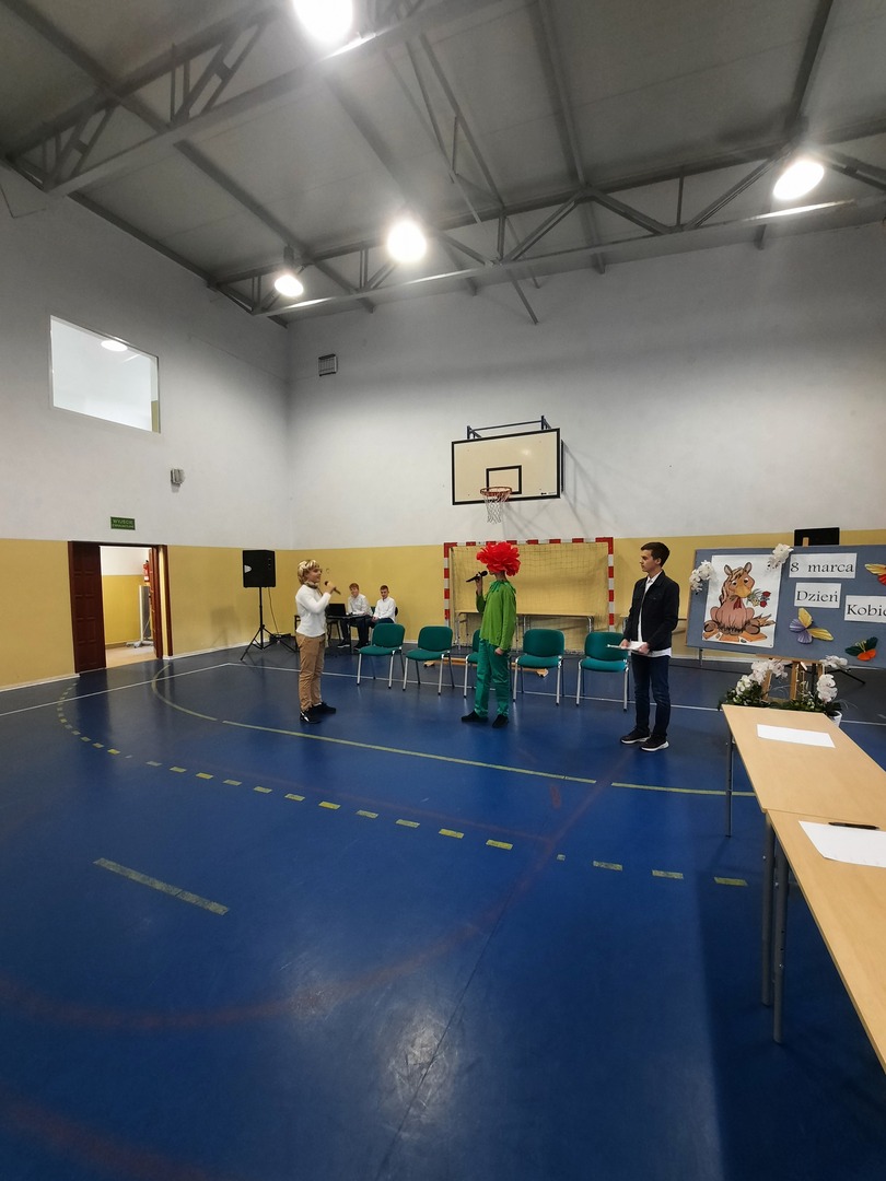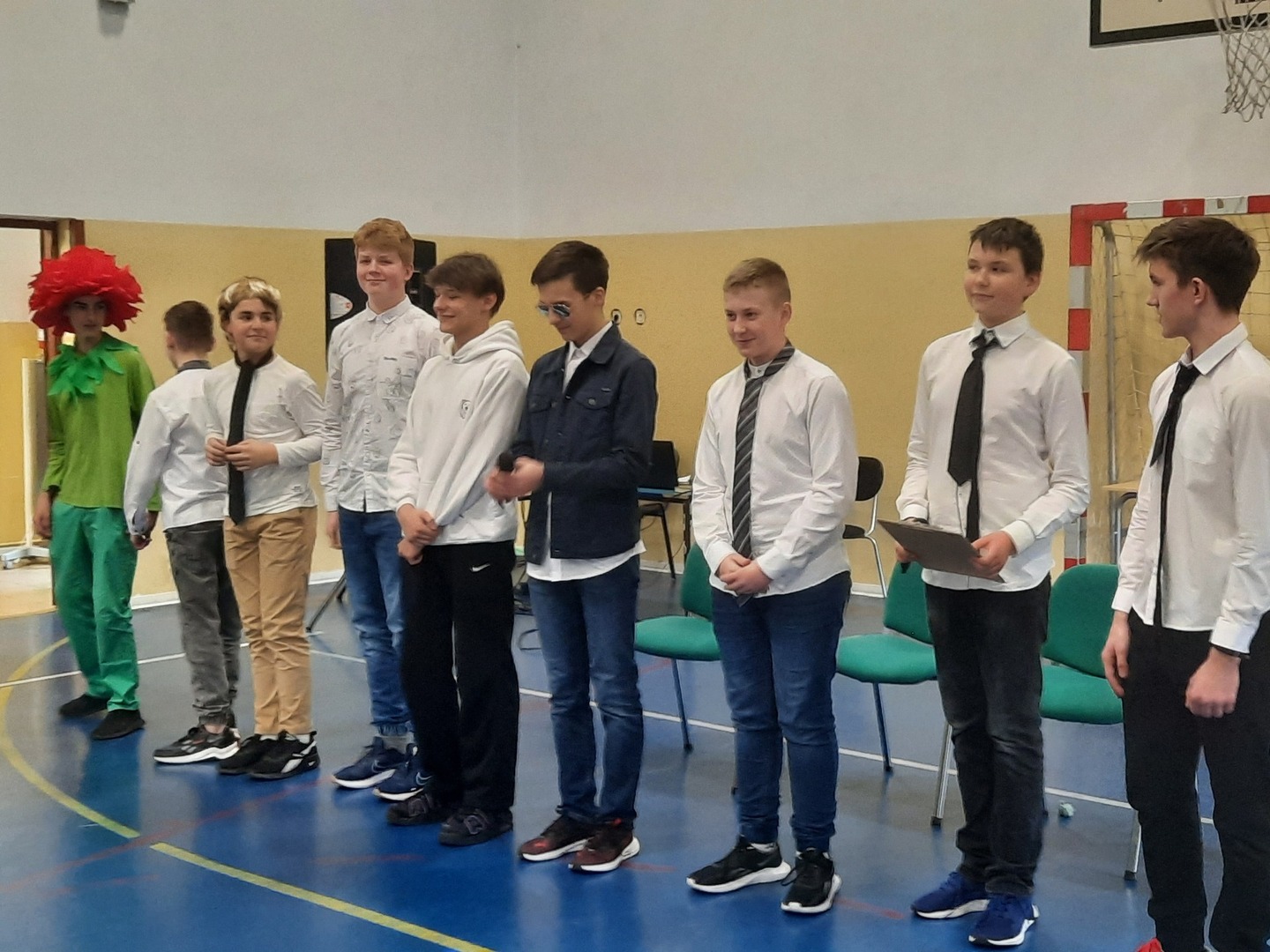 Następnie chłopcy z klasy ośmej recytowali wiesze dedykowane dla małych i dużych kobiet. Kolejnym punktem programu było zaproszenie do wspólnej zabawy po jednej dziewczynce z klas IV - VIII. Dziewczynki brały udział w różnych konkurencjach m.in. wiązanie krawata, kręcenie hula – hop, czy jedzeniu na czas babeczki z kremem, które miały na cale wyłonienie najfajniejszej dziewczyny w szkole. Chłopcy zostali jurorami na czele z panem dyrektorem M. Bazylakiem. Wszyscy bawili się dobrze, publiczność biła brawa , a komisja konkursowa przyznała tytuł „super – dziewczyny” - Oliwii Pietrzyk z klasy 5. Po zabawach młode damy zostały obdarowane przez naszych dżentelmenów słodkim upominkami, które sprawiły dużą radość. Występ przygotował p. Zbigniew Stępniak wraz z chłopcami z klasy 8. Klasowe imprezy z okazji tego święta odbyły się w różnych dniach dogodnych dla danej klasy.