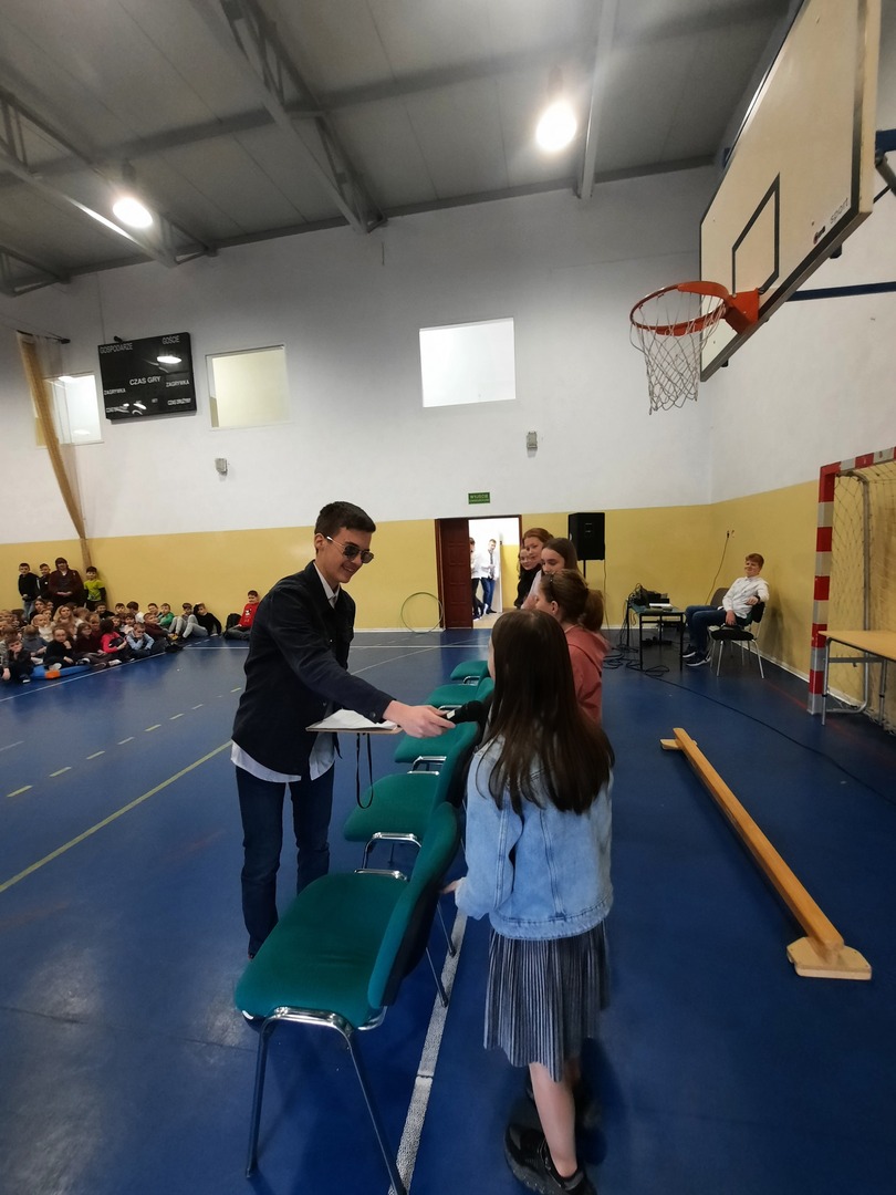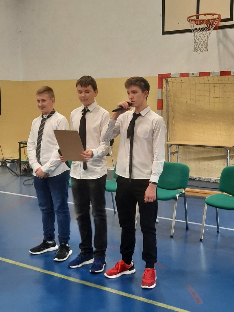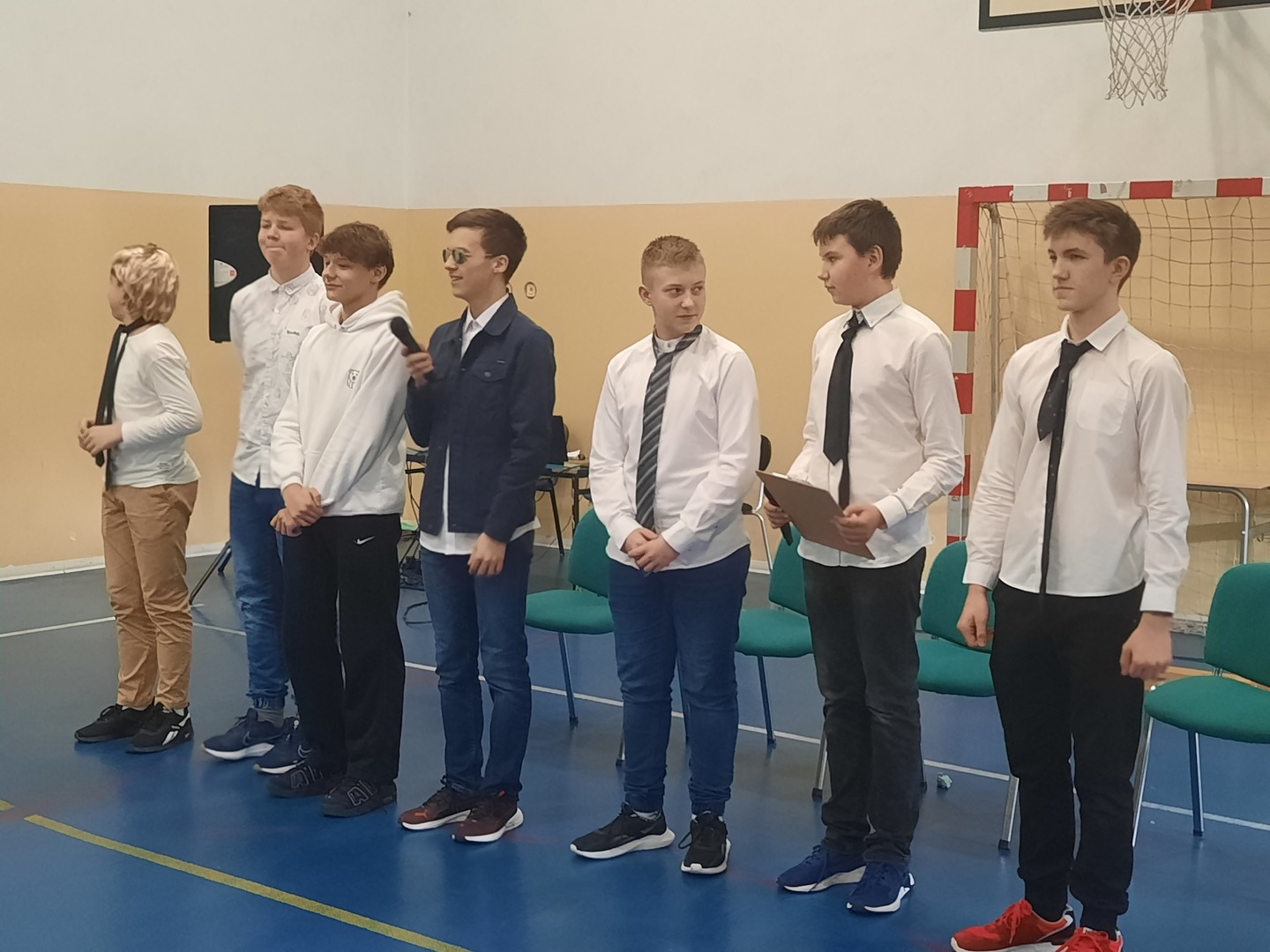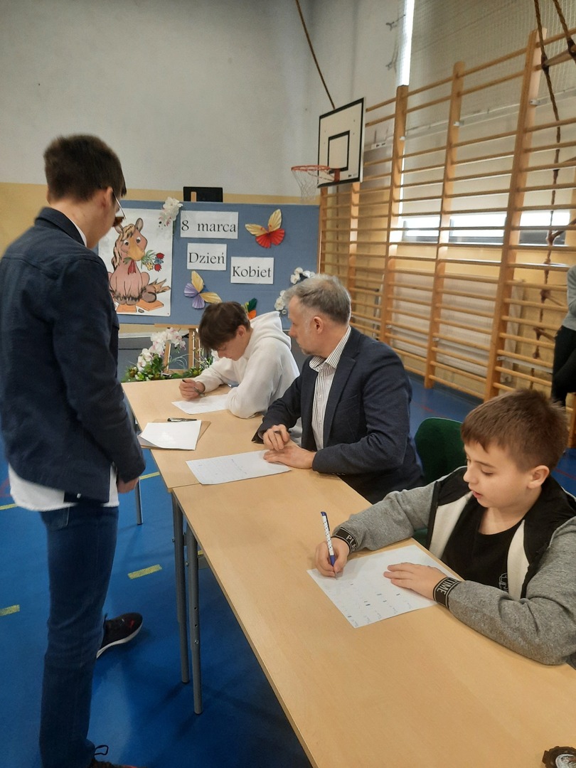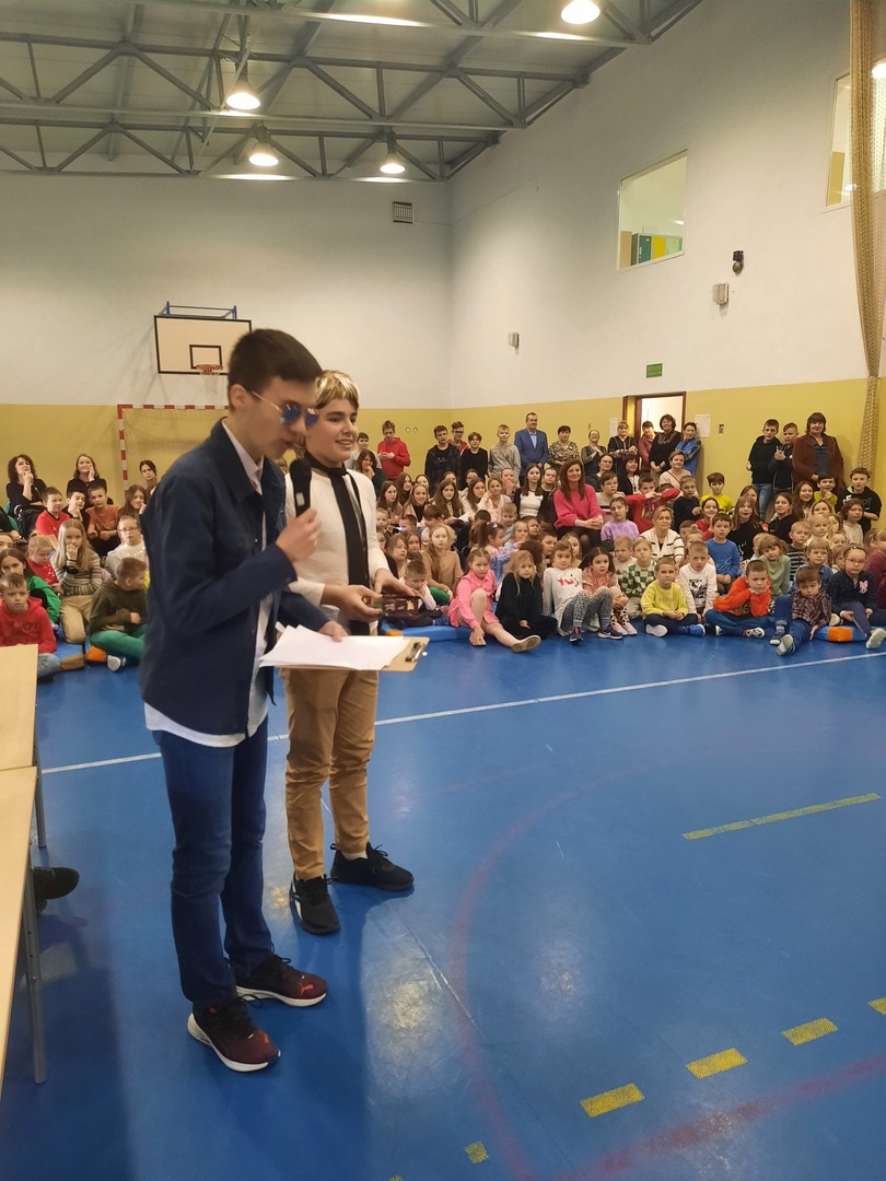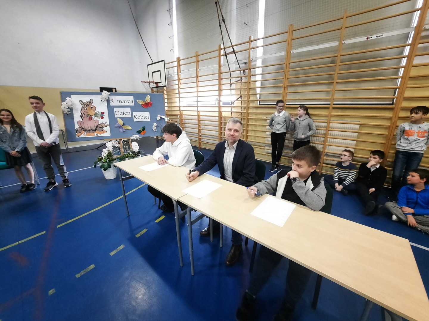 Następnie chłopcy z klasy ośmej recytowali wiesze dedykowane dla małych i dużych kobiet. Kolejnym punktem programu było zaproszenie do wspólnej zabawy po jednej dziewczynce z klas IV - VIII. Dziewczynki brały udział w różnych konkurencjach m.in. wiązanie krawata, kręcenie hula – hop, czy jedzeniu na czas babeczki z kremem, które miały na cale wyłonienie najfajniejszej dziewczyny w szkole. Chłopcy zostali jurorami na czele z panem dyrektorem M. Bazylakiem. Wszyscy bawili się dobrze, publiczność biła brawa , a komisja konkursowa przyznała tytuł „super – dziewczyny” - Oliwii Pietrzyk z klasy 5. Po zabawach młode damy zostały obdarowane przez naszych dżentelmenów słodkim upominkami, które sprawiły dużą radość. Występ przygotował p. Zbigniew Stępniak wraz z chłopcami z klasy 8. Klasowe imprezy z okazji tego święta odbyły się w różnych dniach dogodnych dla danej klasy.