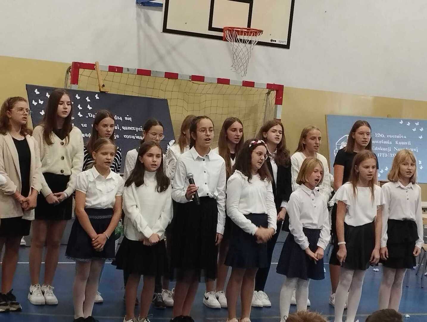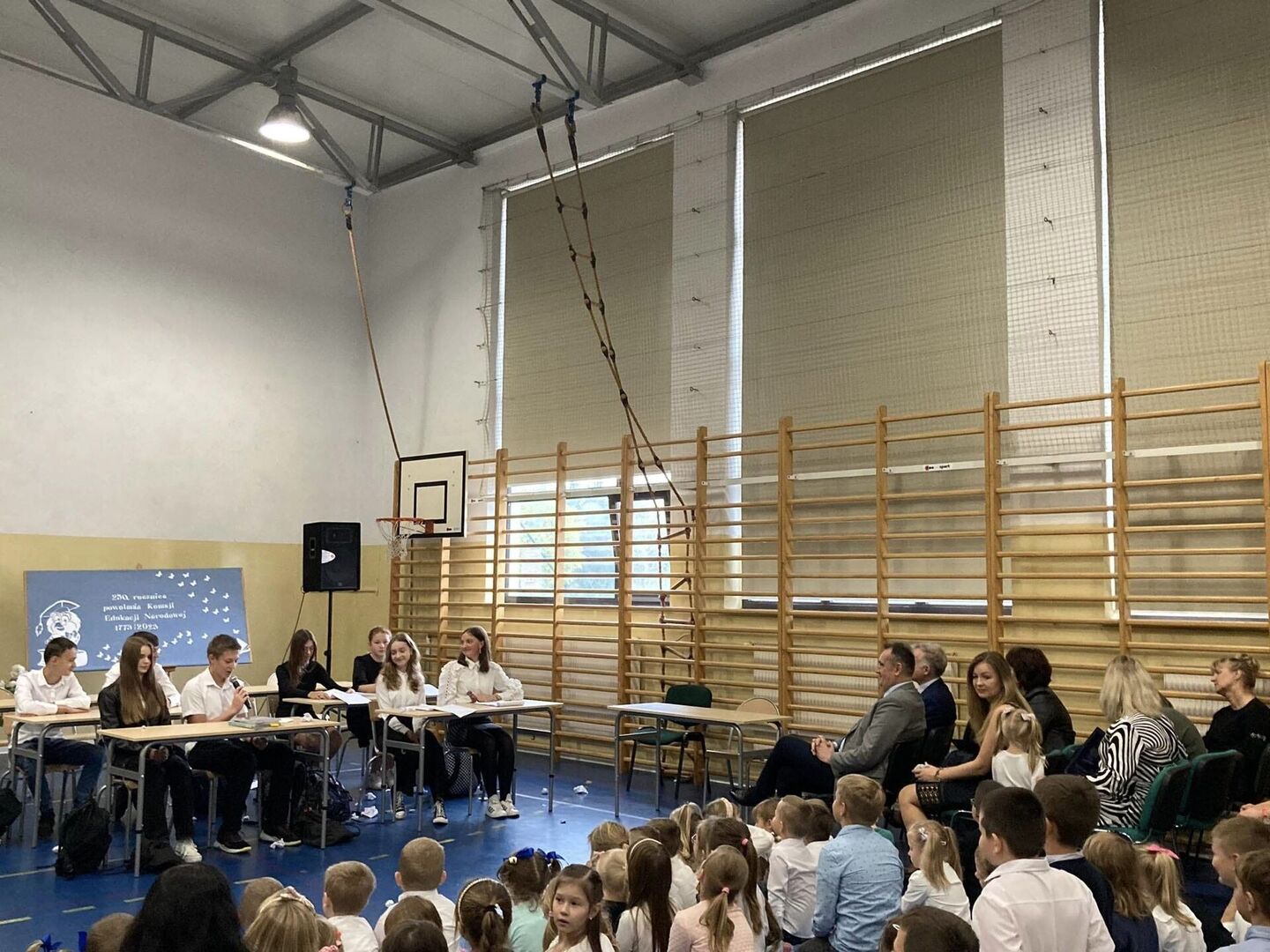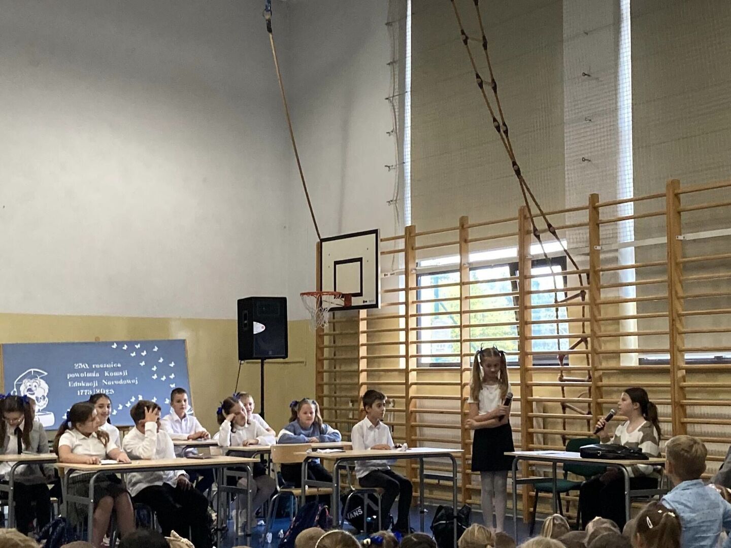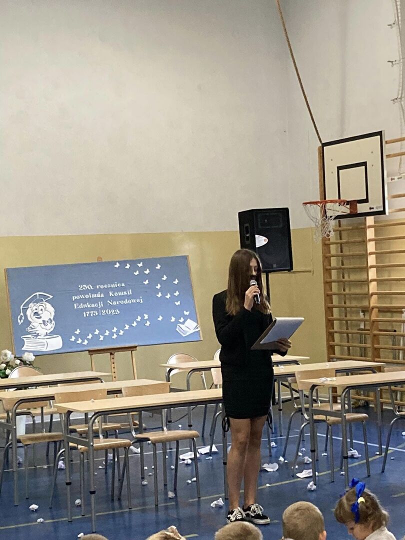 13 października 2023 obchodziliśmy 250. rocznicę powstania Komisji Edukacji Narodowej. W naszej szkole był to dzień pełen pozytywnych wzruszeń. O godzinie 9.15 zgromadzonych na uroczystości powitał Pan Dyrektor – Mariusz Muszyński. Po odśpiewaniu hymnu, przyszedł czas na występy artystyczne uczniów. Przedstawienie przygotowali uczniowie klasy 5 i 8 pod nadzorem Joanny Jędrzejczyk. Dzieci z młodszych klas śpiewały piosenki. Wiele ciepłych i miłych życzeń popłynęło w kierunku naszych nauczycieli. Na zakończenie akademii, uczniowie zaśpiewali swoim nauczycielom „Sto lat” i rozdały słodkie upominki przygotowane przez Radę Rodziców.