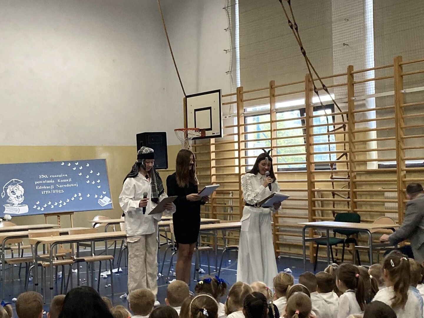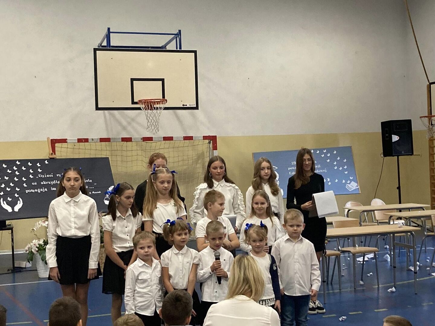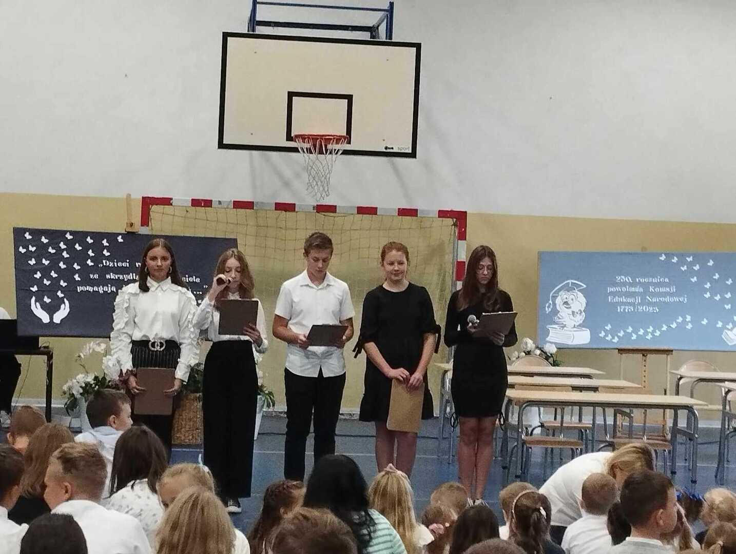 13 października 2023 obchodziliśmy 250. rocznicę powstania Komisji Edukacji Narodowej. W naszej szkole był to dzień pełen pozytywnych wzruszeń. O godzinie 9.15 zgromadzonych na uroczystości powitał Pan Dyrektor – Mariusz Muszyński. Po odśpiewaniu hymnu, przyszedł czas na występy artystyczne uczniów. Przedstawienie przygotowali uczniowie klasy 5 i 8 pod nadzorem Joanny Jędrzejczyk. Dzieci z młodszych klas śpiewały piosenki. Wiele ciepłych i miłych życzeń popłynęło w kierunku naszych nauczycieli. Na zakończenie akademii, uczniowie zaśpiewali swoim nauczycielom „Sto lat” i rozdały słodkie upominki przygotowane przez Radę Rodziców.