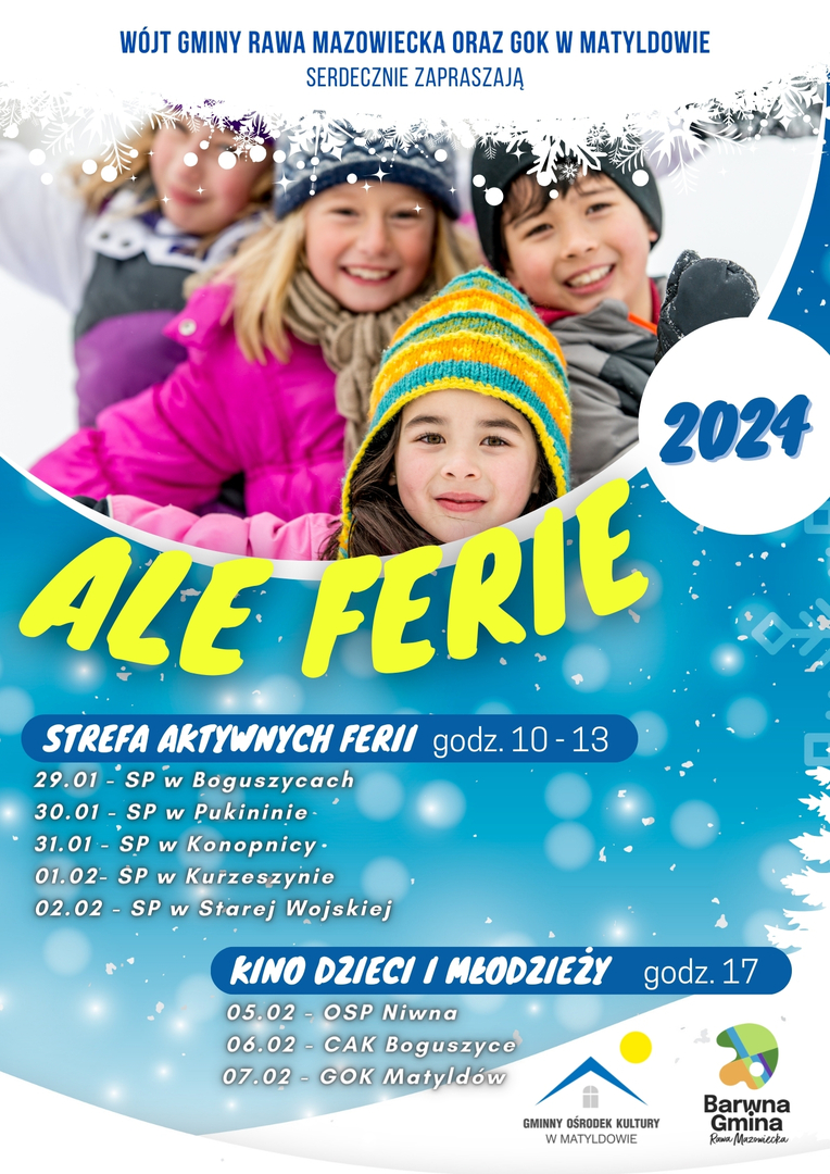 Wójt Gminy Rawa Mazowiecka, Dyrekcja Szkoły oraz GOK w Matyldowie zapraszają uczniów do Strefy Aktywnych Ferii, która zagości w naszej szkole w dniu 29.01.2024 r. w godz. 10-13. Wszyscy, którzy tego dnia przybędą na szkolną halę sportową będą mogli skorzystać z kilku dmuchanych atrakcji, wśród których nie zabraknie m.in. zjeżdżalni i toru przeszkód. Jesteśmy przekonani, że chwile aktywności fizycznej z elementami rywalizacji to bardzo dobra propozycja na rozpoczęcie udanych ferii.