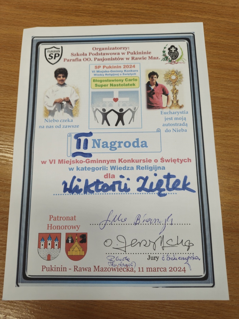 11 marca 2024 roku w Szkołe Podstawowej w Pukininie odbył się VI Miejsko - Gminny Konkurs o Świętych. Wzięło w nim udział 20 osób z różnych szkół terenu Gminy oraz z miasta Rawy Mazowieckiej. Naszą szkołe reprezentowały: Wiktoria Ziętek i Kinga Kucharska. Wiktoria Ziętek zajęła II miejsce, natomiast Kinga Kucharska została wyróżniona. Opiekunem uczestników był Pani Joanna Piekarek. Konkurs składał się z dwóch części, trwających łącznie 30 minut. Po konkursie uczniowie z koła teatralnego SP Pukinin wystawili przedstawienie pt. "Królewna Śnieżka". Następnie odbył się obiad, po którym uczestnicy mieli okazję zabawić się z robotami. Na zakończenie odbył się występ szkolnego chóru, ogłoszenie wyników, wręczenie nagród oraz podziękowania.