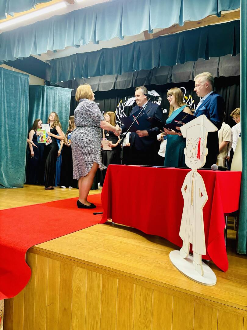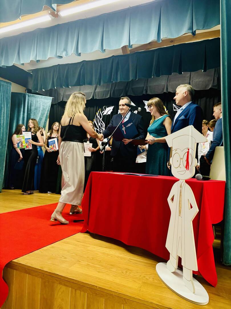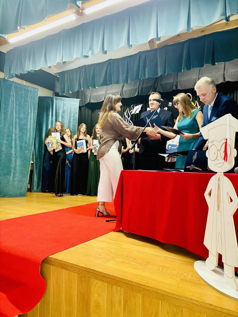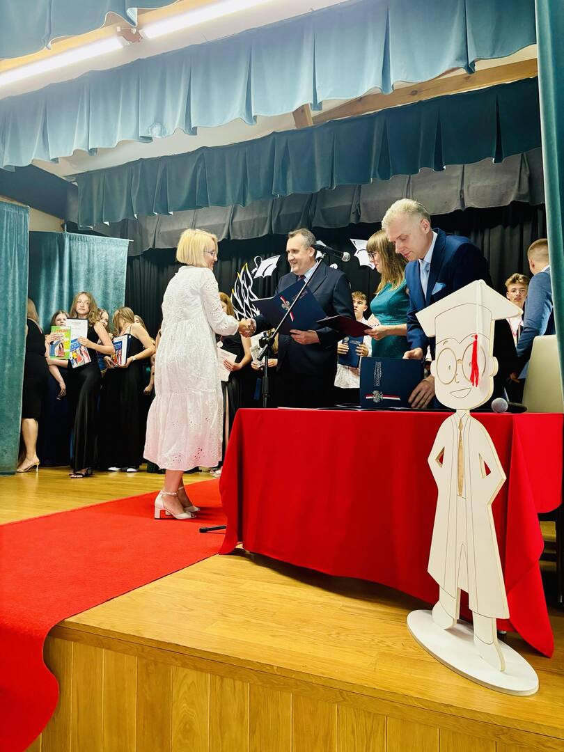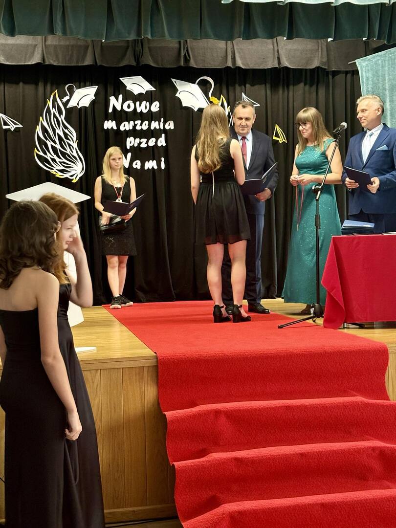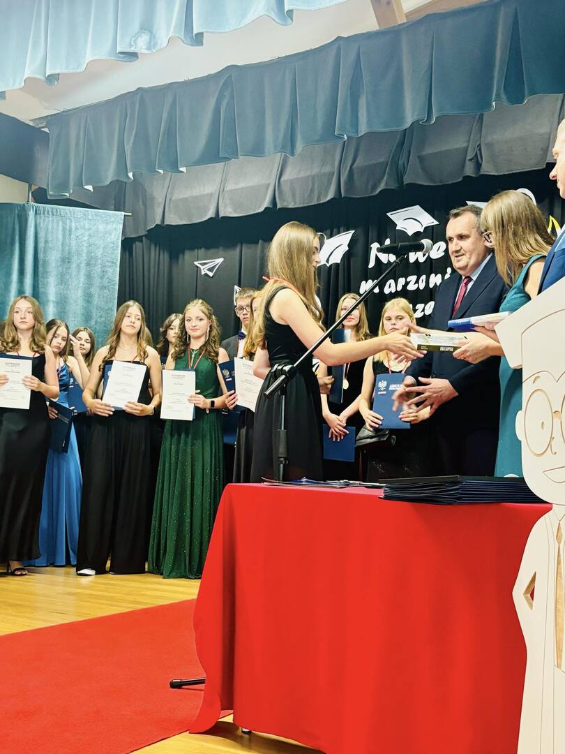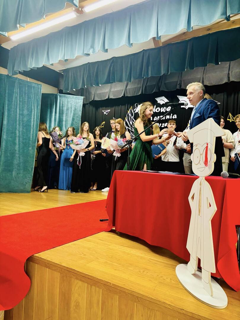 Kolejnym punktem programu było rozdanie dyplomów absolwentom, nagród oraz stypendiów za bardzo dobre wyniki w nauce i wzorowe zachowanie. Nie zabrakło również podziękowań dla rodziców. Po oficjalnej części uczniowie zaprezentowali humorystyczne przedstawienie, które dostarczyło wszystkim wiele radości i śmiechu.