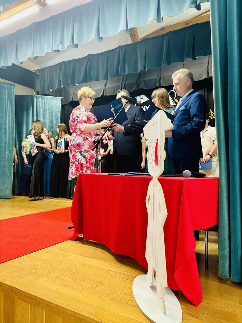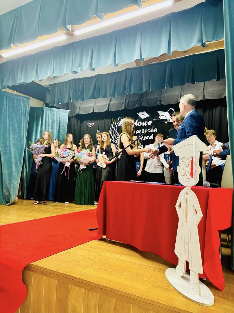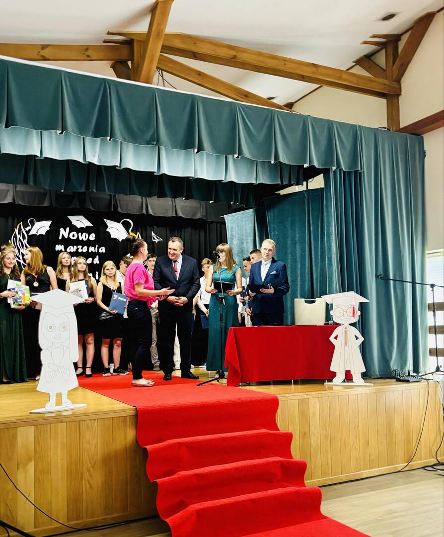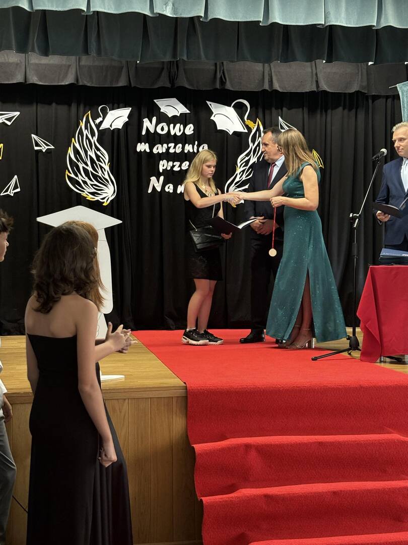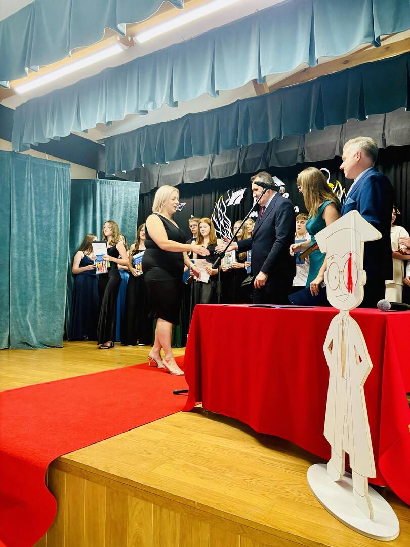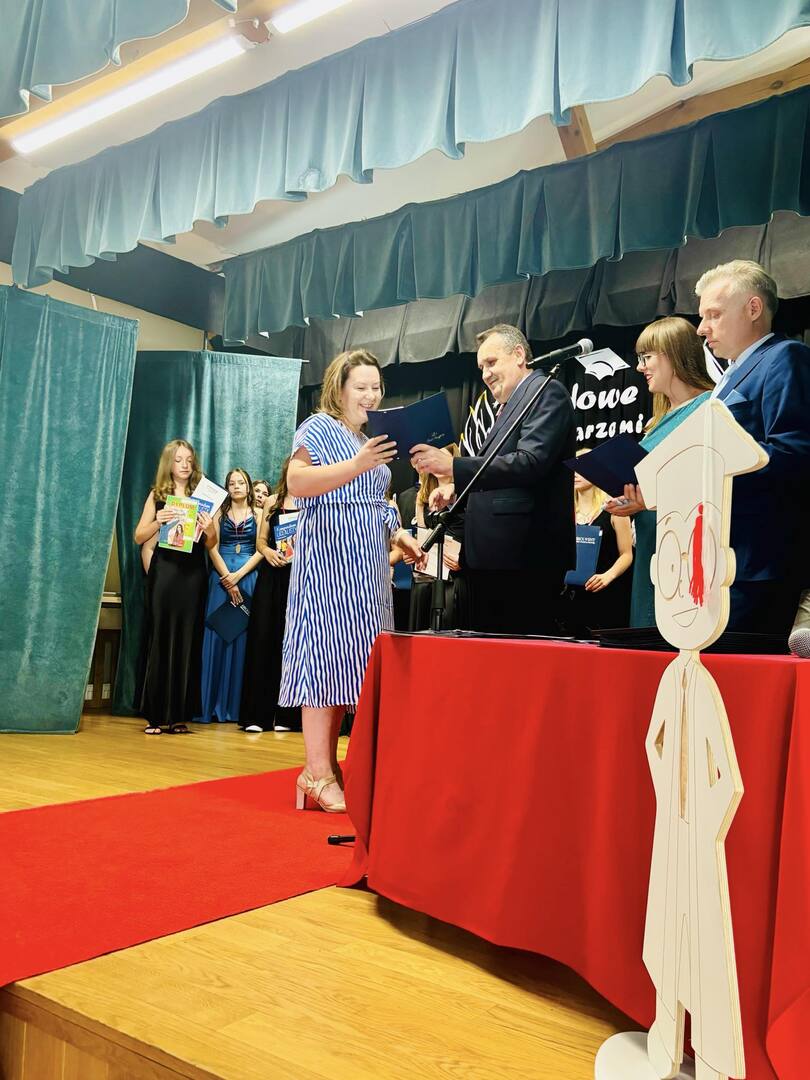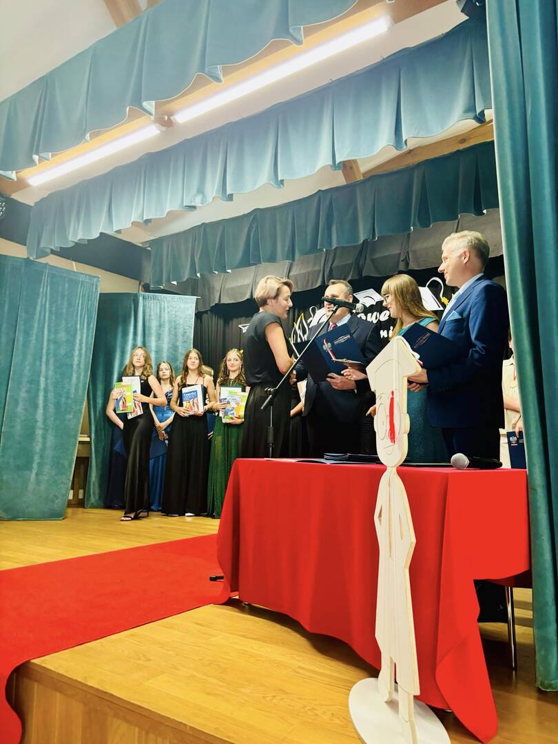 Kolejnym punktem programu było rozdanie dyplomów absolwentom, nagród oraz stypendiów za bardzo dobre wyniki w nauce i wzorowe zachowanie. Nie zabrakło również podziękowań dla rodziców. Po oficjalnej części uczniowie zaprezentowali humorystyczne przedstawienie, które dostarczyło wszystkim wiele radości i śmiechu.