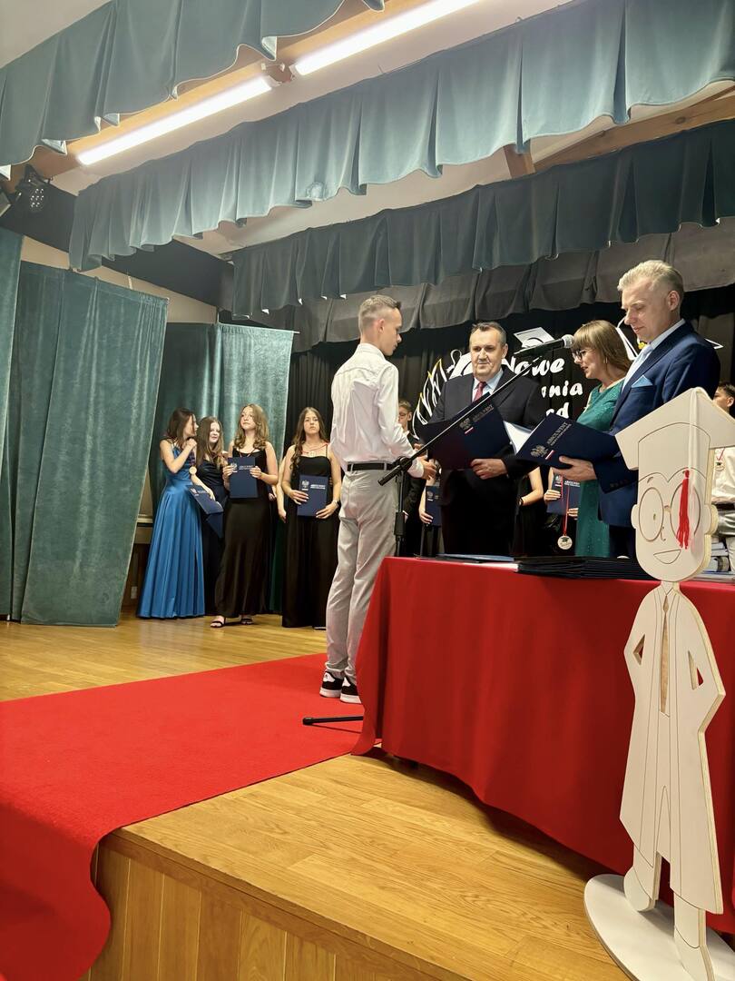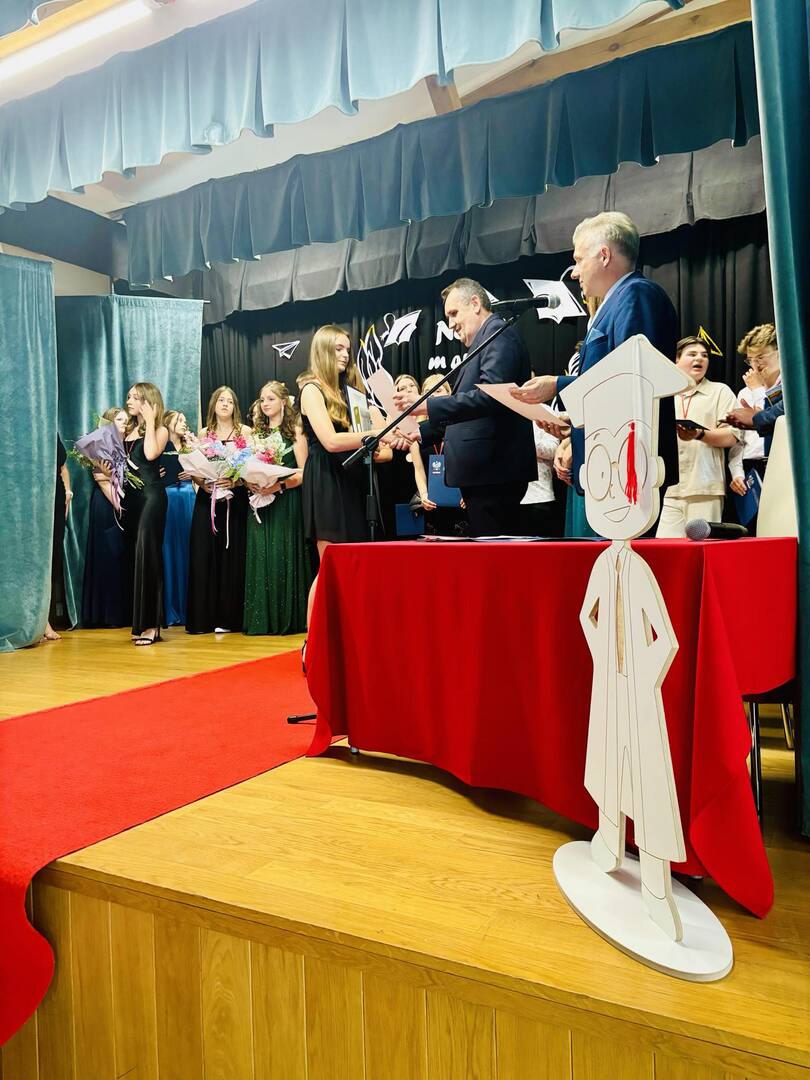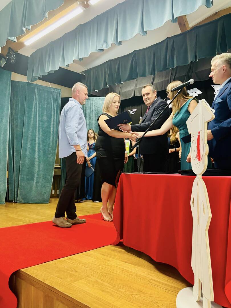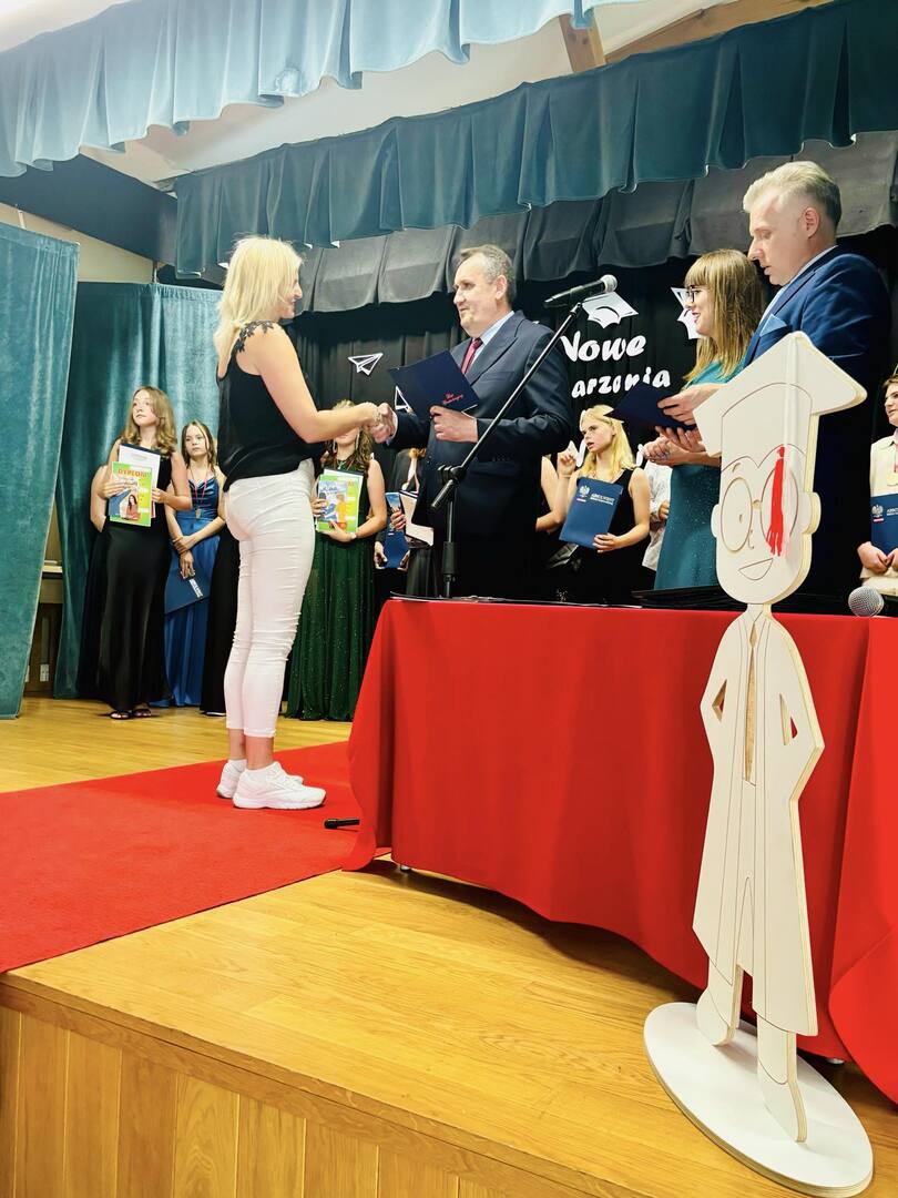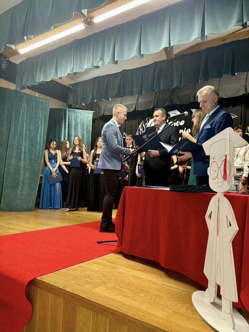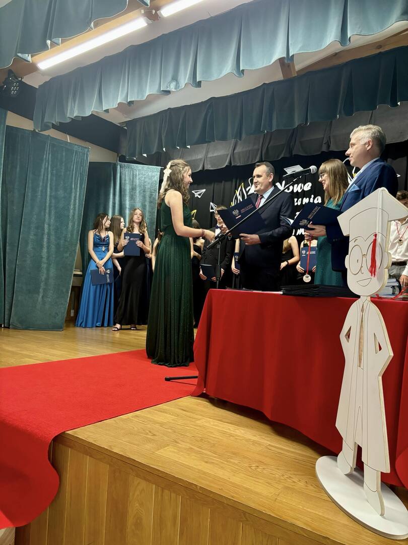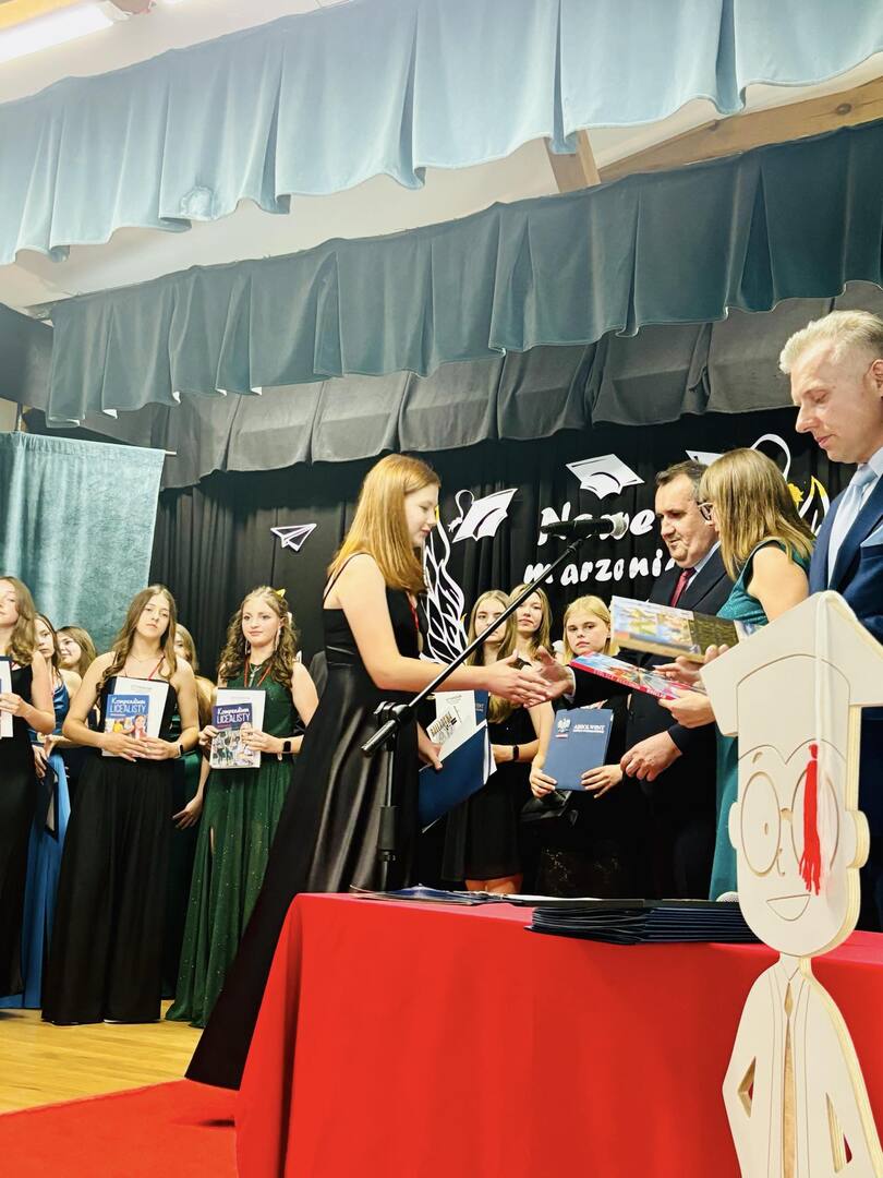 Kolejnym punktem programu było rozdanie dyplomów absolwentom, nagród oraz stypendiów za bardzo dobre wyniki w nauce i wzorowe zachowanie. Nie zabrakło również podziękowań dla rodziców. Po oficjalnej części uczniowie zaprezentowali humorystyczne przedstawienie, które dostarczyło wszystkim wiele radości i śmiechu.