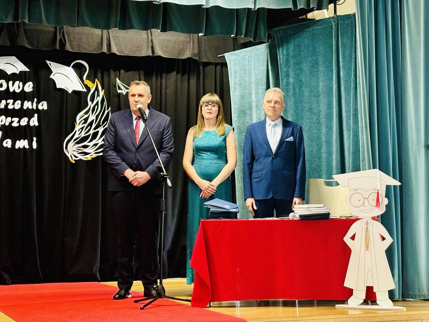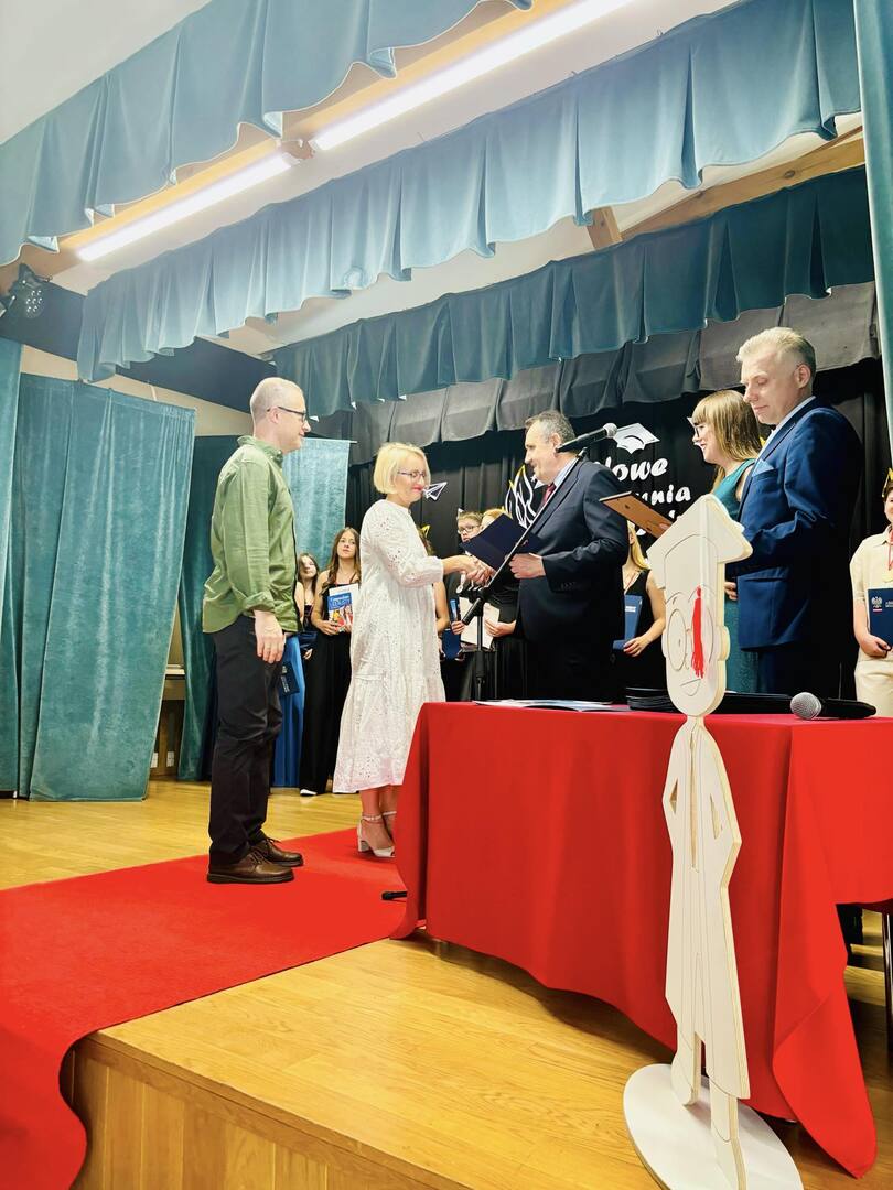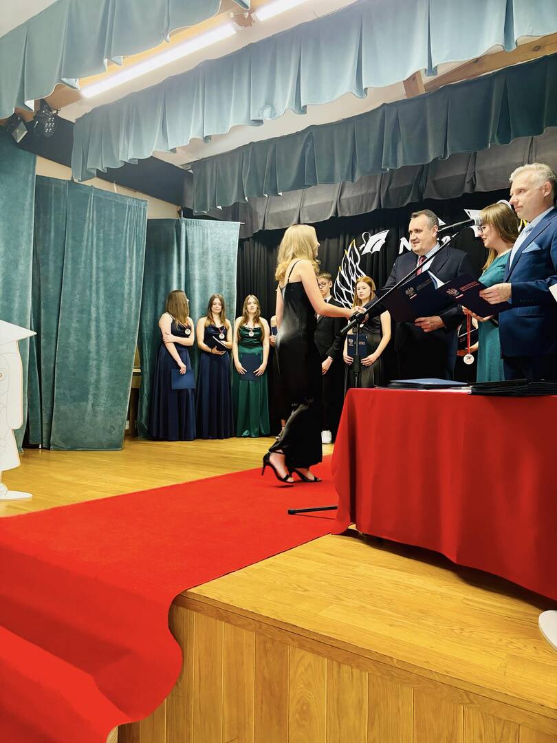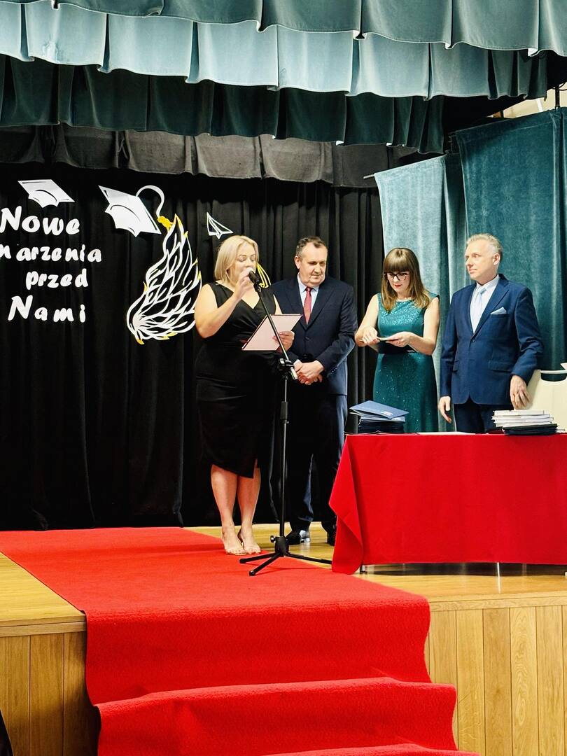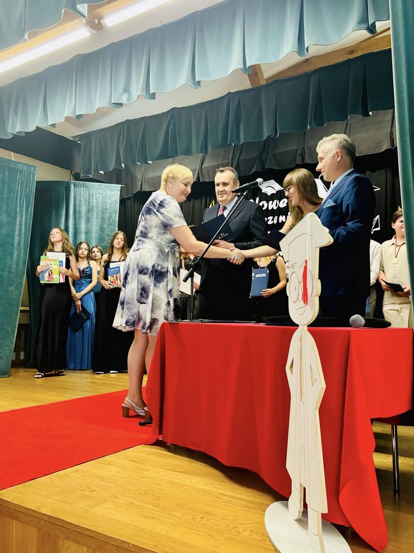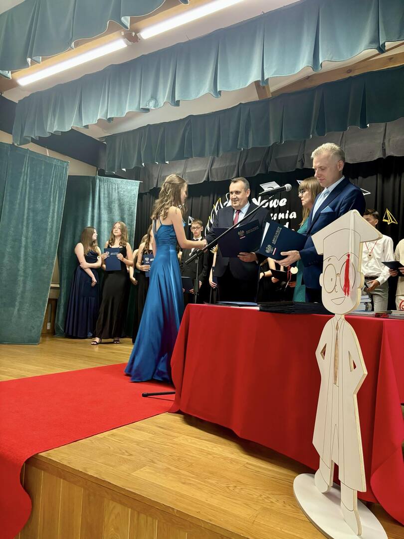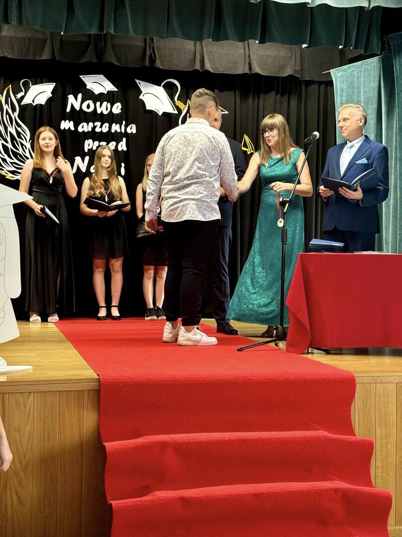 Kolejnym punktem programu było rozdanie dyplomów absolwentom, nagród oraz stypendiów za bardzo dobre wyniki w nauce i wzorowe zachowanie. Nie zabrakło również podziękowań dla rodziców. Po oficjalnej części uczniowie zaprezentowali humorystyczne przedstawienie, które dostarczyło wszystkim wiele radości i śmiechu.