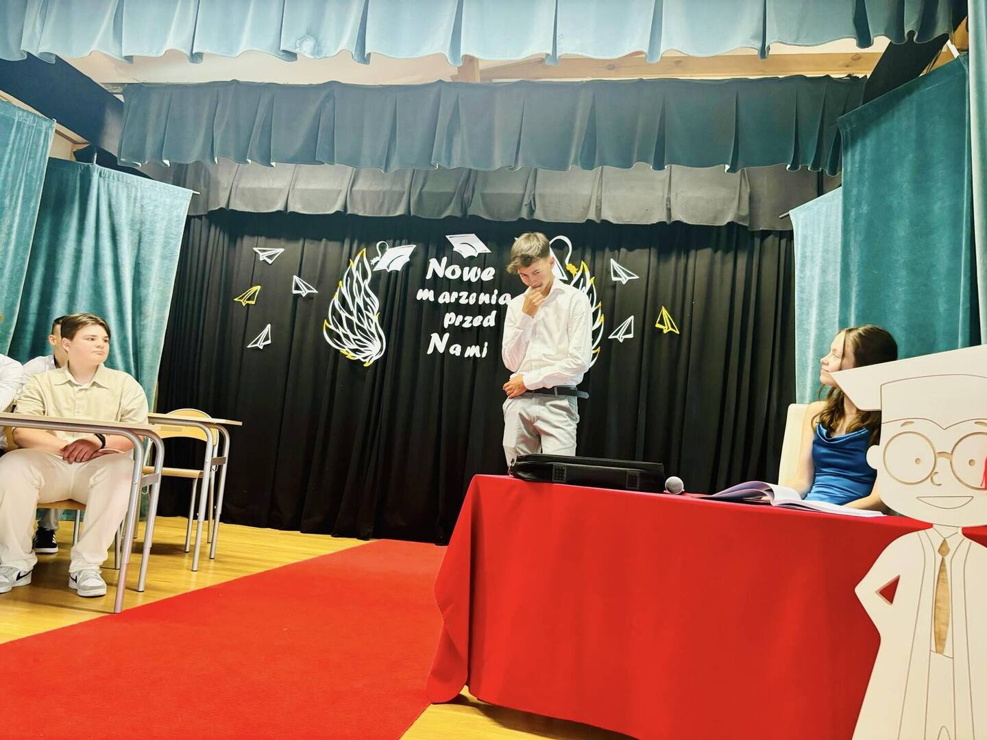 W środę, 19 czerwca 2024 roku, w Centrum Aktywności Kulturanej w Boguszycach odbyło się uroczyste zakończenie roku szkolnego klasy 8. Uroczystość rozpoczął dyrektor szkoły p. Mariusz Muszyński, witając zgromadzonych uczniów, nauczycieli oraz rodziców. Następnie miały miejsce przemówienia, w tym wystąpienie wychowawczyni p. Kamili Stańdo, która pożegnała absolwentów, podkreślając ich osiągnięcia oraz życząc im dalszych sukcesów.