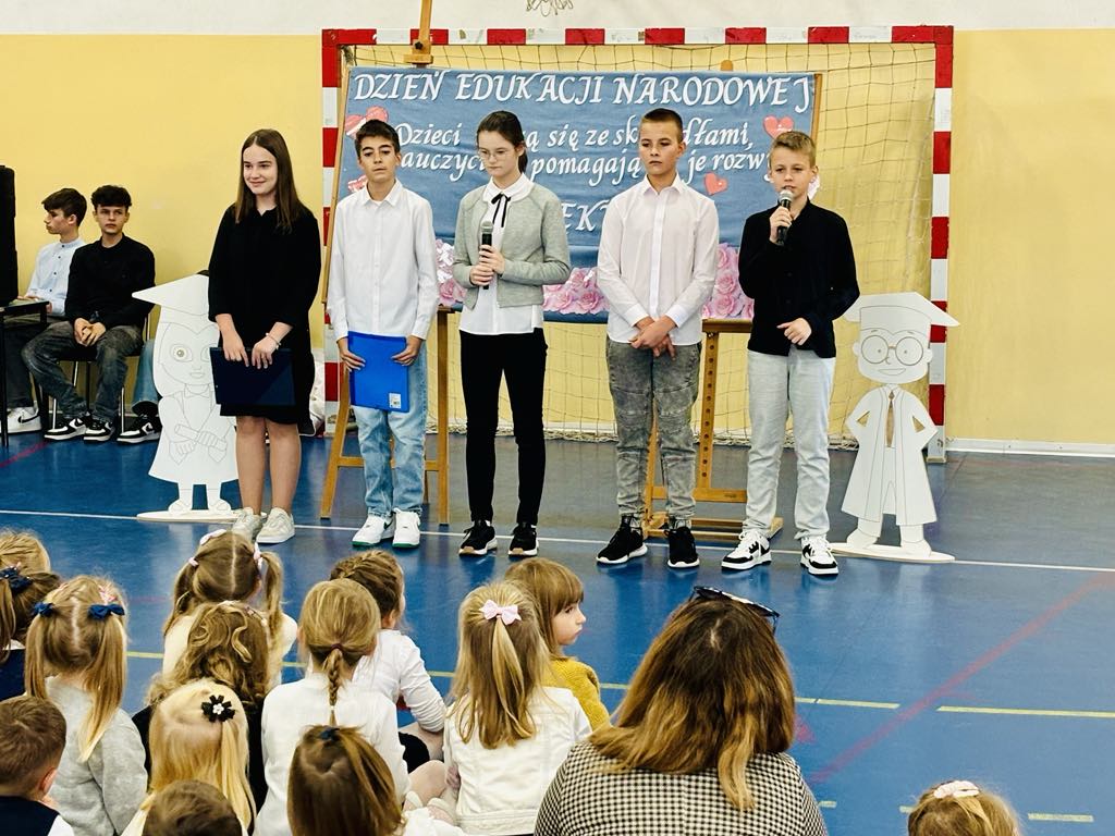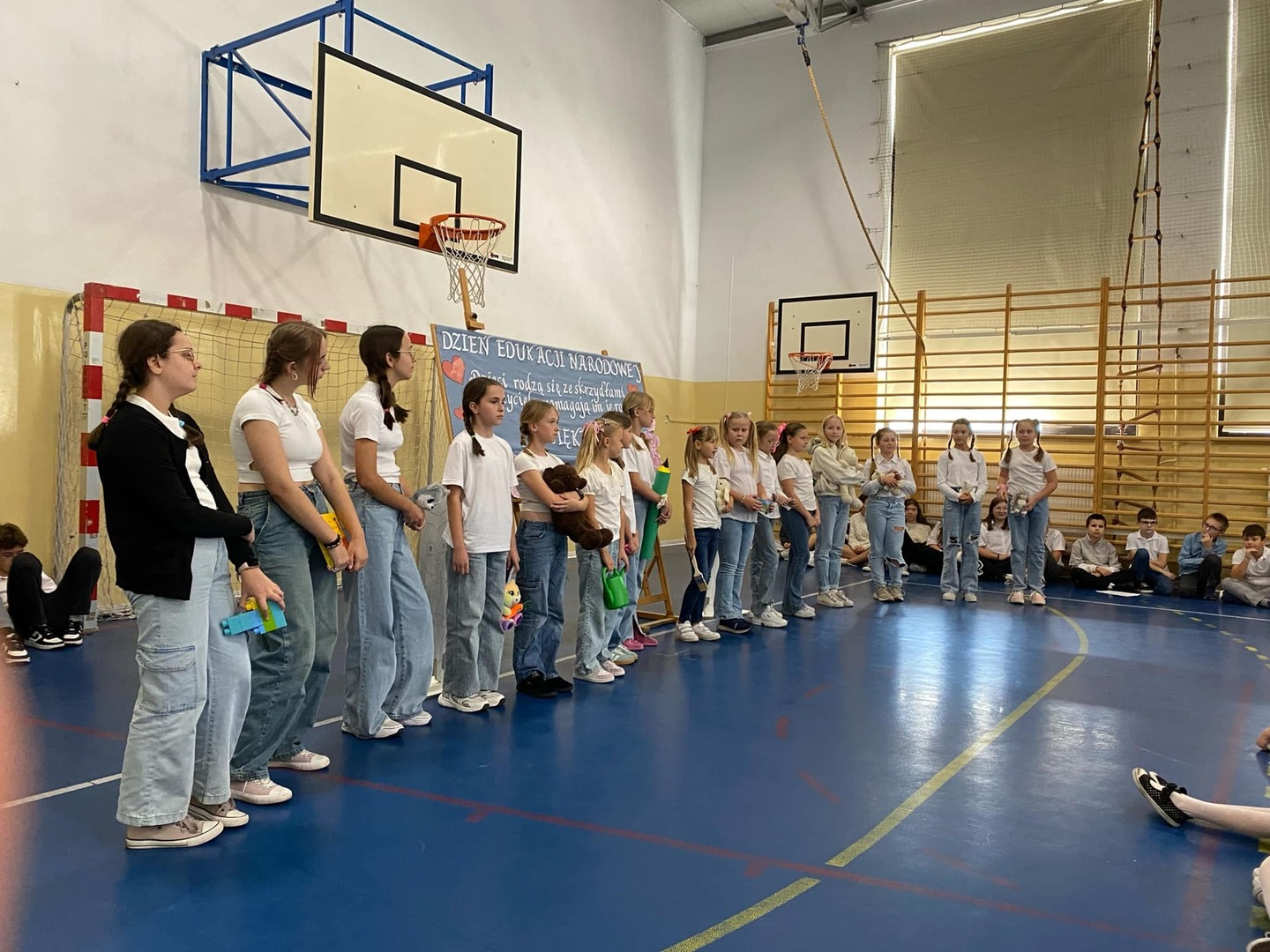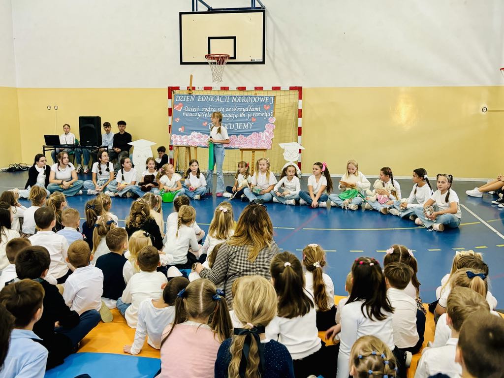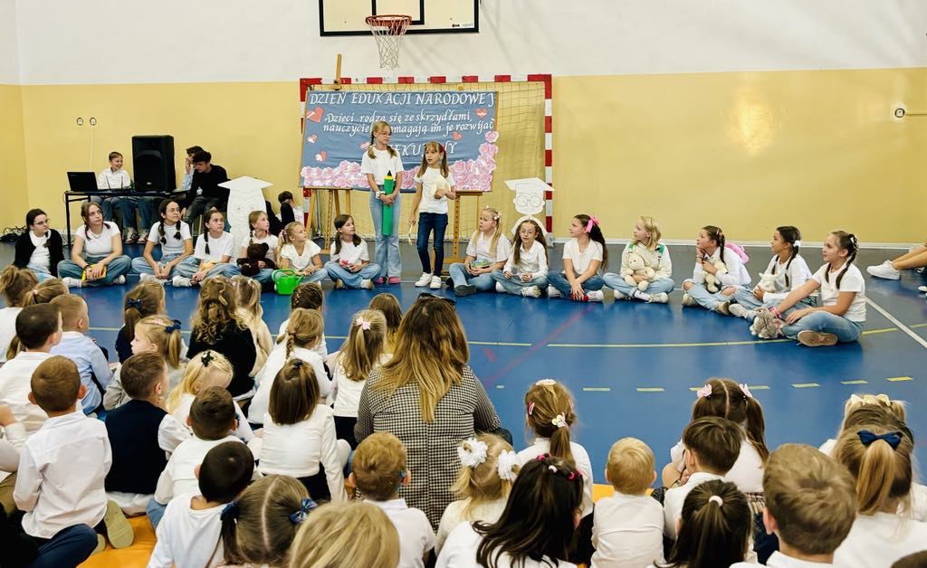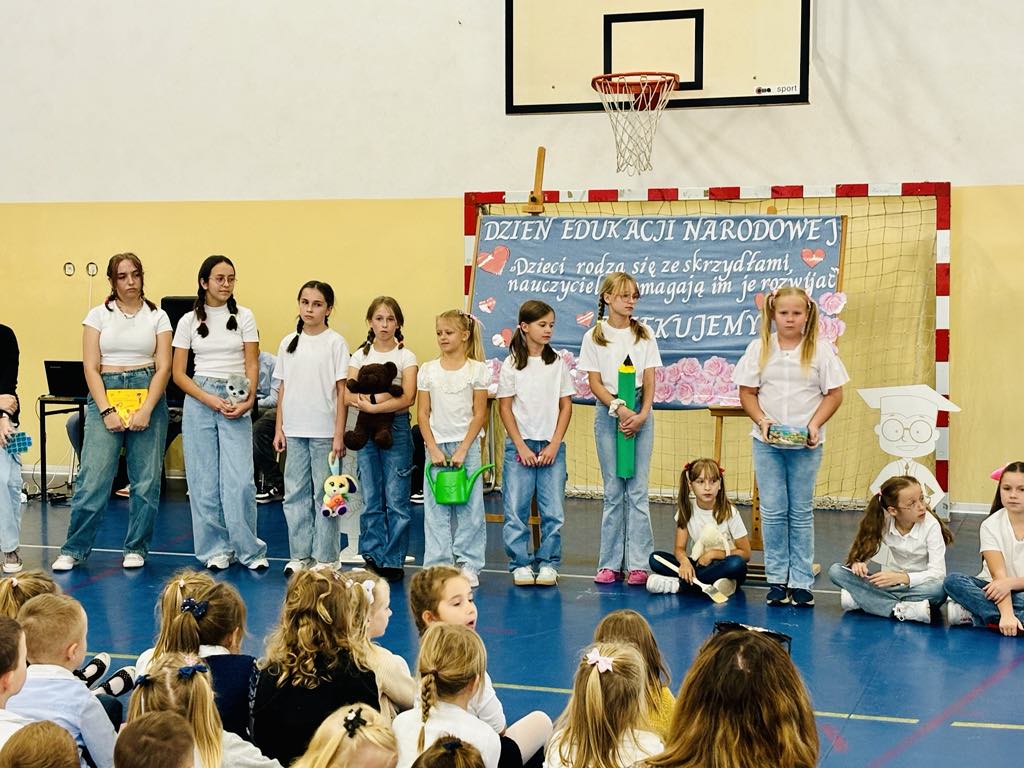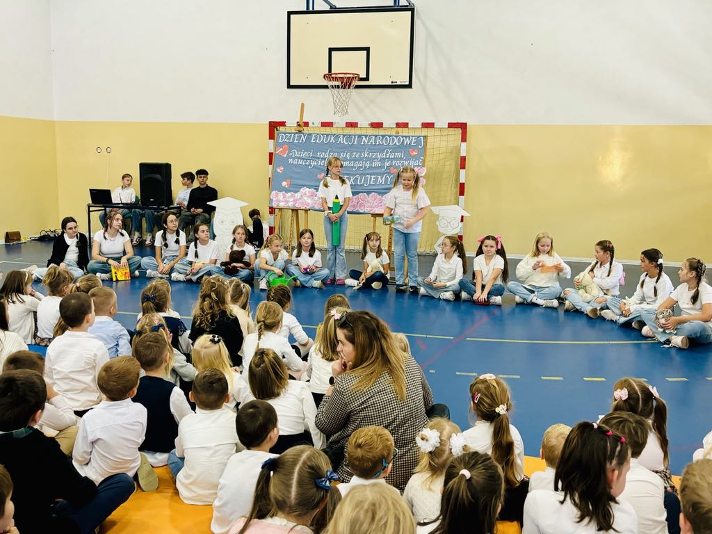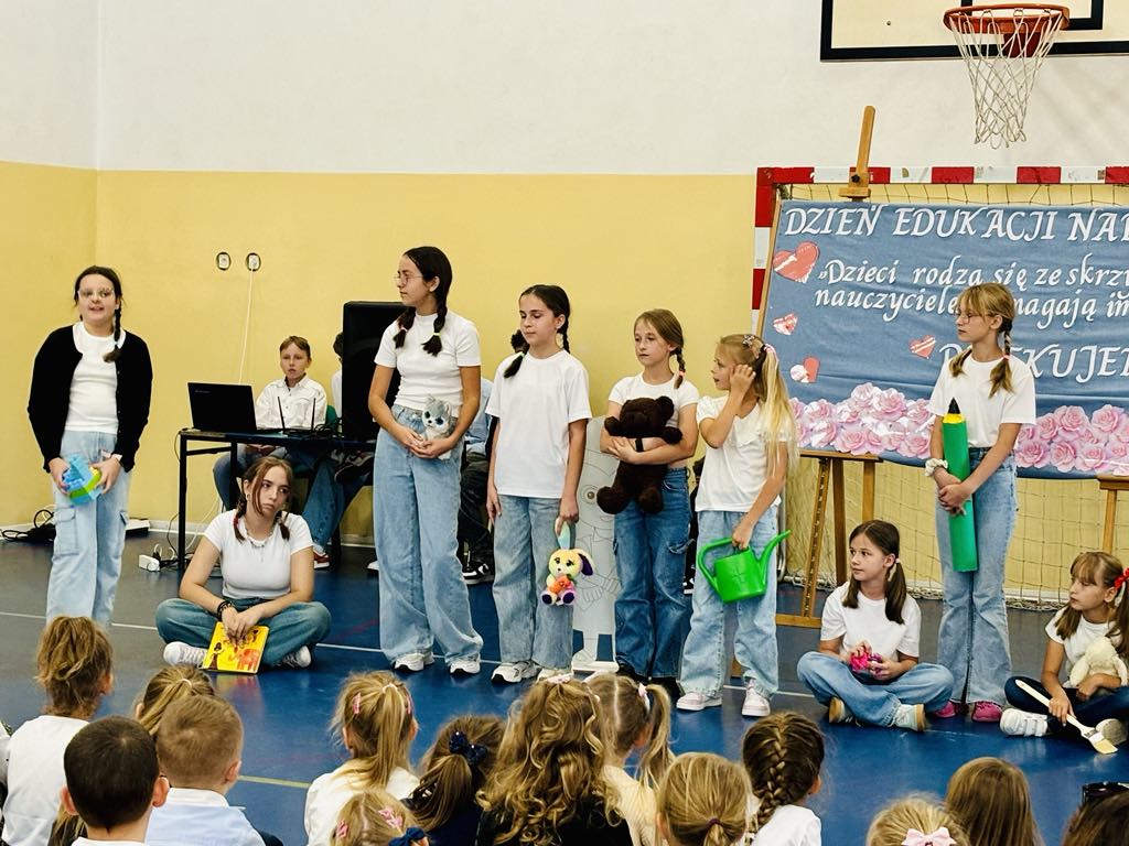 Dnia 11 października w naszej szkole odbyła się uroczystość z okazji Dnia Edukacji Narodowej. To szczególne wydarzenie zgromadziło nauczycieli, uczniów oraz pracowników oświaty, aby wspólnie celebrować ich trud i zaangażowanie w kształtowanie przyszłych pokoleń. Uroczystość rozpoczęła się przedstawieniem przygotowanym przez uczennice z kółka teatralnego oraz uczniów klasy VI pod kierunkiem pani Renaty Lipskiej oraz pani Elżbiety Manowieckiej. Ich talent i zaangażowanie dostarczyły wszystkim zebranym wielu wzruszeń oraz radości. Wokalną część występu zapewniła klasa 1b, która pod okiem swojej wychowawczyni, pani Katarzyny Wróblewskiej, zaprezentowała piosenkę dedykowaną nauczycielom i pracownikom oświaty. Uczniowie z entuzjazmem śpiewali, a ich występ spotkał się z gromkimi brawami.