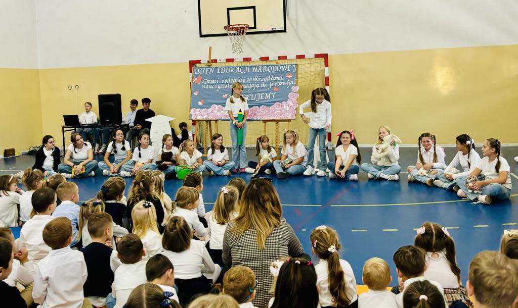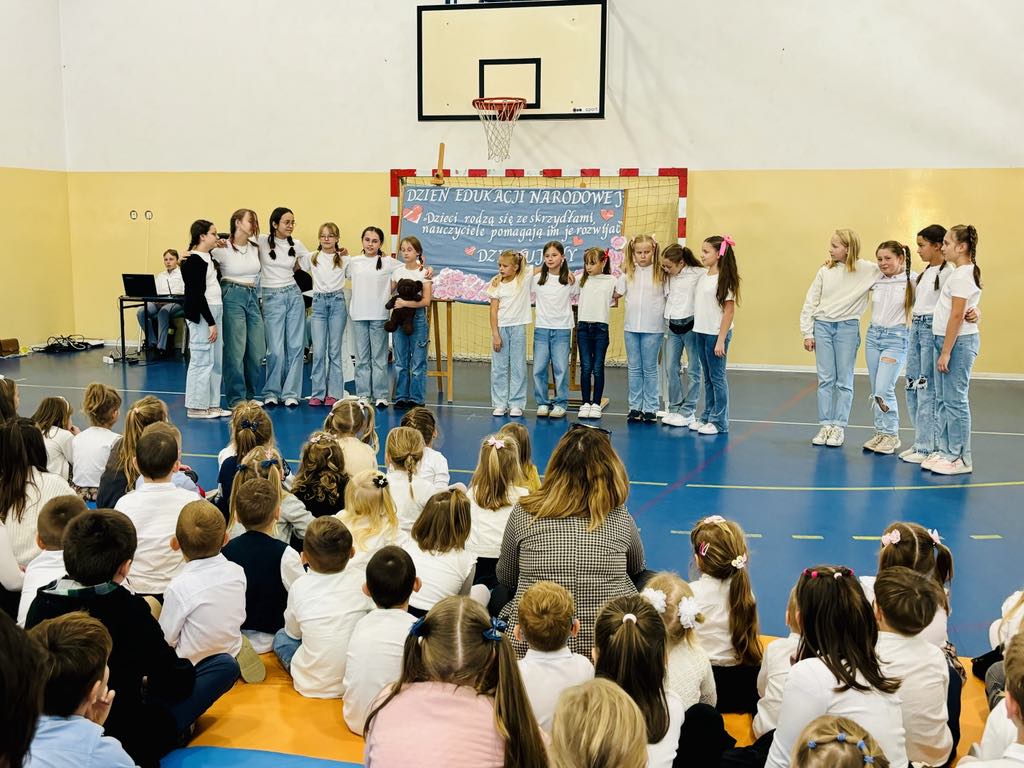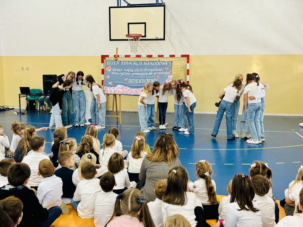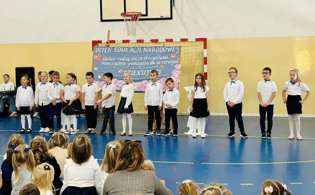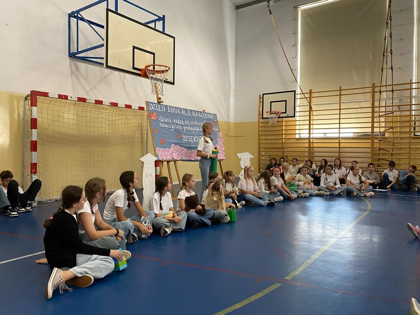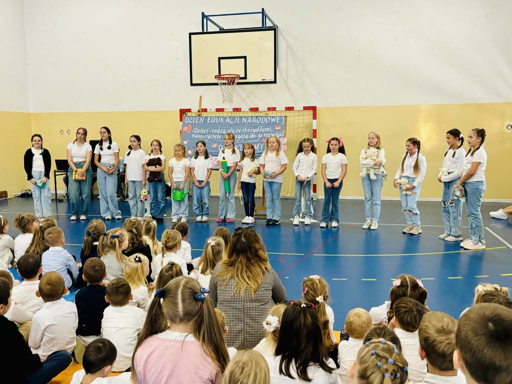 Dnia 11 października w naszej szkole odbyła się uroczystość z okazji Dnia Edukacji Narodowej. To szczególne wydarzenie zgromadziło nauczycieli, uczniów oraz pracowników oświaty, aby wspólnie celebrować ich trud i zaangażowanie w kształtowanie przyszłych pokoleń. Uroczystość rozpoczęła się przedstawieniem przygotowanym przez uczennice z kółka teatralnego oraz uczniów klasy VI pod kierunkiem pani Renaty Lipskiej oraz pani Elżbiety Manowieckiej. Ich talent i zaangażowanie dostarczyły wszystkim zebranym wielu wzruszeń oraz radości. Wokalną część występu zapewniła klasa 1b, która pod okiem swojej wychowawczyni, pani Katarzyny Wróblewskiej, zaprezentowała piosenkę dedykowaną nauczycielom i pracownikom oświaty. Uczniowie z entuzjazmem śpiewali, a ich występ spotkał się z gromkimi brawami.