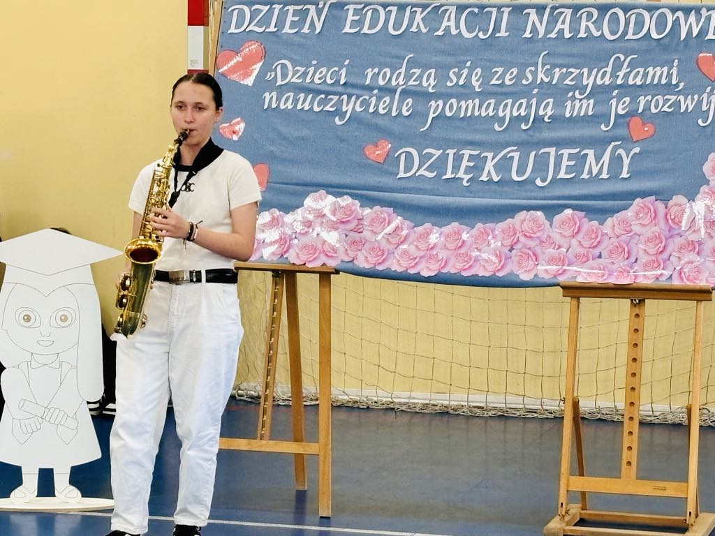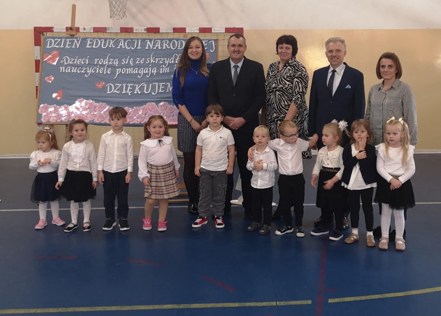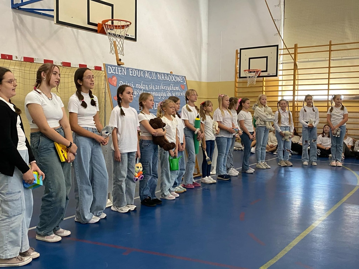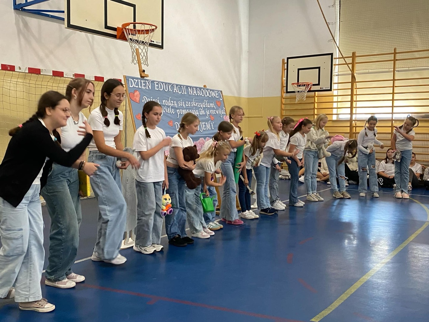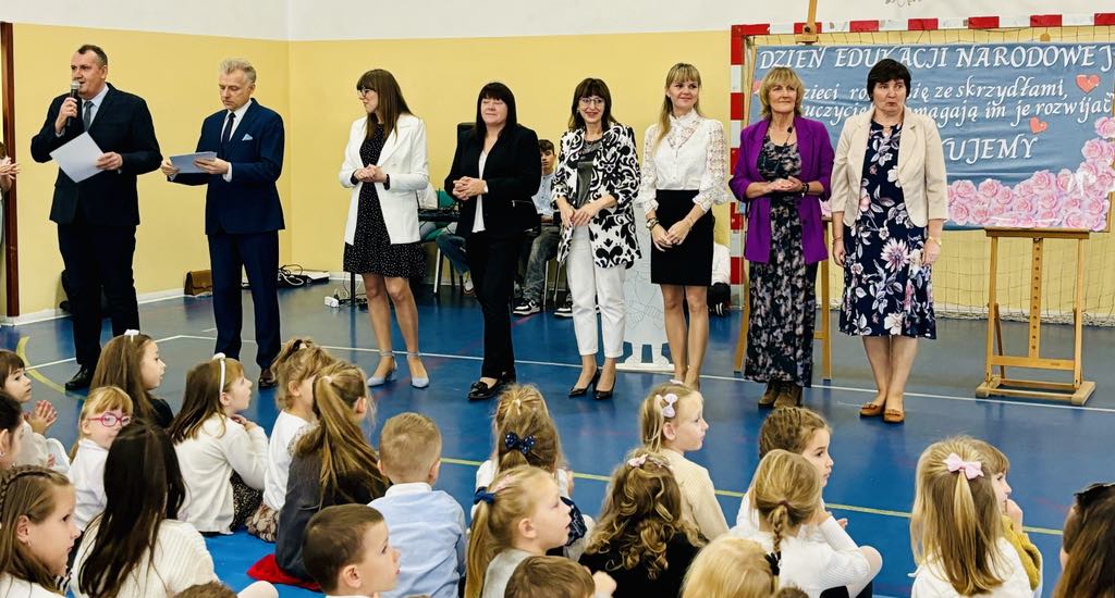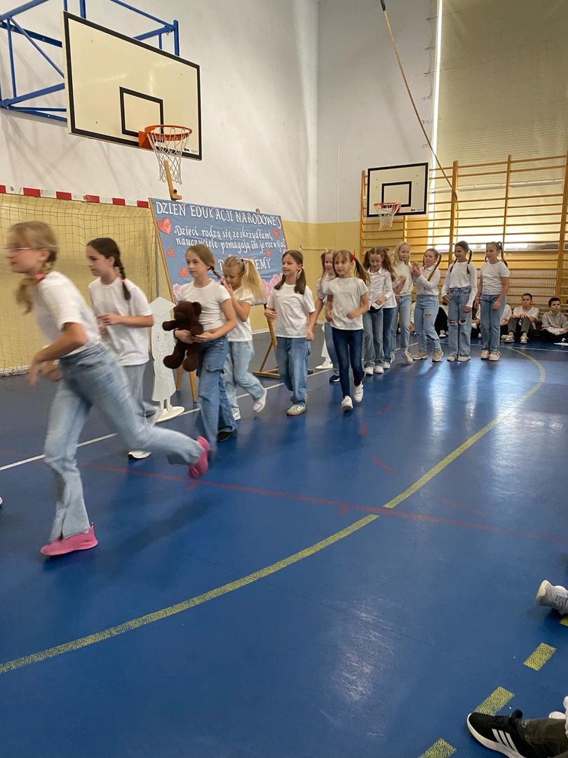 Dnia 11 października w naszej szkole odbyła się uroczystość z okazji Dnia Edukacji Narodowej. To szczególne wydarzenie zgromadziło nauczycieli, uczniów oraz pracowników oświaty, aby wspólnie celebrować ich trud i zaangażowanie w kształtowanie przyszłych pokoleń. Uroczystość rozpoczęła się przedstawieniem przygotowanym przez uczennice z kółka teatralnego oraz uczniów klasy VI pod kierunkiem pani Renaty Lipskiej oraz pani Elżbiety Manowieckiej. Ich talent i zaangażowanie dostarczyły wszystkim zebranym wielu wzruszeń oraz radości. Wokalną część występu zapewniła klasa 1b, która pod okiem swojej wychowawczyni, pani Katarzyny Wróblewskiej, zaprezentowała piosenkę dedykowaną nauczycielom i pracownikom oświaty. Uczniowie z entuzjazmem śpiewali, a ich występ spotkał się z gromkimi brawami.