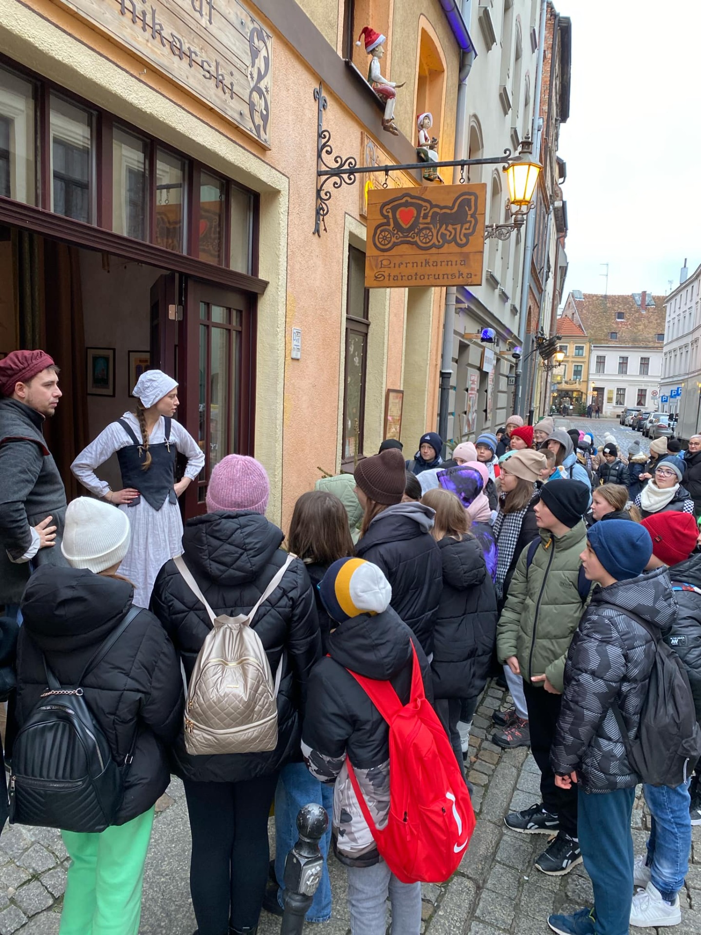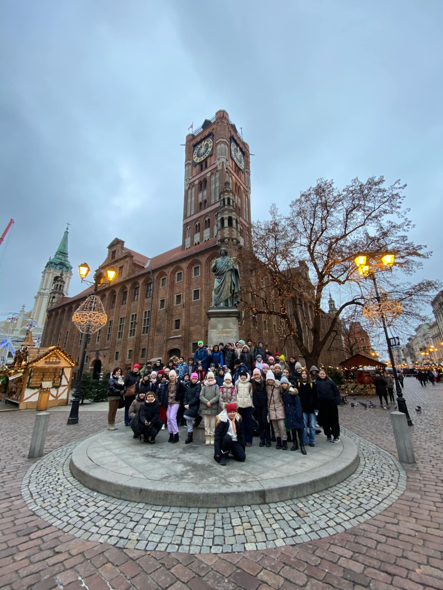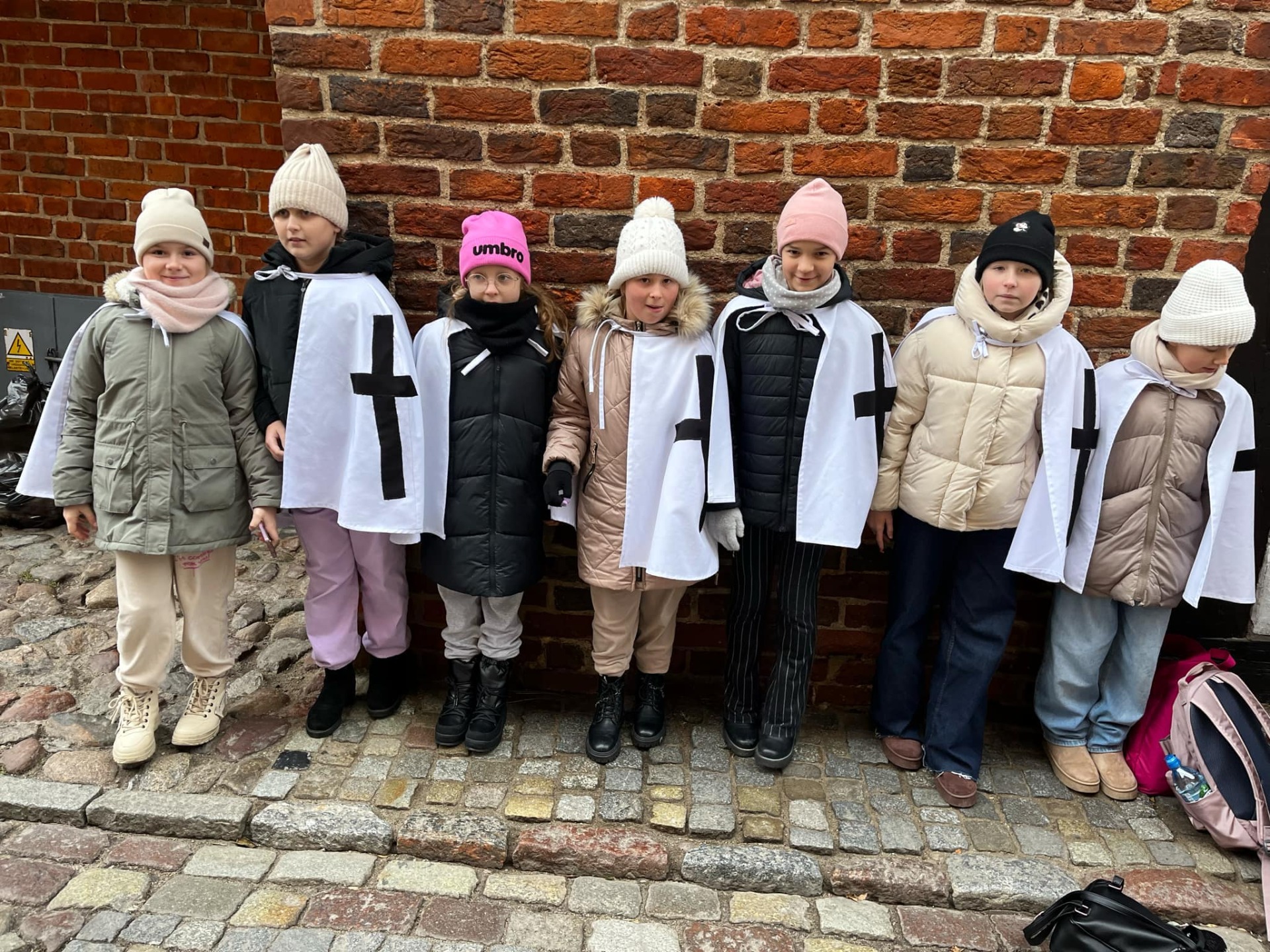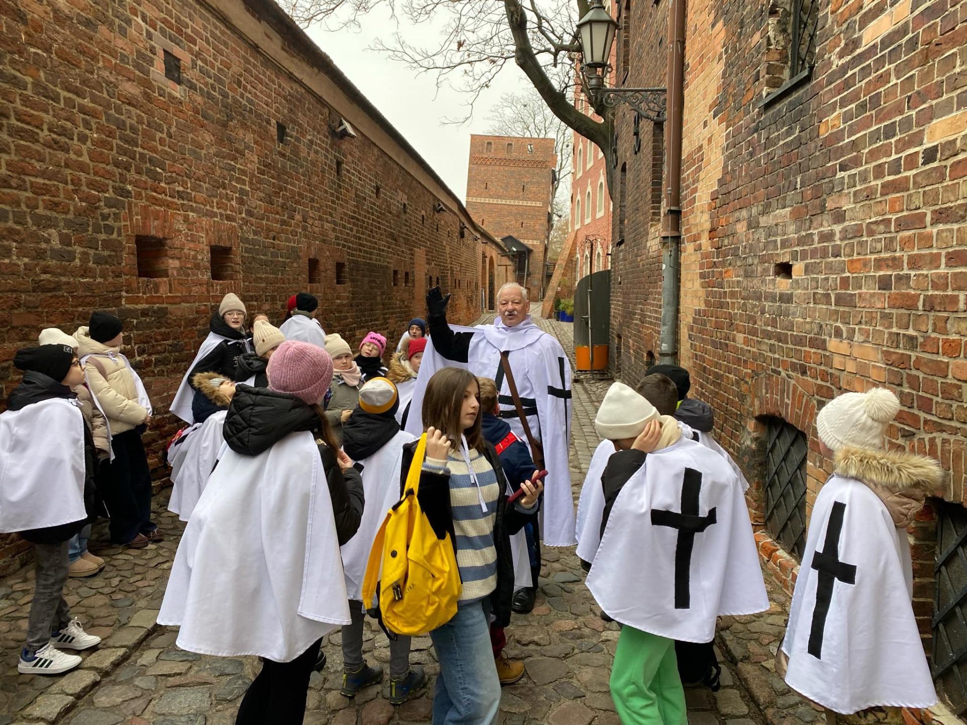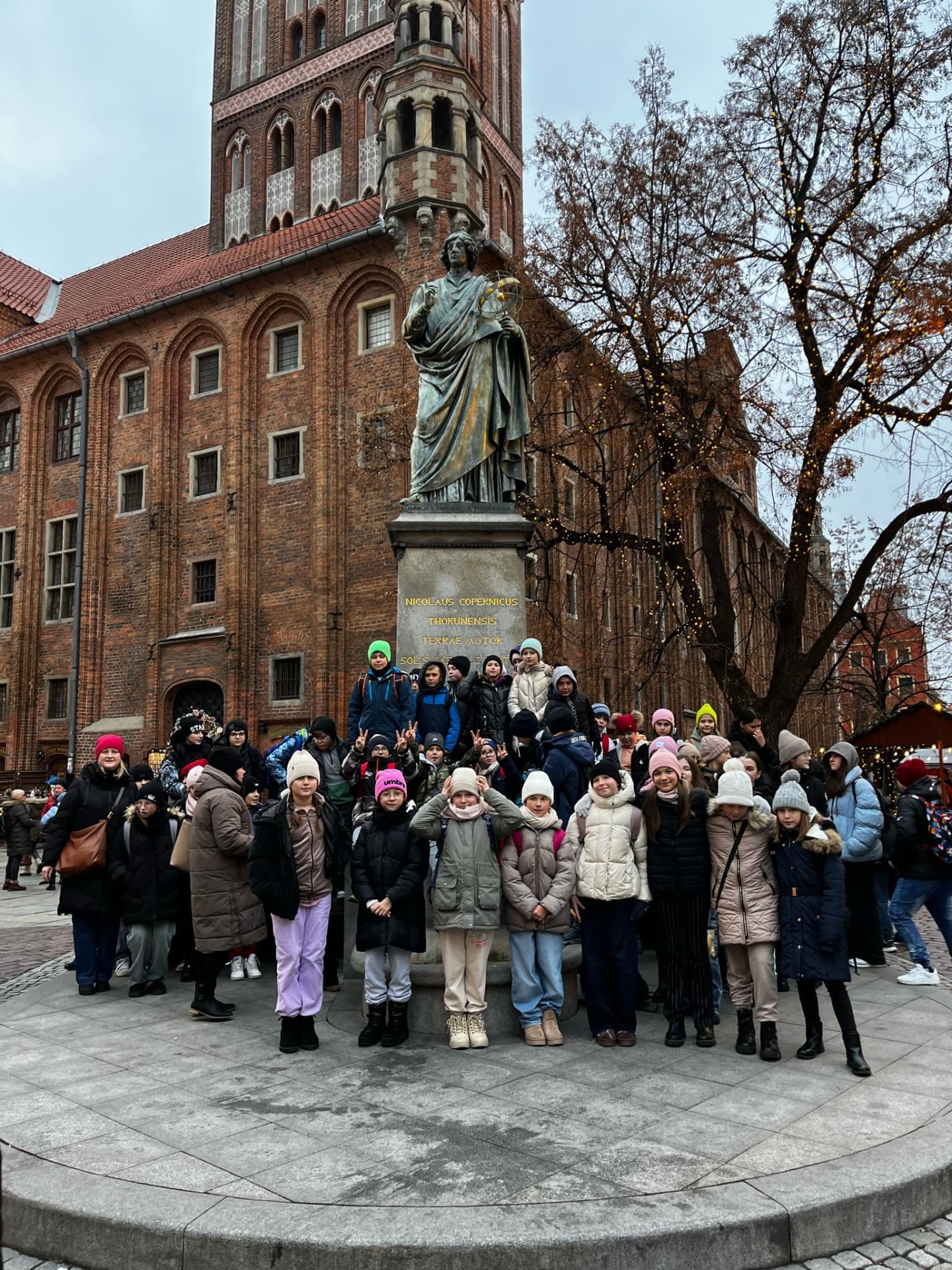 11 grudnia uczniowie klas IV-VI odwiedzili piękne miasto Toruń. Po spotkaniu z przewodnikami w dwóch grupach udali się na zwiedzanie przebrani w krzyżackie stroje. Podczas spaceru uliczkami miasta poznali Toruń z epoki średniowiecza. Usłyszeli anegdoty i przypowieści z codziennego życia torunian, zobaczyli Katedrę św. Janów, Dom Mikołaja Kopernika, Krzywą Wieżę, Rynek Staromiejski z gotyckim Ratuszem i pomnikiem Kopernika.Mieli okazję zobaczyć również pracę aktorów: p. Olgi Bołądź, p. Barbary Kurdej-Szatan podczas nagrywania scen do filmu „Piernikowe serce” w reżyserii Piotra Wereśniaka. Minęli również znanego dziennikarza, kucharza i podróżnika p. Roberta Makłowicza. Po zakończeniu zwiedzania odpoczęli w wygodnych fotelach w sali Planetarium i obejrzeli seans „Zostać astronomem”. Po seansie mogli kupić pamiątki, pierniki i pooglądać stoiska Jarmarku Bozonarodzeniowego. Głównym punktem wyjazdu były odwiedziny w Piekarni Starotoruńskiej. Podczas pokazu i zajęć poznali historię wypiekania pierników, a także mogli samodzielnie przygotować te słodkie ciastka i po upieczeniu zabrać do domu.W drodze powrotnej nie mogło oczywiście zabraknąć pobytu w restauracji McDonald’s. Podczas jazdy autokarem uczniowie śpiewali kolędy i ulubione piosenki. Zadowoleni i zmęczeni podróżą o godzinie 19.00 spotkali się pod szkołą z rodzicami.