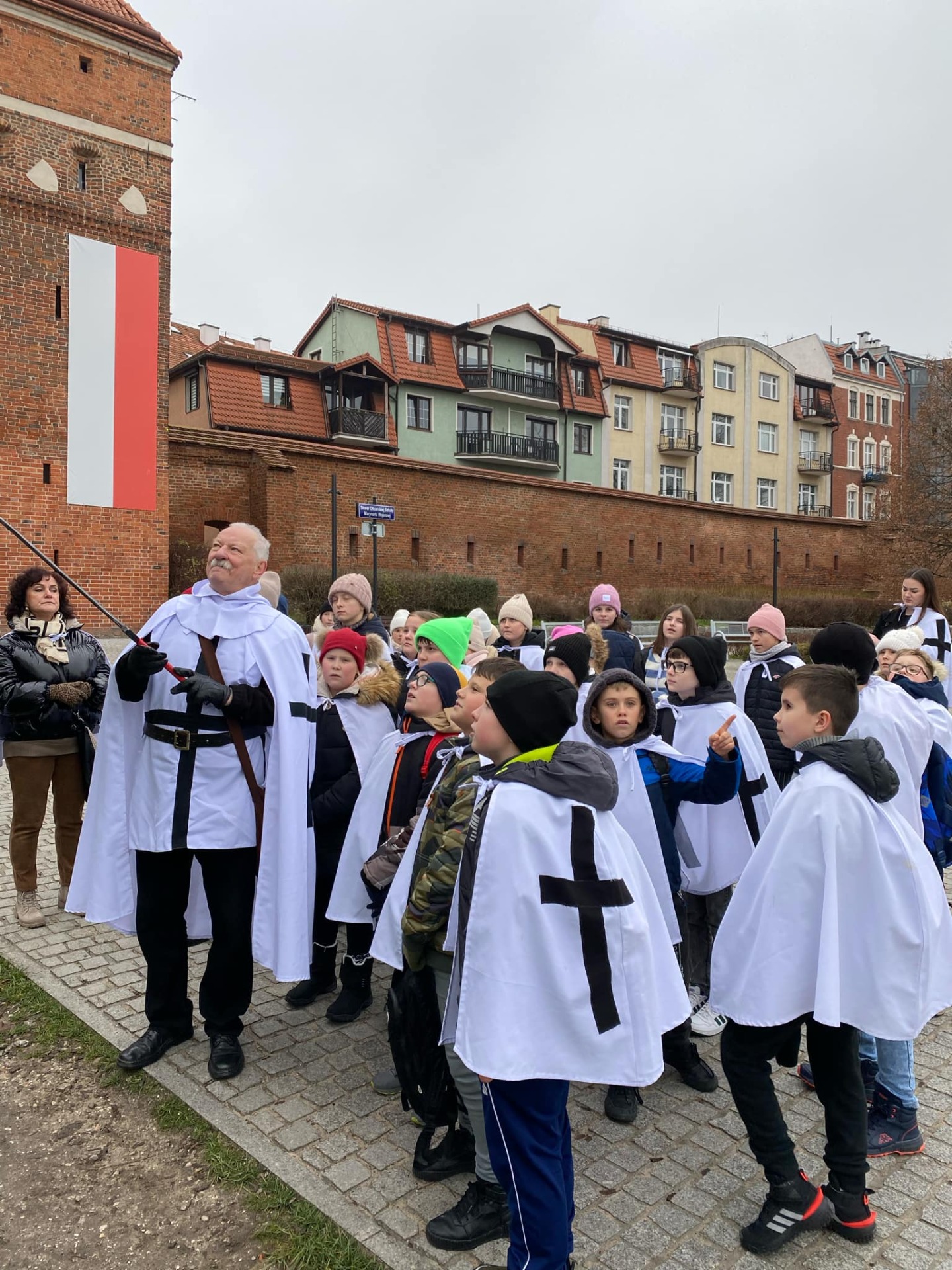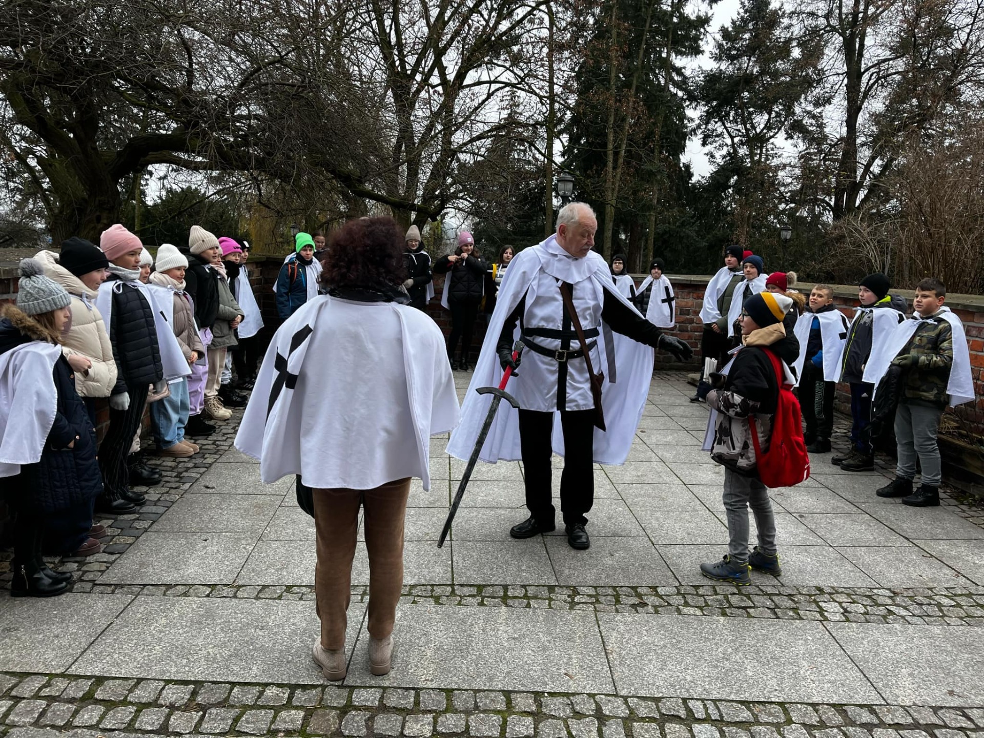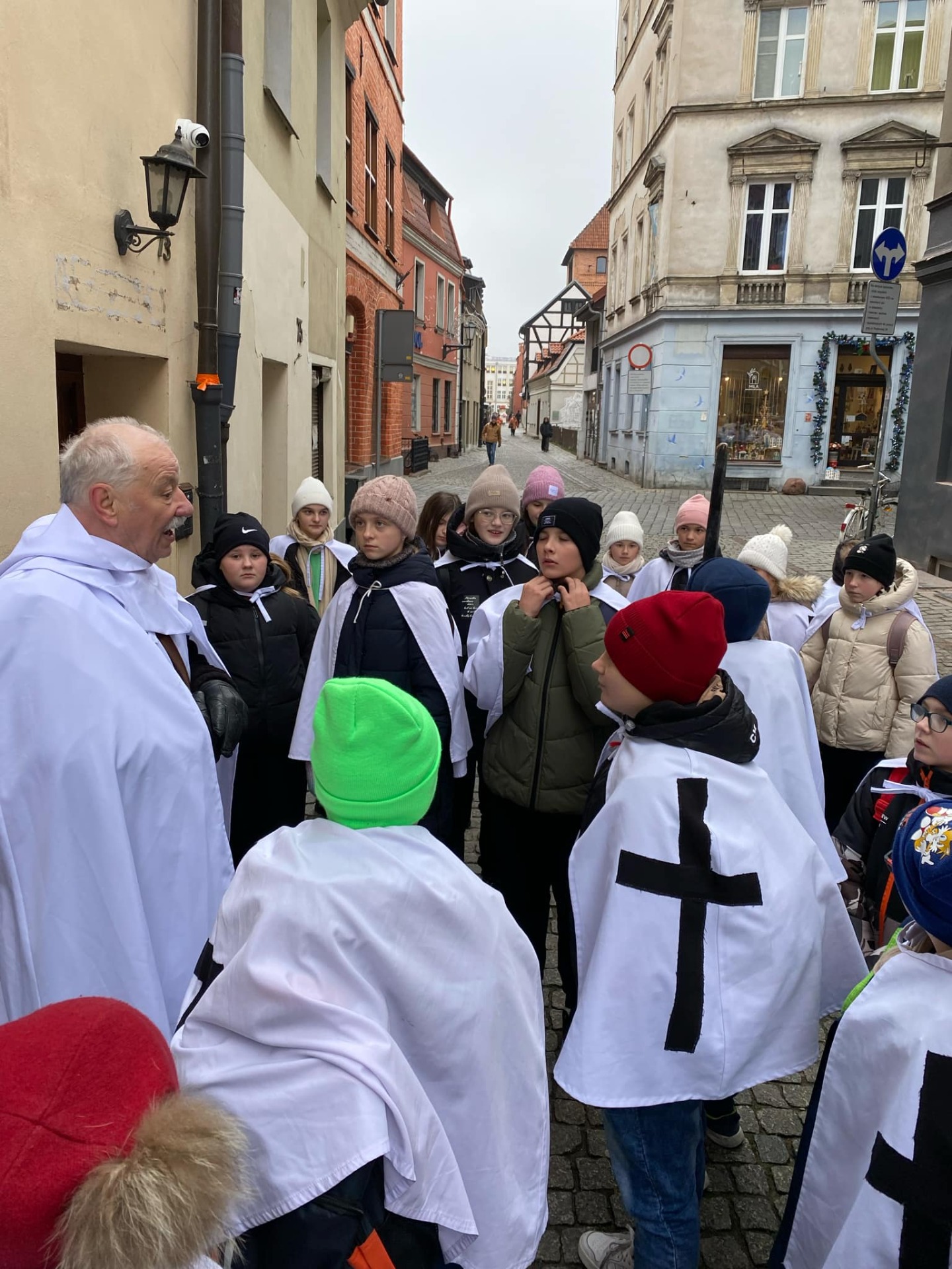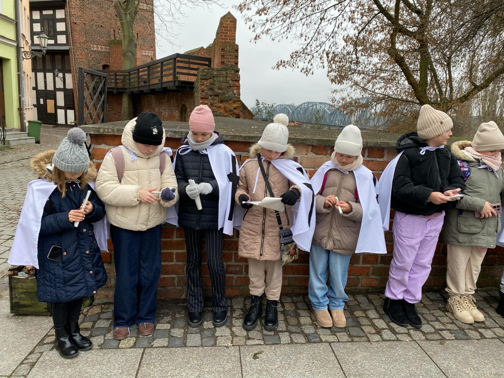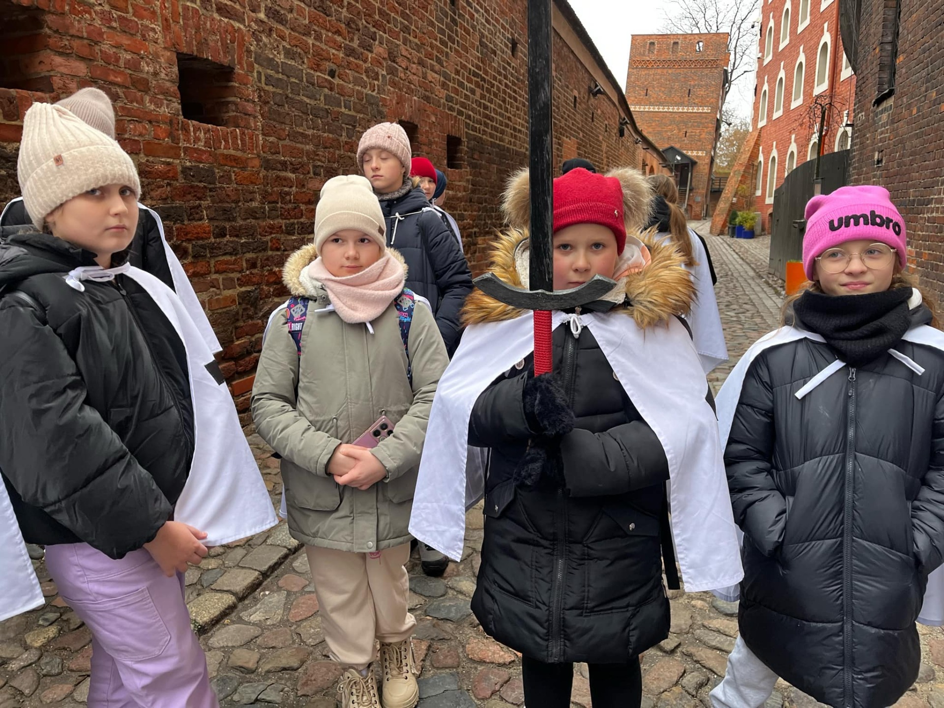 11 grudnia uczniowie klas IV-VI odwiedzili piękne miasto Toruń. Po spotkaniu z przewodnikami w dwóch grupach udali się na zwiedzanie przebrani w krzyżackie stroje. Podczas spaceru uliczkami miasta poznali Toruń z epoki średniowiecza. Usłyszeli anegdoty i przypowieści z codziennego życia torunian, zobaczyli Katedrę św. Janów, Dom Mikołaja Kopernika, Krzywą Wieżę, Rynek Staromiejski z gotyckim Ratuszem i pomnikiem Kopernika.Mieli okazję zobaczyć również pracę aktorów: p. Olgi Bołądź, p. Barbary Kurdej-Szatan podczas nagrywania scen do filmu „Piernikowe serce” w reżyserii Piotra Wereśniaka. Minęli również znanego dziennikarza, kucharza i podróżnika p. Roberta Makłowicza. Po zakończeniu zwiedzania odpoczęli w wygodnych fotelach w sali Planetarium i obejrzeli seans „Zostać astronomem”. Po seansie mogli kupić pamiątki, pierniki i pooglądać stoiska Jarmarku Bozonarodzeniowego. Głównym punktem wyjazdu były odwiedziny w Piekarni Starotoruńskiej. Podczas pokazu i zajęć poznali historię wypiekania pierników, a także mogli samodzielnie przygotować te słodkie ciastka i po upieczeniu zabrać do domu.W drodze powrotnej nie mogło oczywiście zabraknąć pobytu w restauracji McDonald’s. Podczas jazdy autokarem uczniowie śpiewali kolędy i ulubione piosenki. Zadowoleni i zmęczeni podróżą o godzinie 19.00 spotkali się pod szkołą z rodzicami.