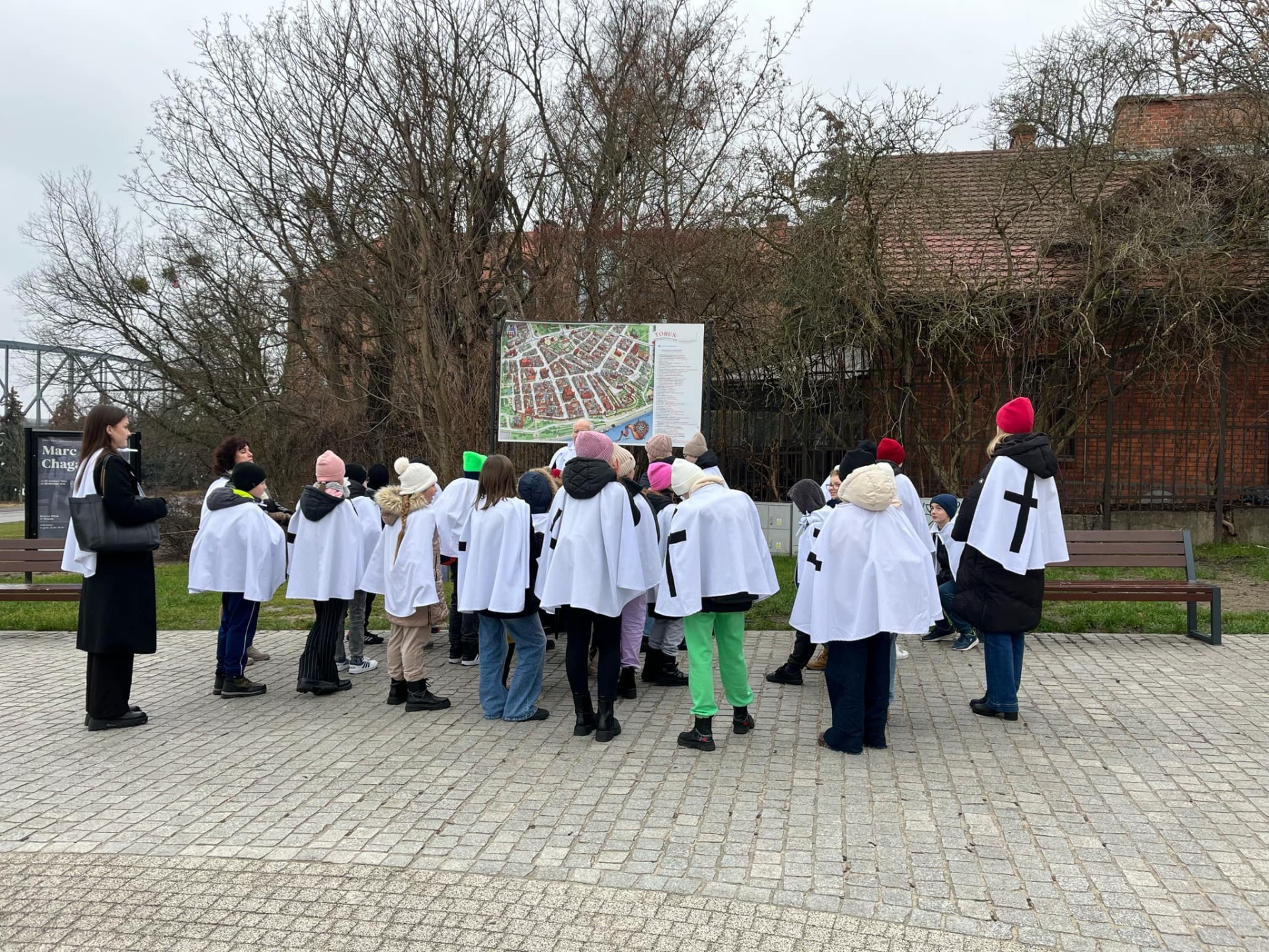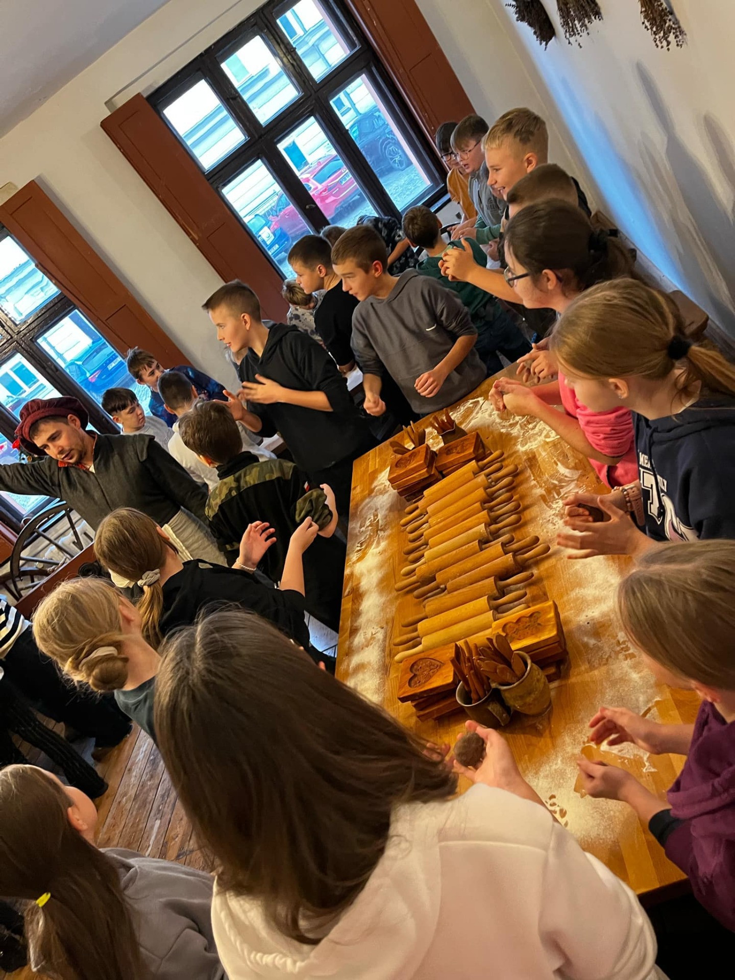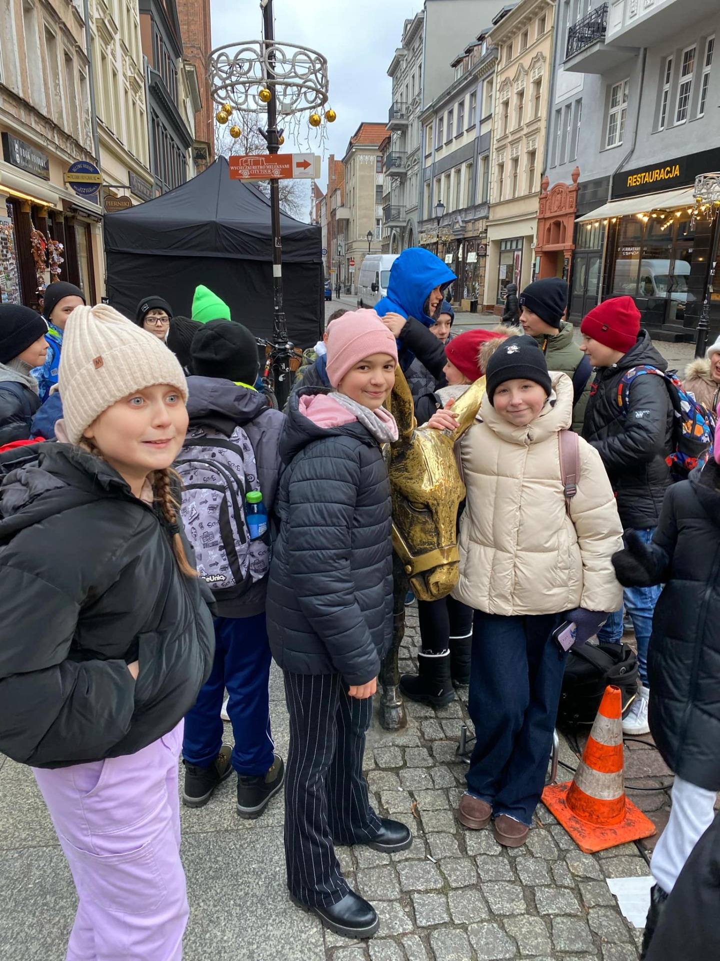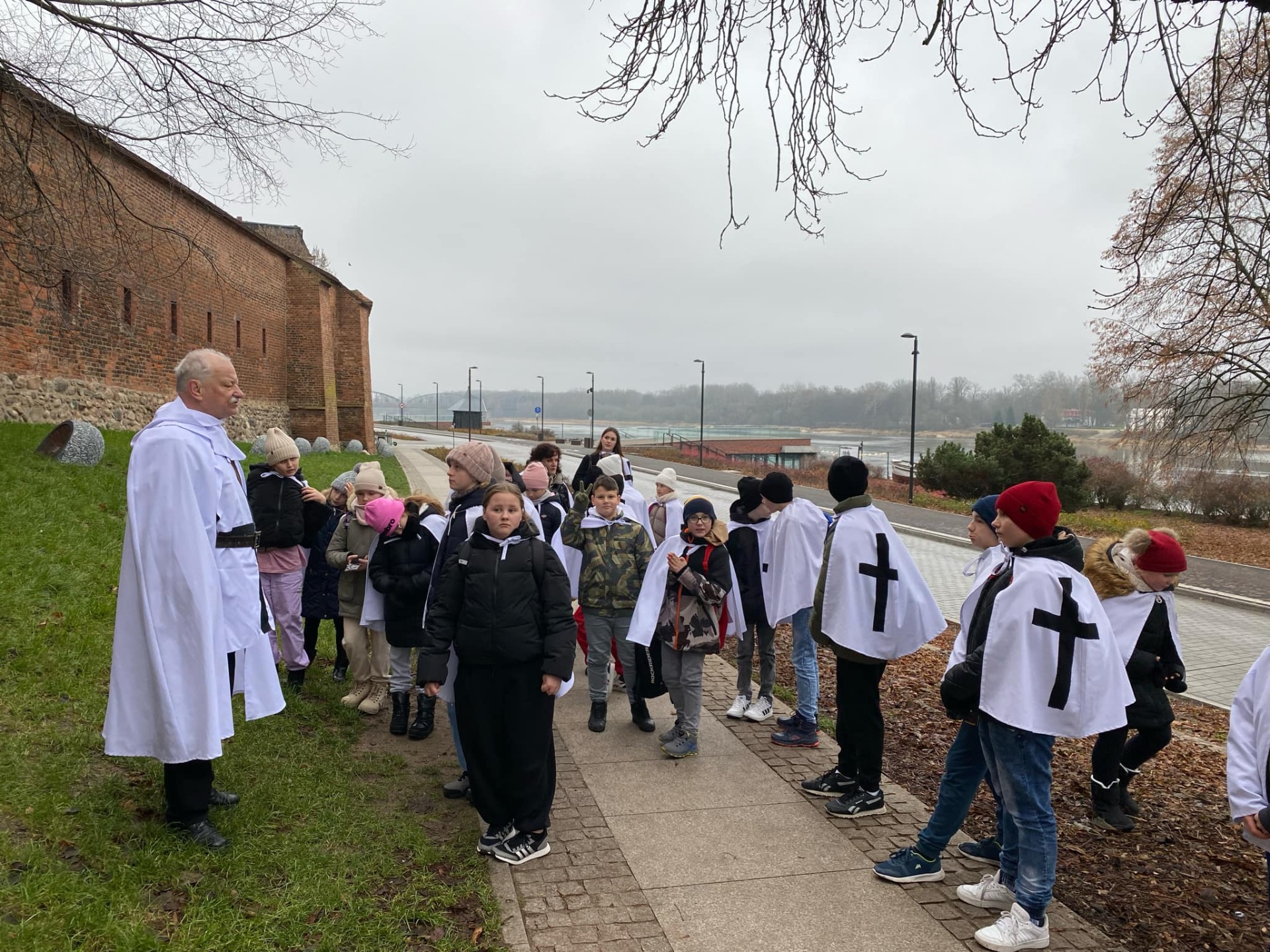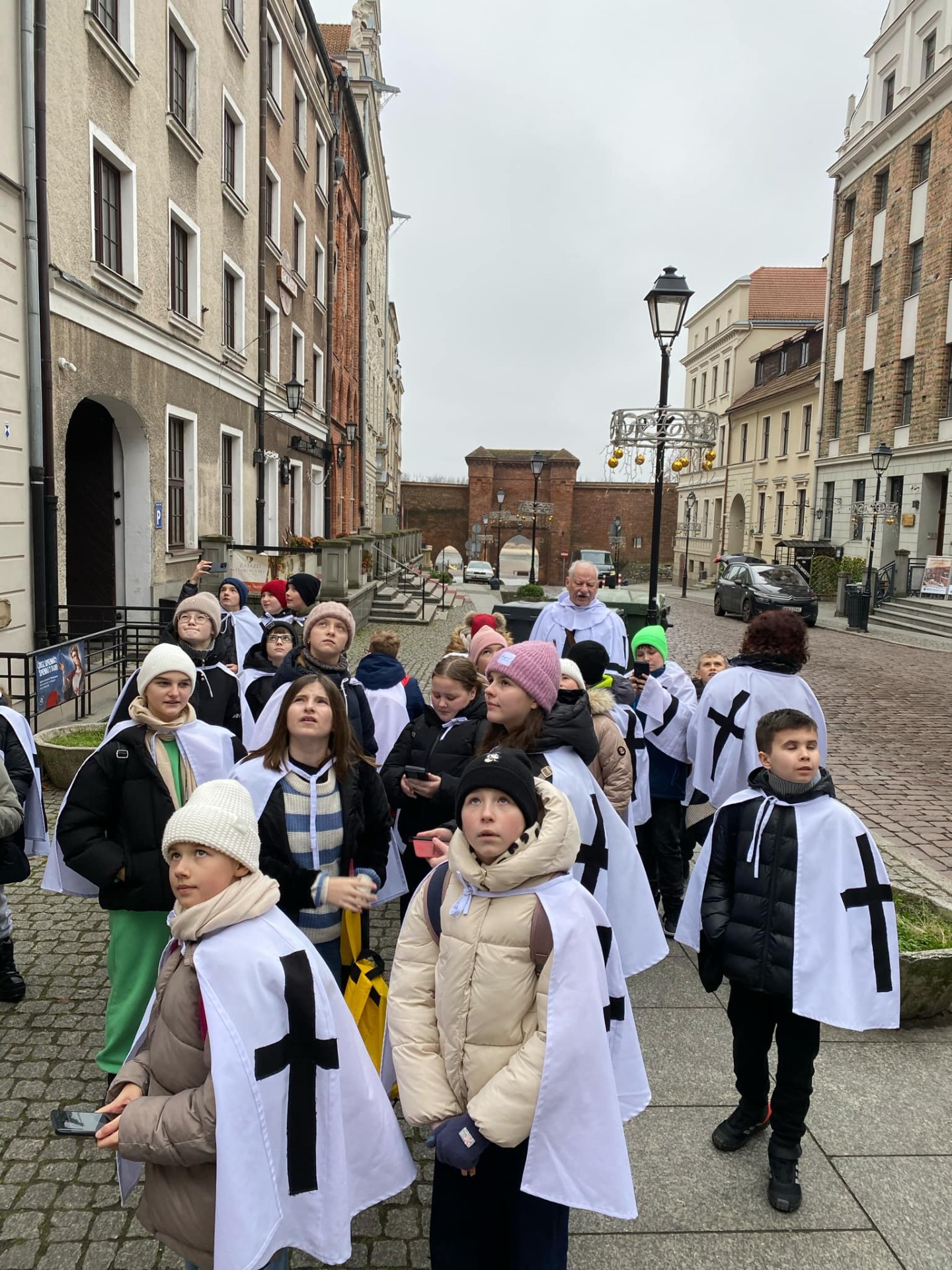 11 grudnia uczniowie klas IV-VI odwiedzili piękne miasto Toruń. Po spotkaniu z przewodnikami w dwóch grupach udali się na zwiedzanie przebrani w krzyżackie stroje. Podczas spaceru uliczkami miasta poznali Toruń z epoki średniowiecza. Usłyszeli anegdoty i przypowieści z codziennego życia torunian, zobaczyli Katedrę św. Janów, Dom Mikołaja Kopernika, Krzywą Wieżę, Rynek Staromiejski z gotyckim Ratuszem i pomnikiem Kopernika.Mieli okazję zobaczyć również pracę aktorów: p. Olgi Bołądź, p. Barbary Kurdej-Szatan podczas nagrywania scen do filmu „Piernikowe serce” w reżyserii Piotra Wereśniaka. Minęli również znanego dziennikarza, kucharza i podróżnika p. Roberta Makłowicza. Po zakończeniu zwiedzania odpoczęli w wygodnych fotelach w sali Planetarium i obejrzeli seans „Zostać astronomem”. Po seansie mogli kupić pamiątki, pierniki i pooglądać stoiska Jarmarku Bozonarodzeniowego. Głównym punktem wyjazdu były odwiedziny w Piekarni Starotoruńskiej. Podczas pokazu i zajęć poznali historię wypiekania pierników, a także mogli samodzielnie przygotować te słodkie ciastka i po upieczeniu zabrać do domu.W drodze powrotnej nie mogło oczywiście zabraknąć pobytu w restauracji McDonald’s. Podczas jazdy autokarem uczniowie śpiewali kolędy i ulubione piosenki. Zadowoleni i zmęczeni podróżą o godzinie 19.00 spotkali się pod szkołą z rodzicami.